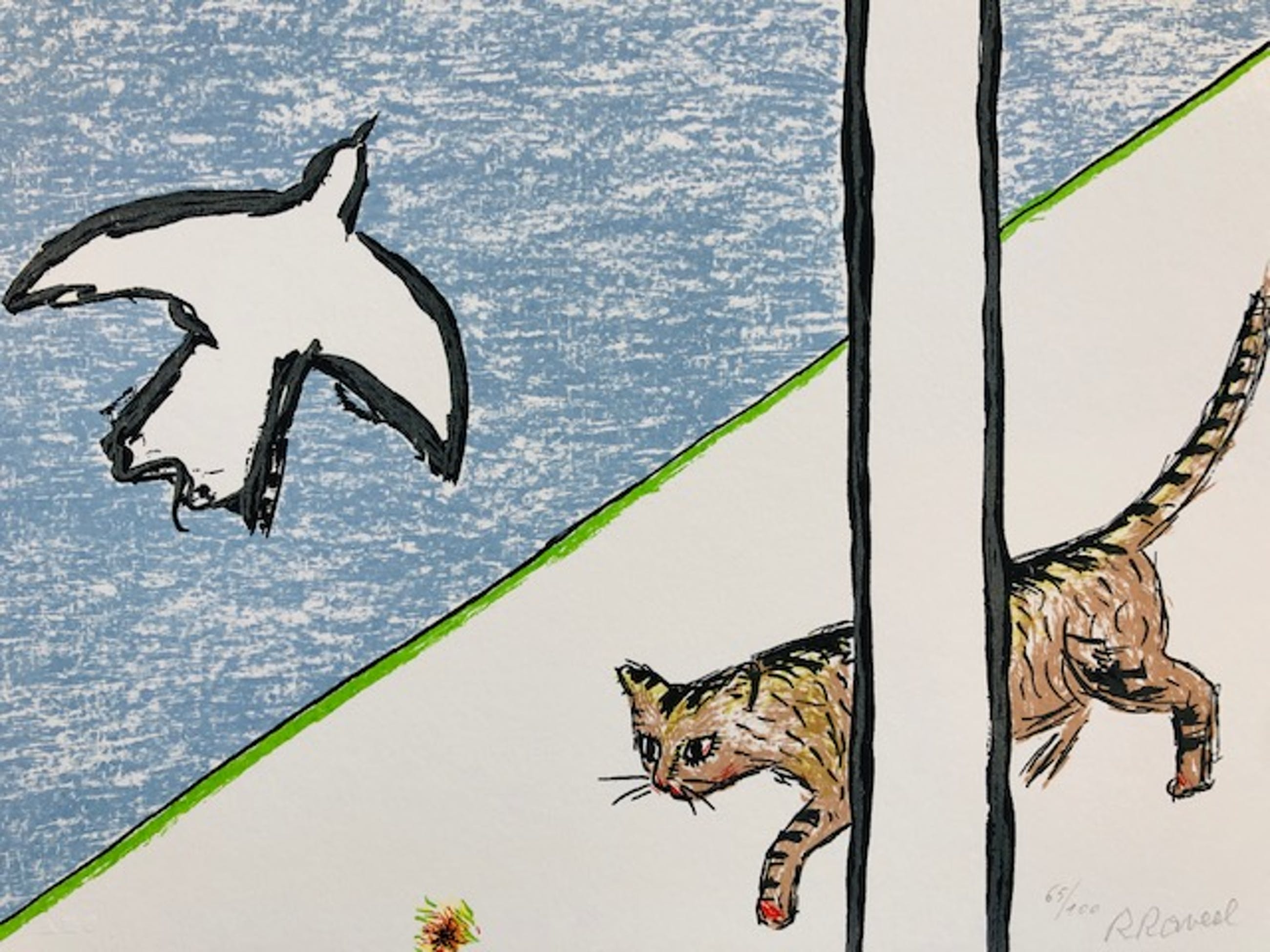 Fraaie en complete map met zes zeefdrukken waar de katten van Raveel de hoofdrol spelen. De werken zitten in een map met het gedicht KAT van Roland Jooris en een introductietekst van Octave Scheire. De zes zeefdrukken (drie liggend en drie opstaand) zijn allemaal genummerd en gesigneerd door de kunstenaar zelf. U bent welkom op afspraak om de werken zelf te komen beoordelen in de schatkamer van galerie Rotor in Gorinchem (Nederland). Ook kunnen wij uw inlijstingen verzorgen.