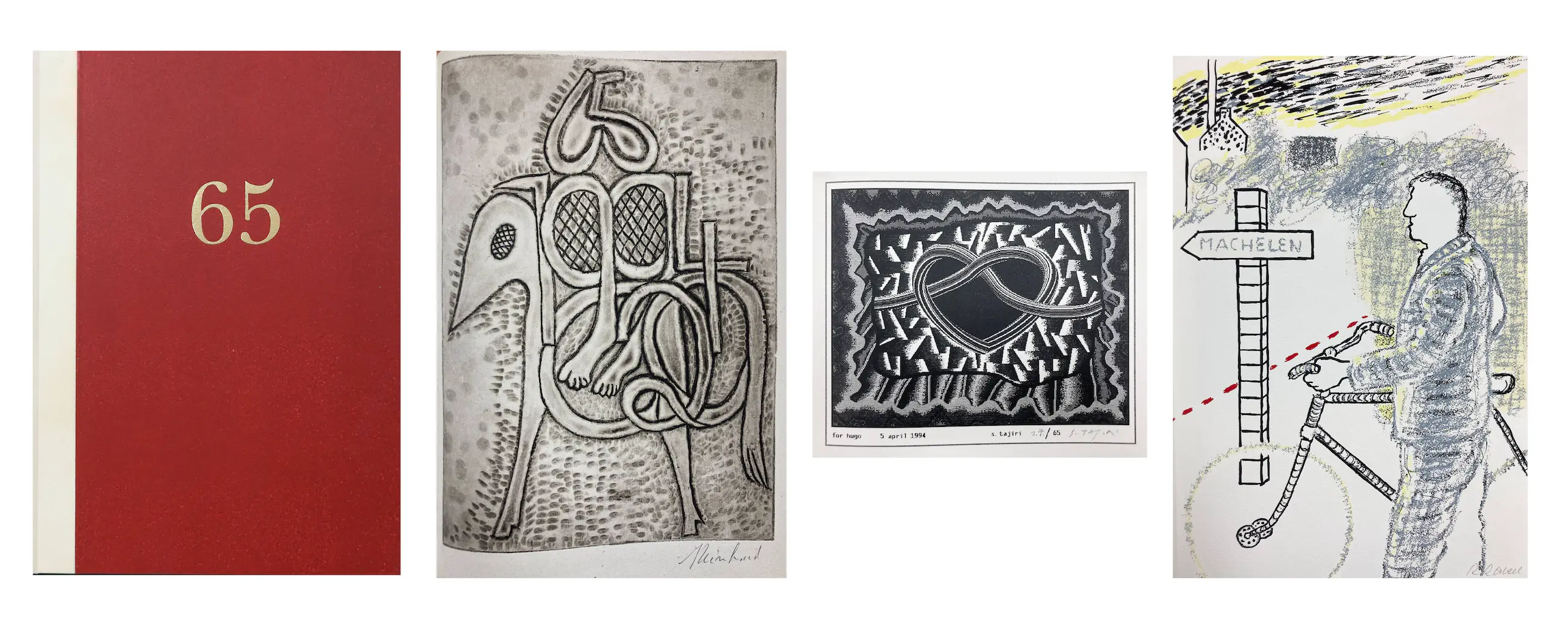 AMO-uitgave ter ere van de 65e verjaardag van Hugo Claus. Met gesigneerde bijdragen van Roger Raveel (kleurenlitho), Reinhoud (ets) en Shinkichi Tajiri.