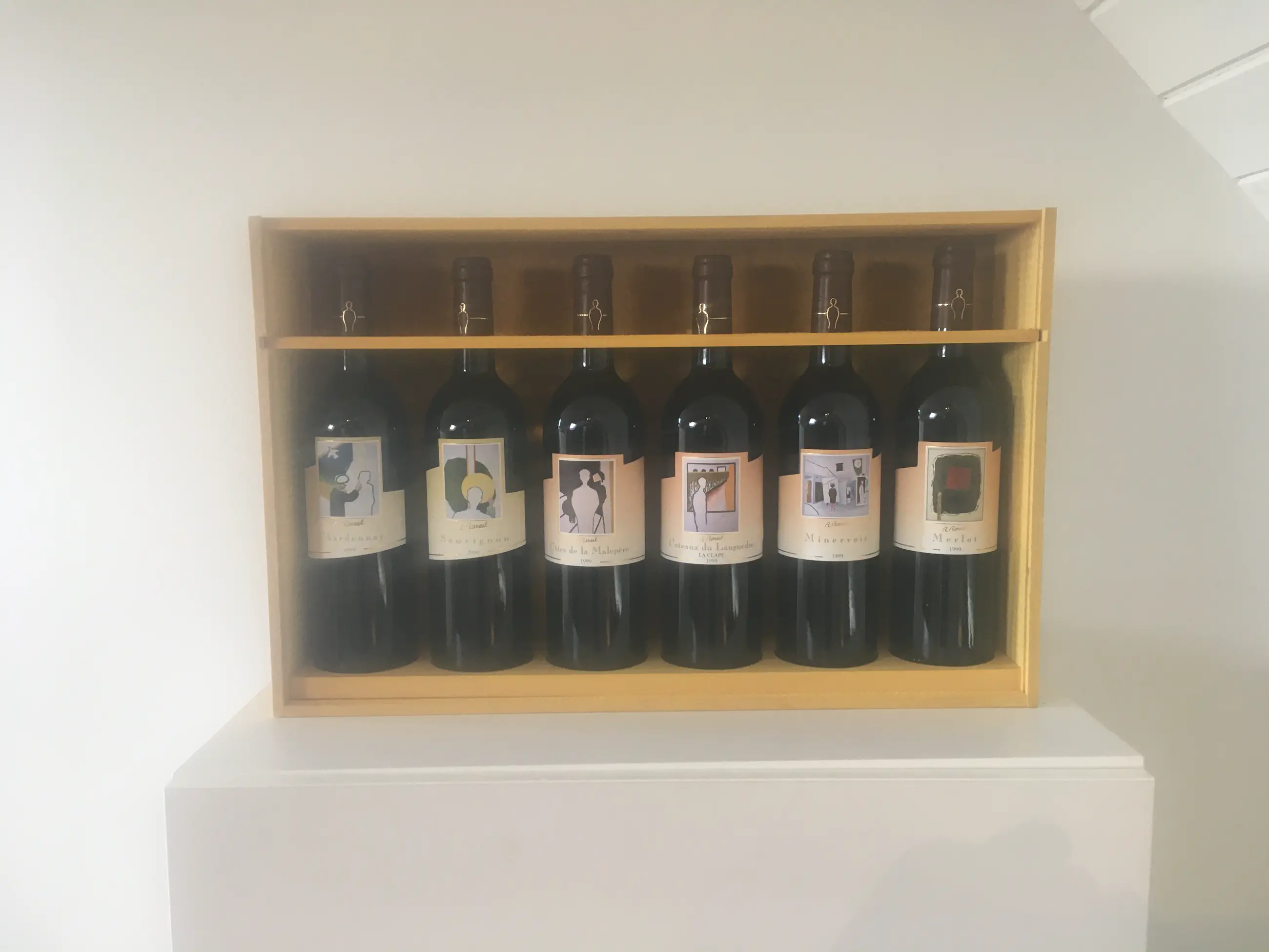 Op de etiketten is telkens een werk van roger raveel afgebeeld en op de achterkant bijhorende uitleg overeenkomstig met het werk.