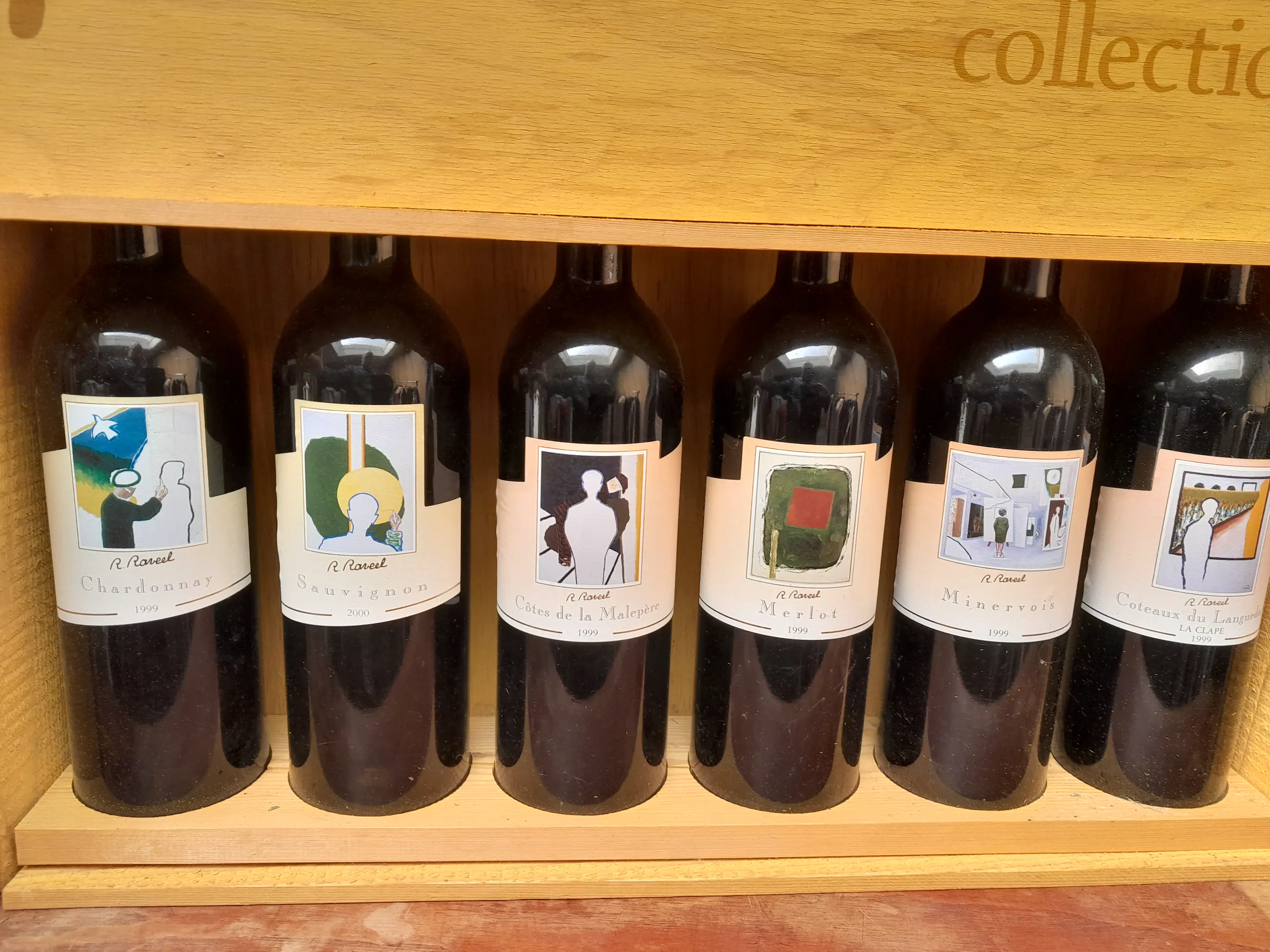 Elke fles bevat een ticket met een werk van deze kunstenaar. Rode wijn: 1999 Côtes de la Malepere 1999 Merlot Vin de Pays d’Oc 1999 Minervois 1999 La Clape, Côteaux du Languedoc