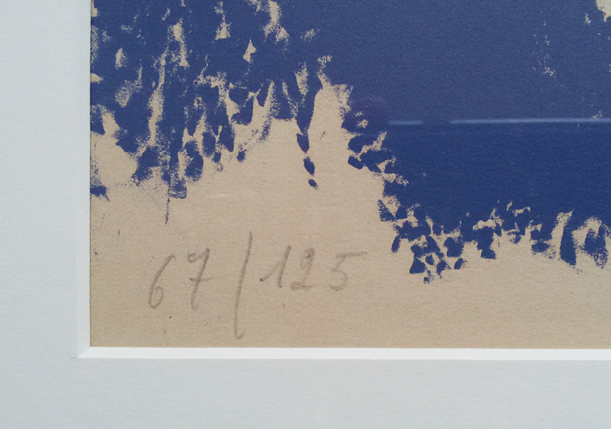 Mooi, herkenbaar werk van Roger Somville. Litho op papier, met potlood gesigneerd en genummerd (67/125). In zeer solide aluminium lijst (firma Schleiper & Fils, Brussel), achter glas en met smetteloos, zuurvrij passe-partout. In zeer goede conditie.