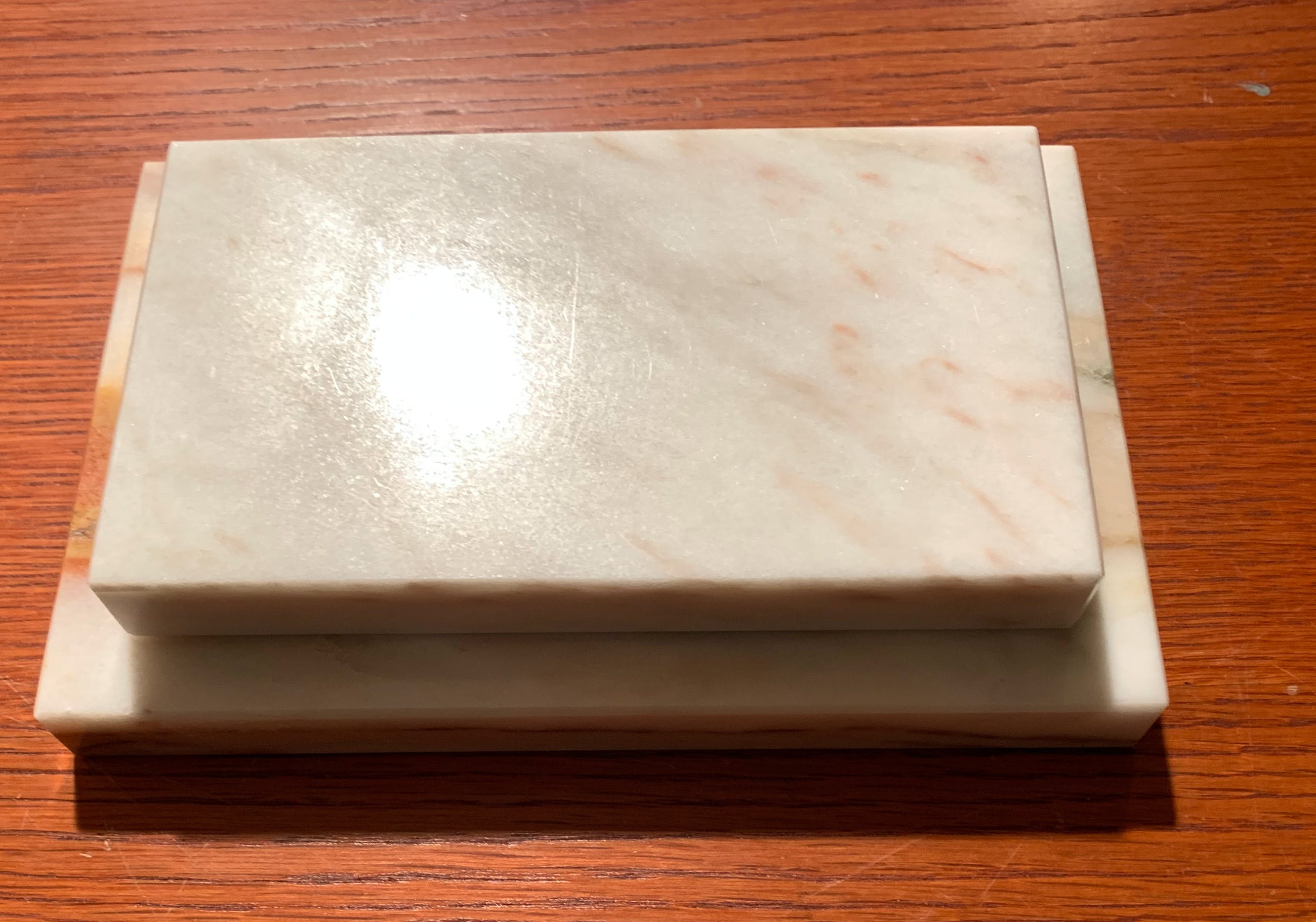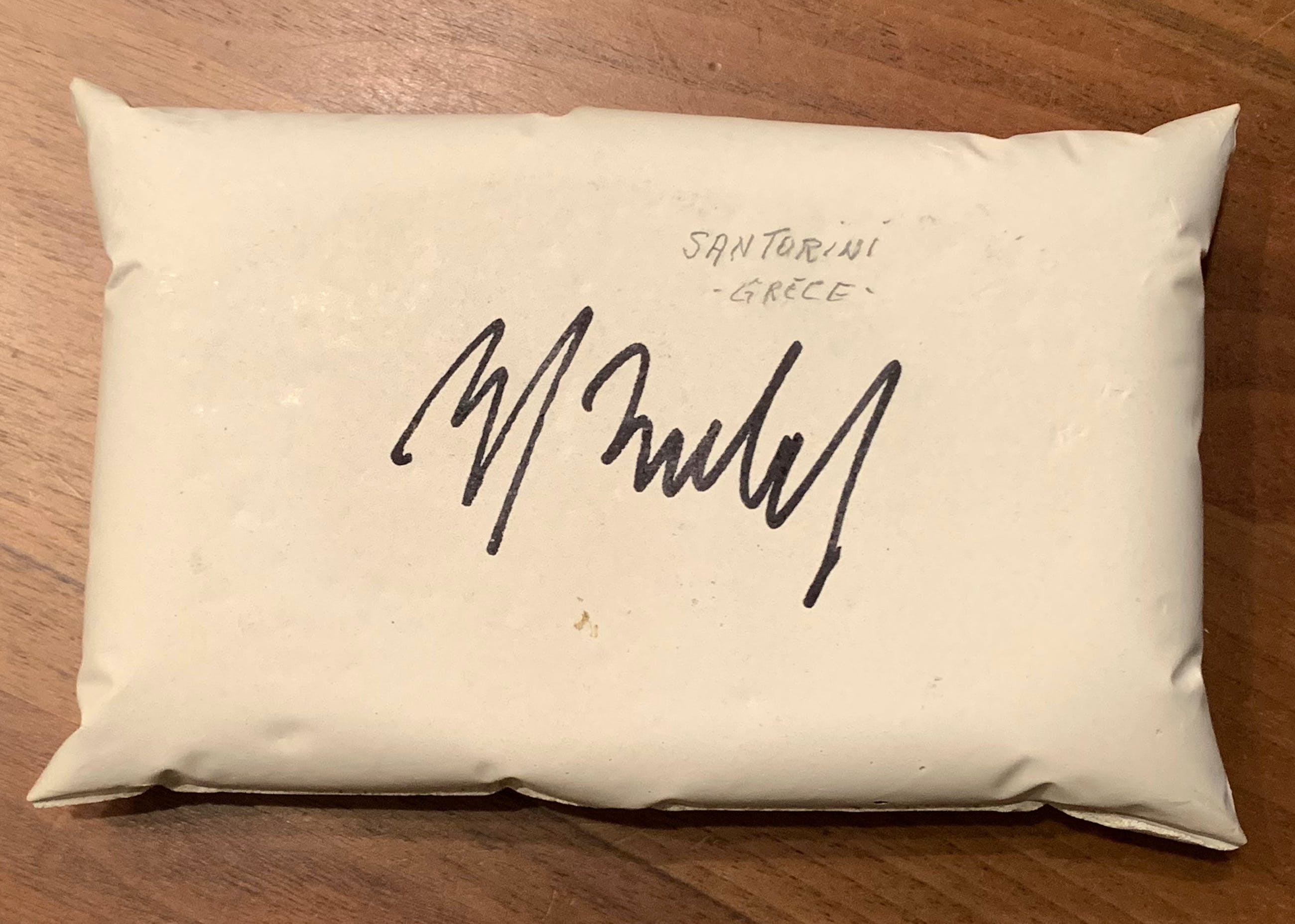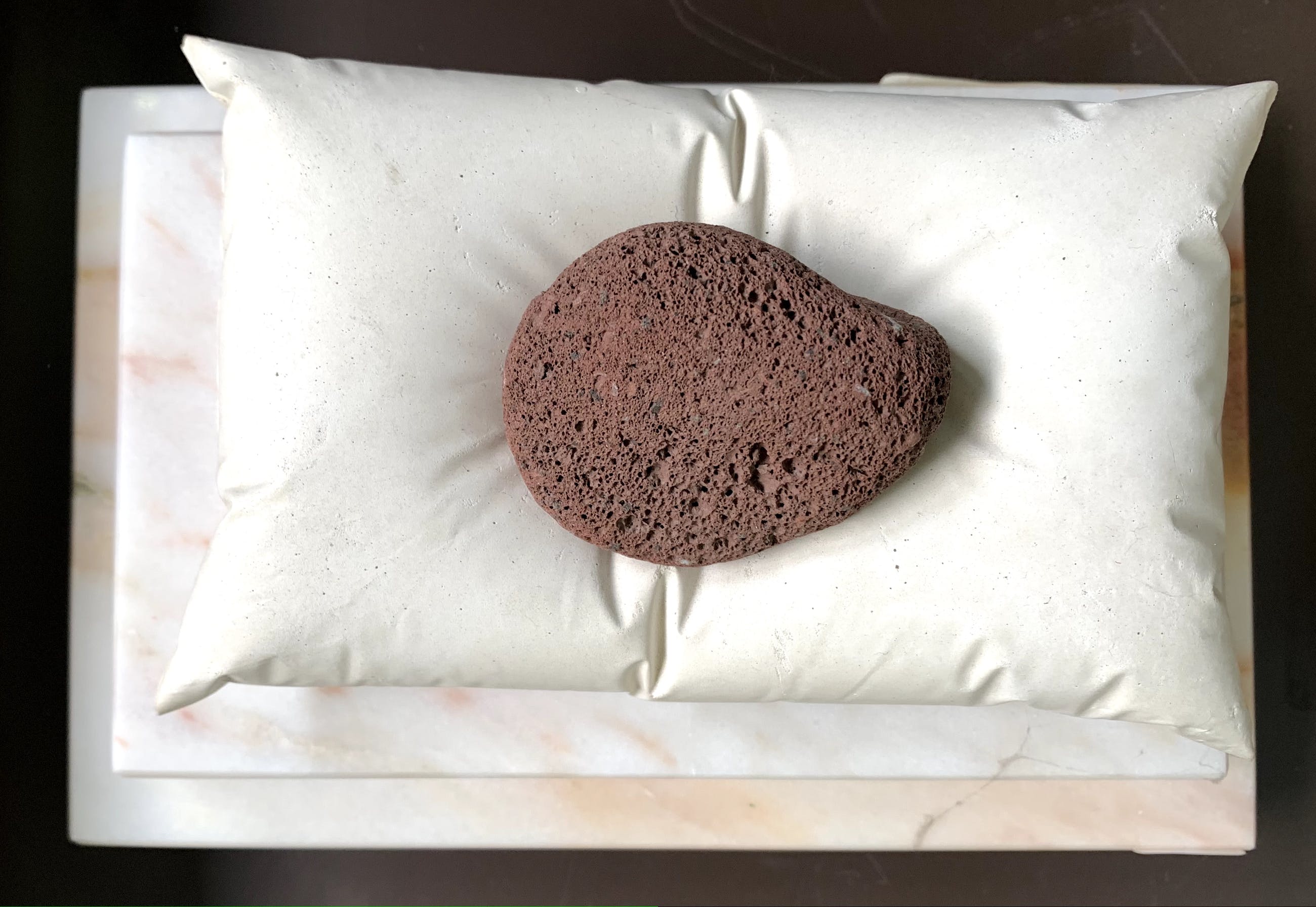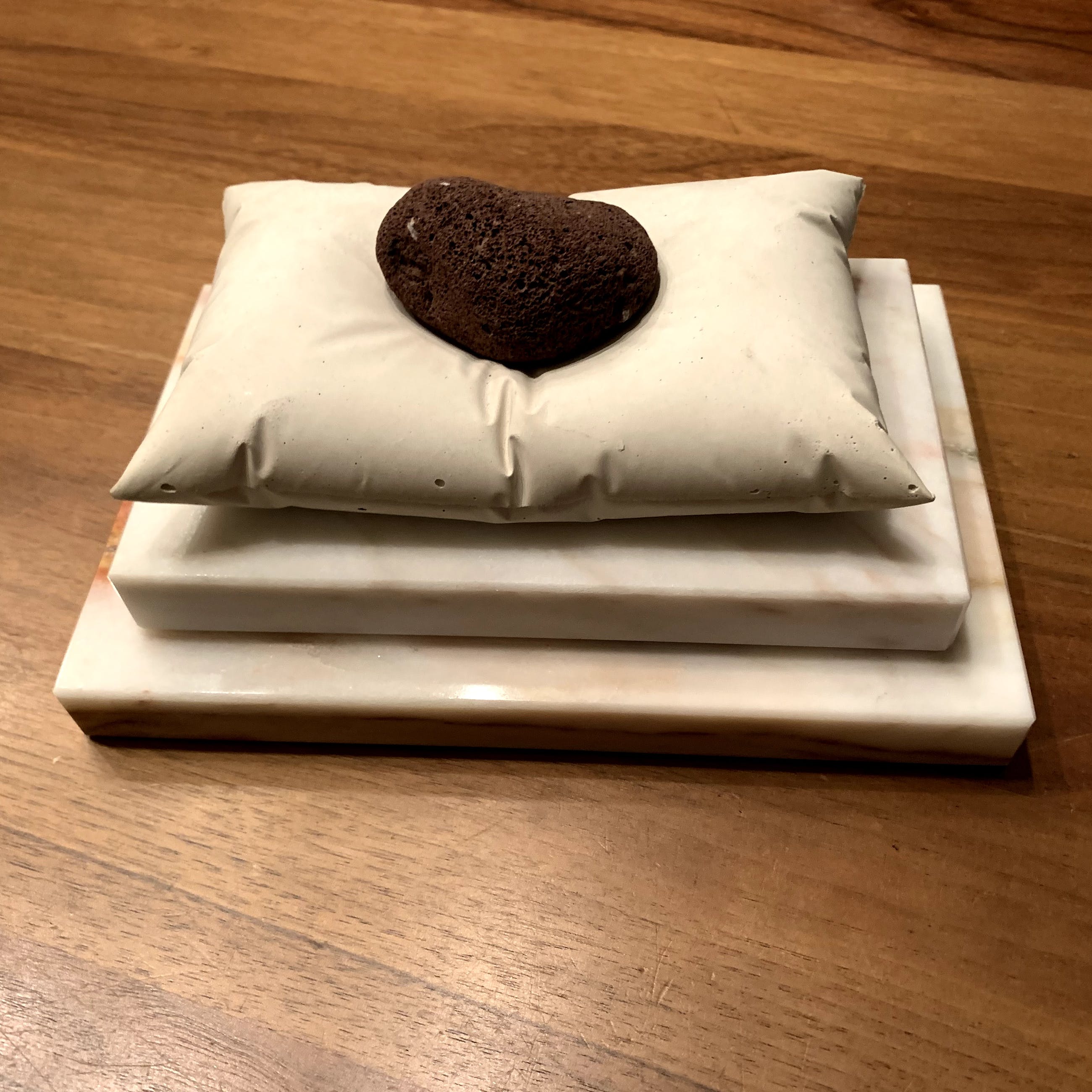 Conditie: zeer goed. Item bestaat uit drie delen: marmeren voet, "gips" kussen en de steen. Alle delen liggen los op elkaar. Handgesigneerd.