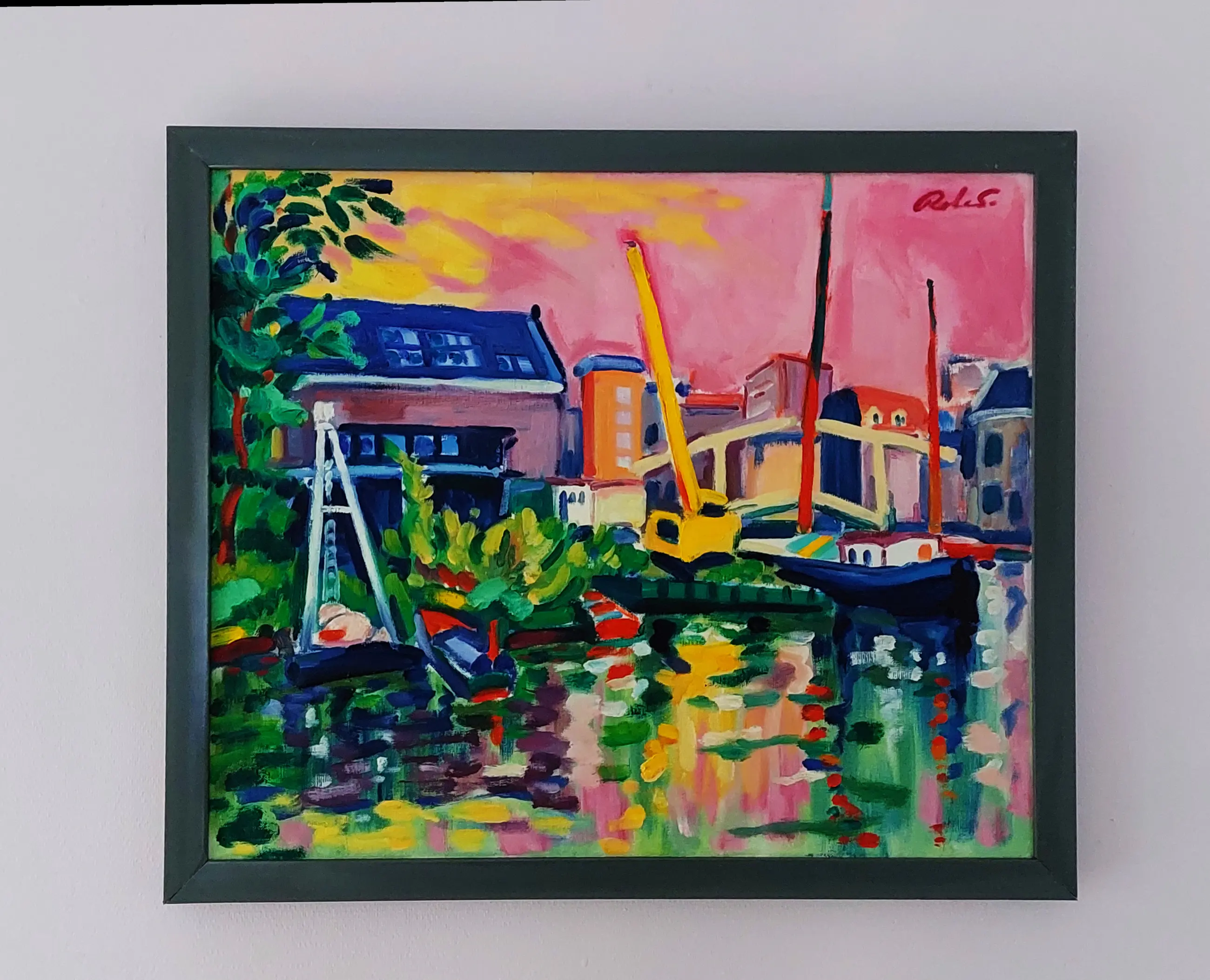 Herkenbare felle kleuren en dik opgezet pallet van zijn vader. Freek. Doekmaat 60 x 50 cm. Ingelijst 66 x 56 cm. Kan echt zo aan de wand . Rechts boven gesigneerd.