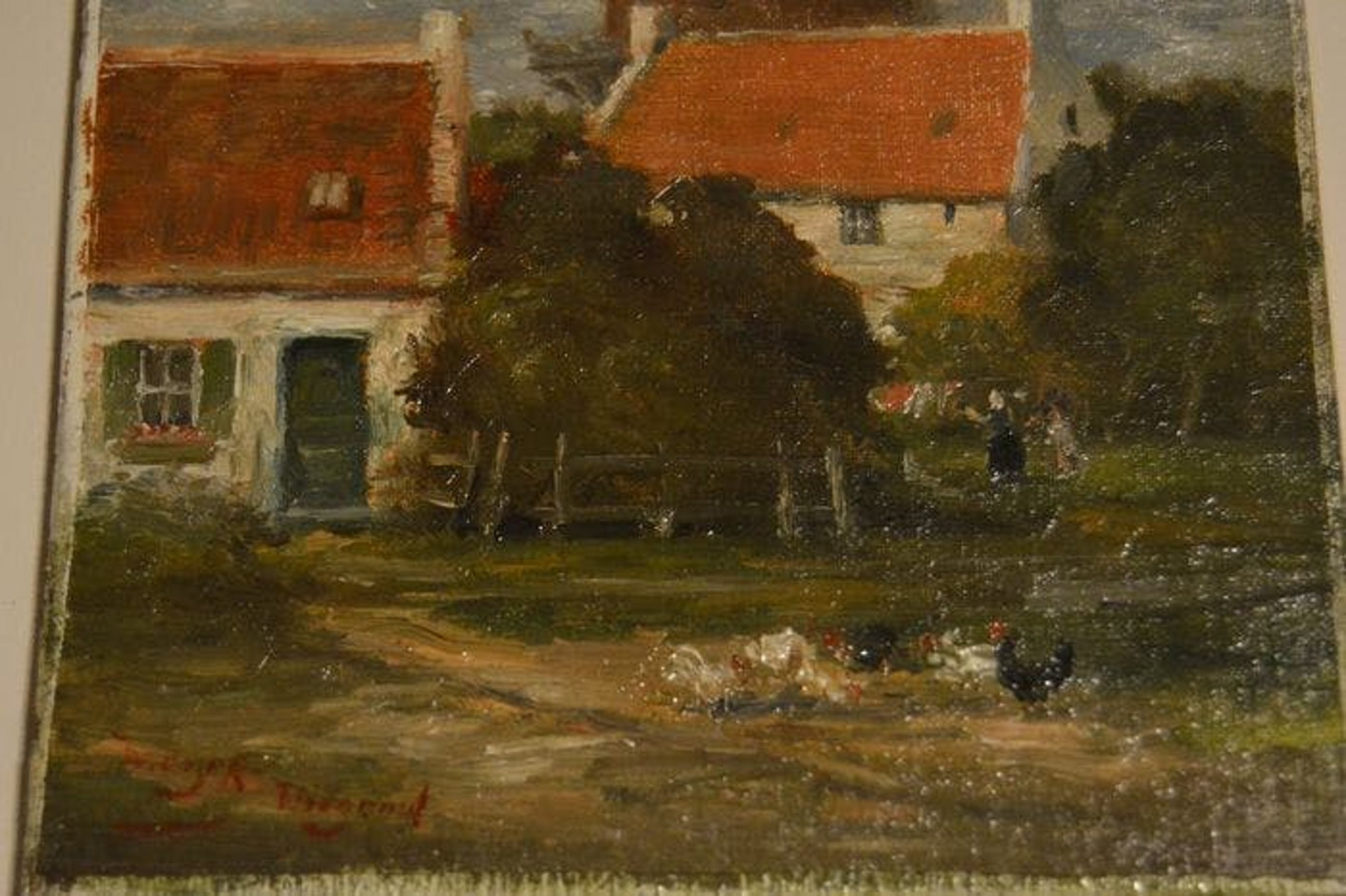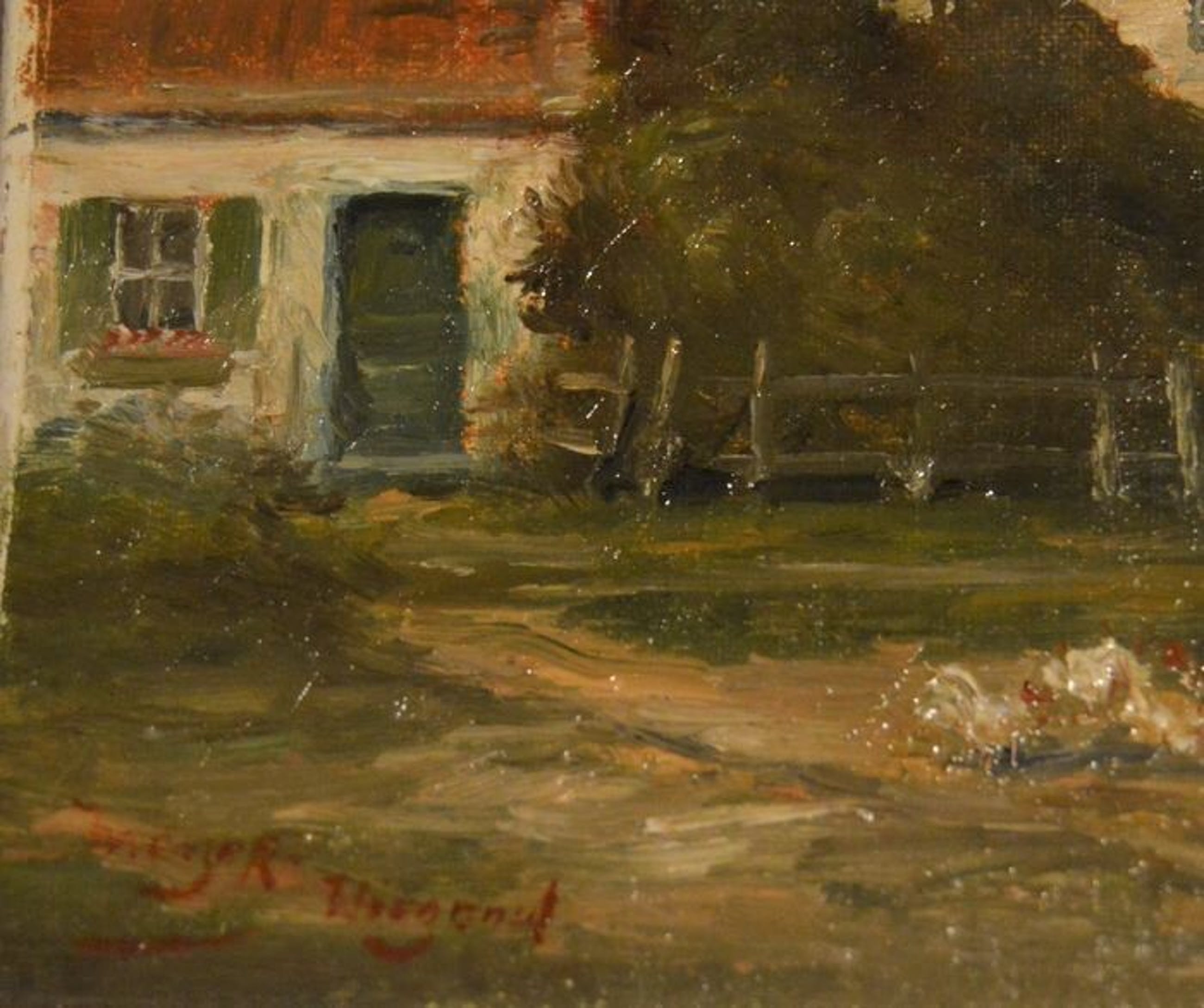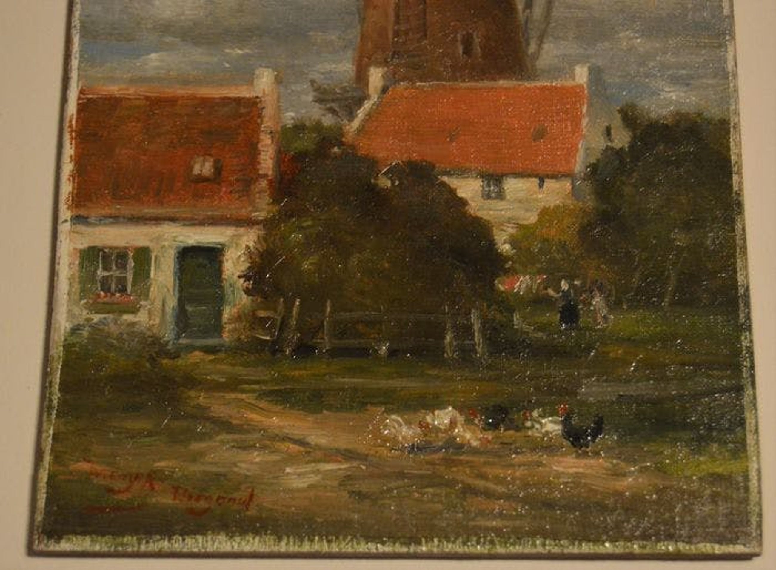 Origineel landschapje. Dorpsgezicht met molen op de achtergrond. Zeer fraai werk op de bekende manier van Wiegand. Verreweg het grootste gedeelte van zijn oeuvre is geschilderd op heel kleine paneeltjes. Fijnheid en elegantie, de puurheid van de natuur, het bruisende van stad en industrie, alles gevangen binnen de kaders van die kleine plankjes waarop Rolf Dieter Meyer-Wiegand het leven wist stil te leggen. Aangetekend verzenden.