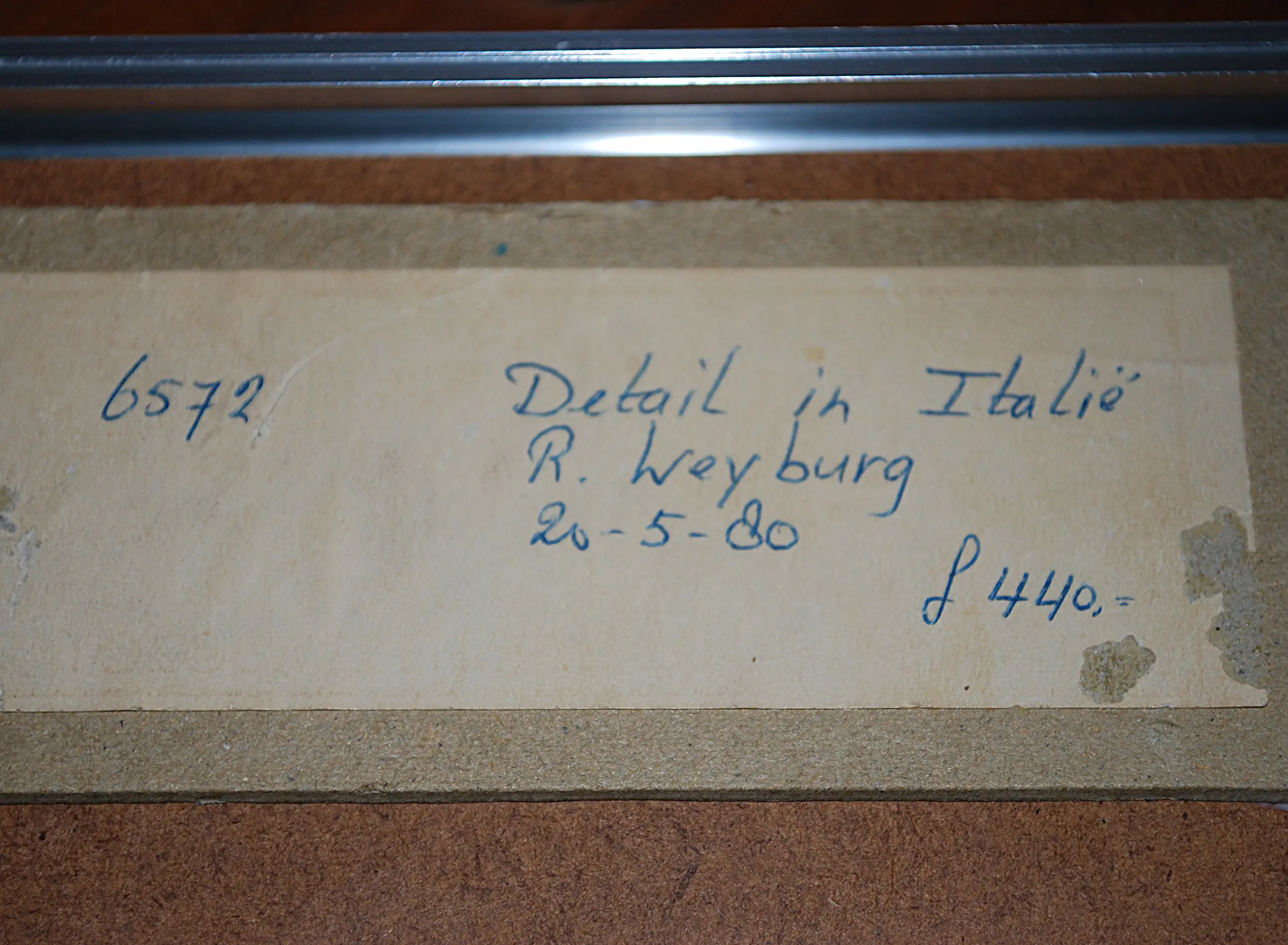 Het blad is bevestigd op karton, achter passepartout en glas.