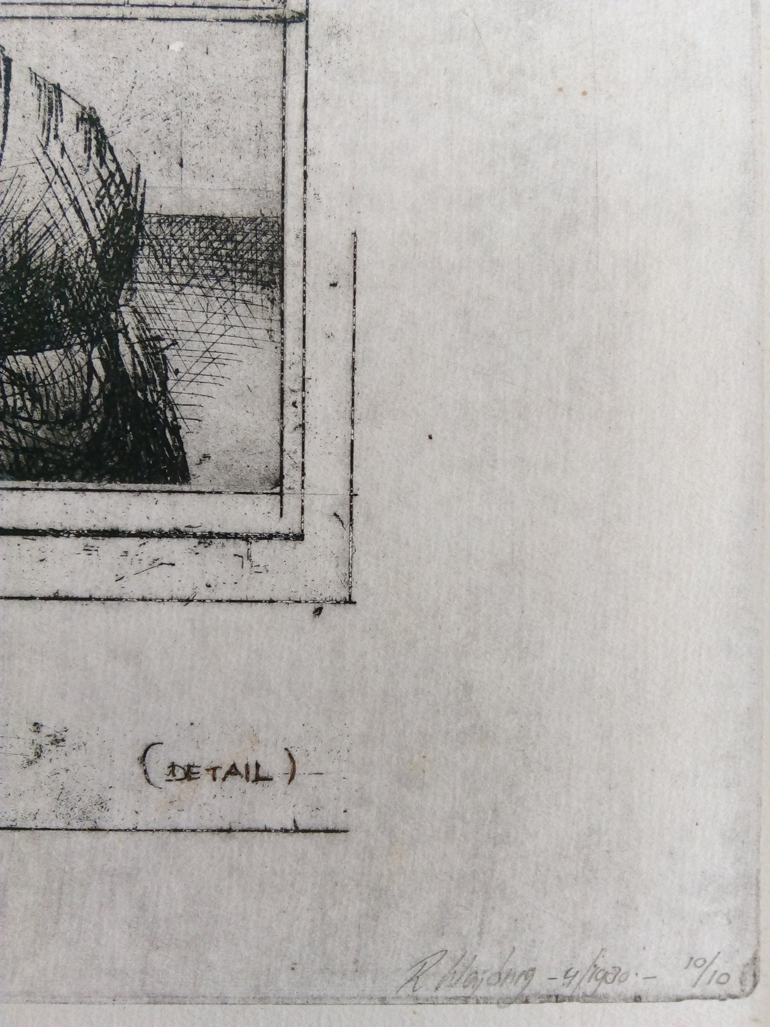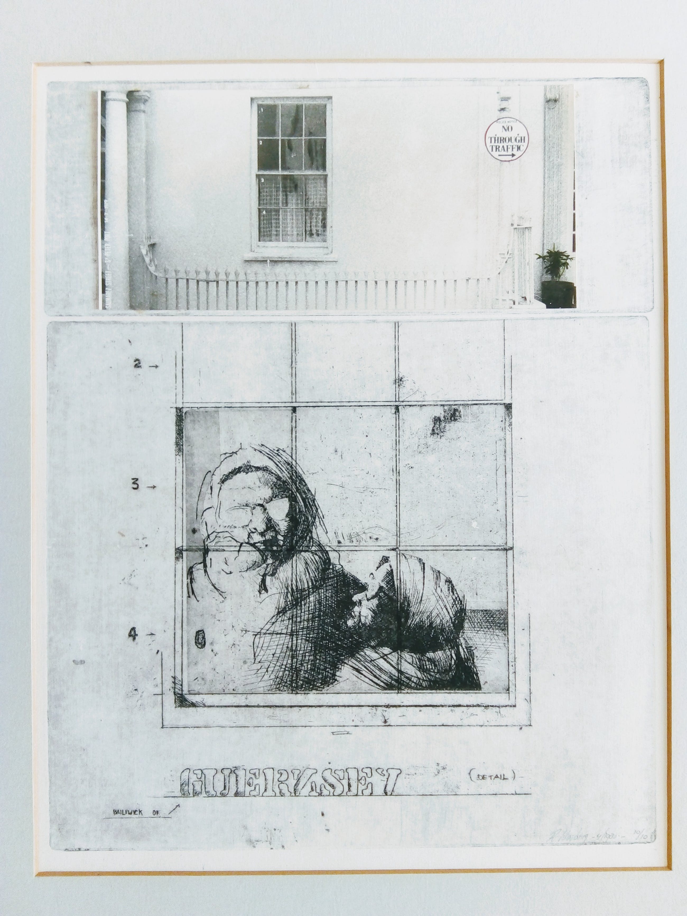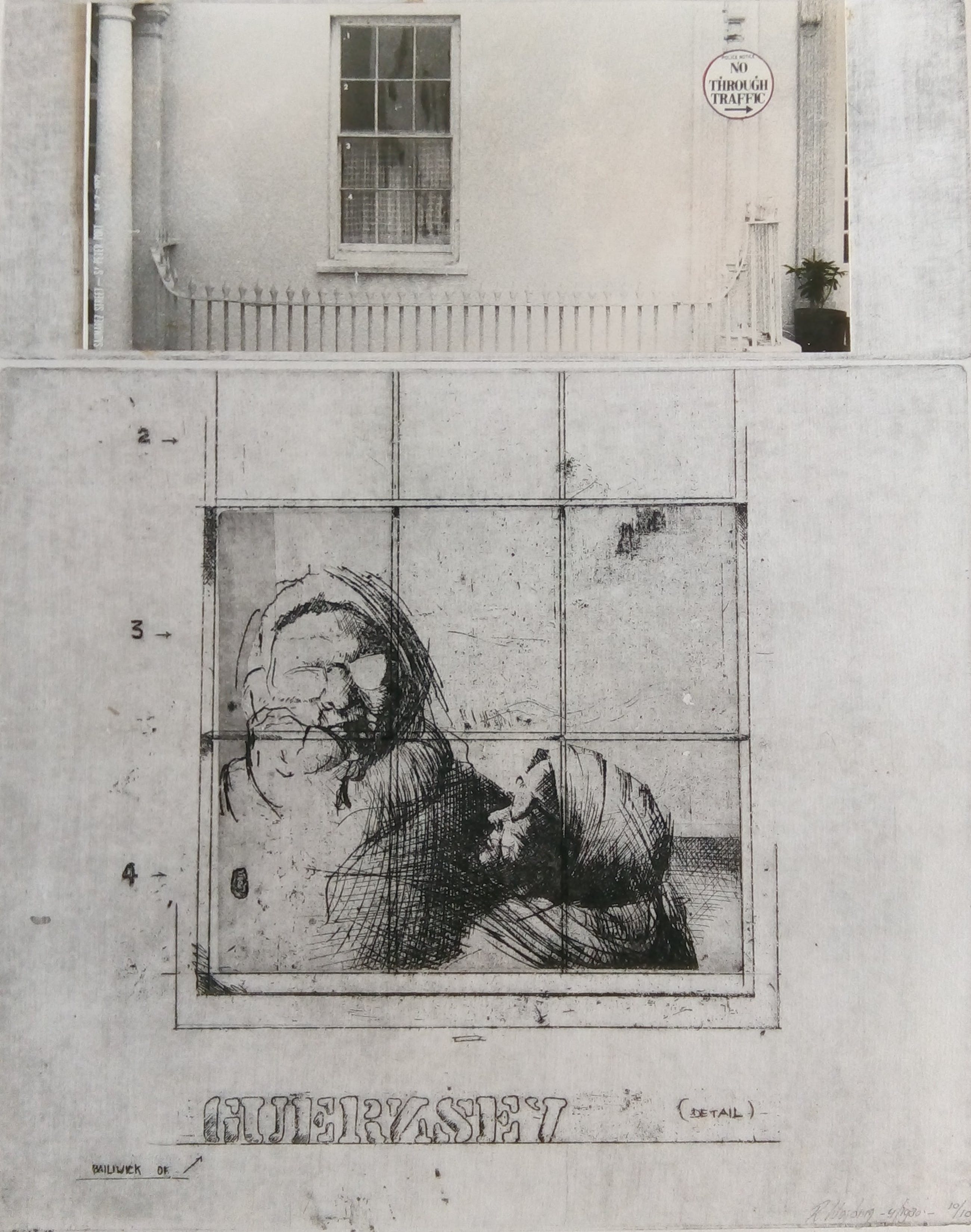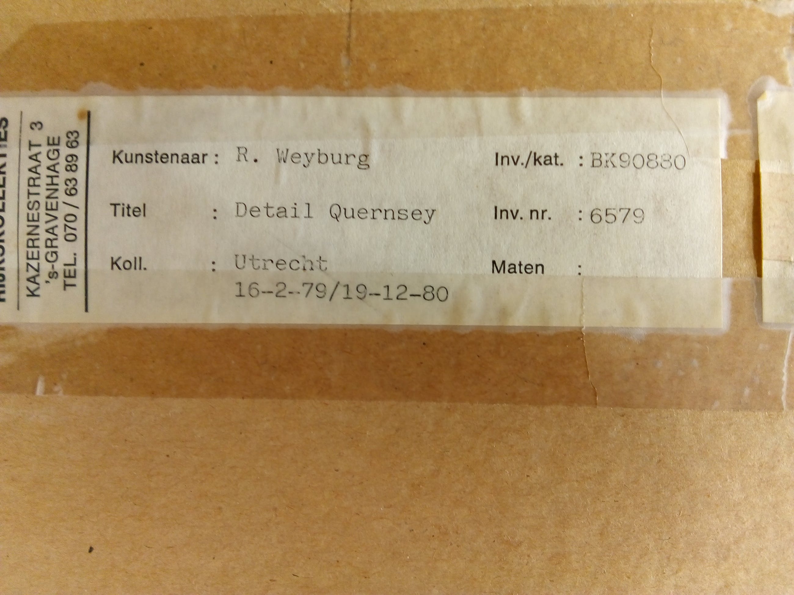 Betreft een uniek werk van Rolf Weijburg uit 1980, een combinatie van ets en gemengde techniek (collage). Detail Quernsey uit Rijkskunst Collectie.