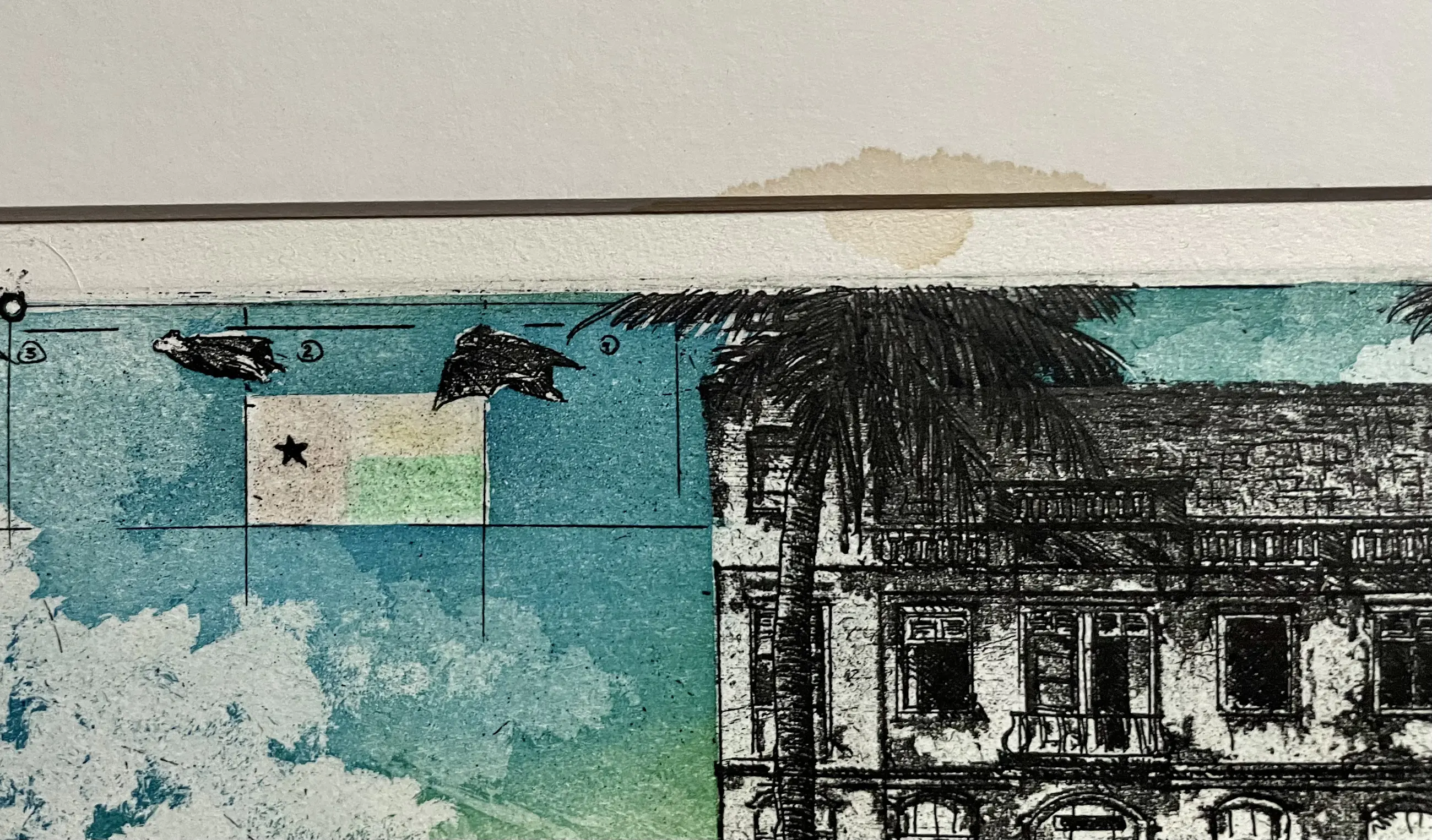 Het werk is in zeer goede conditie. Er zit echter een klein vochtplekje rechtsboven in het passe-partout. Dit heeft ook een vochtplekje op het papier veroorzaakt.