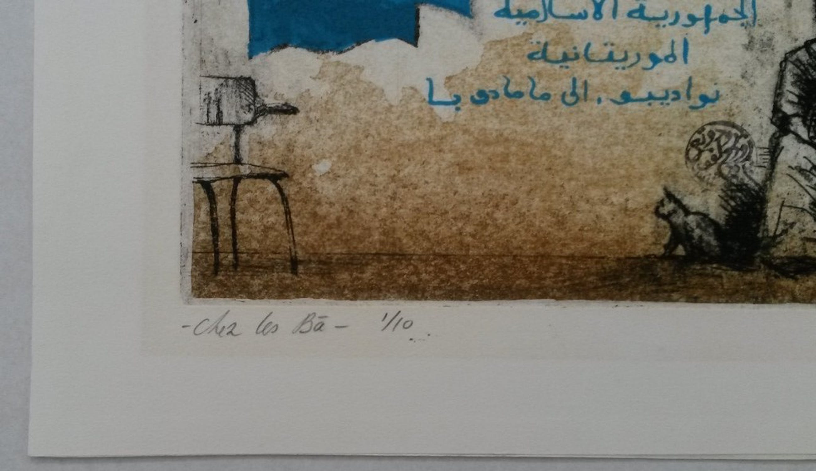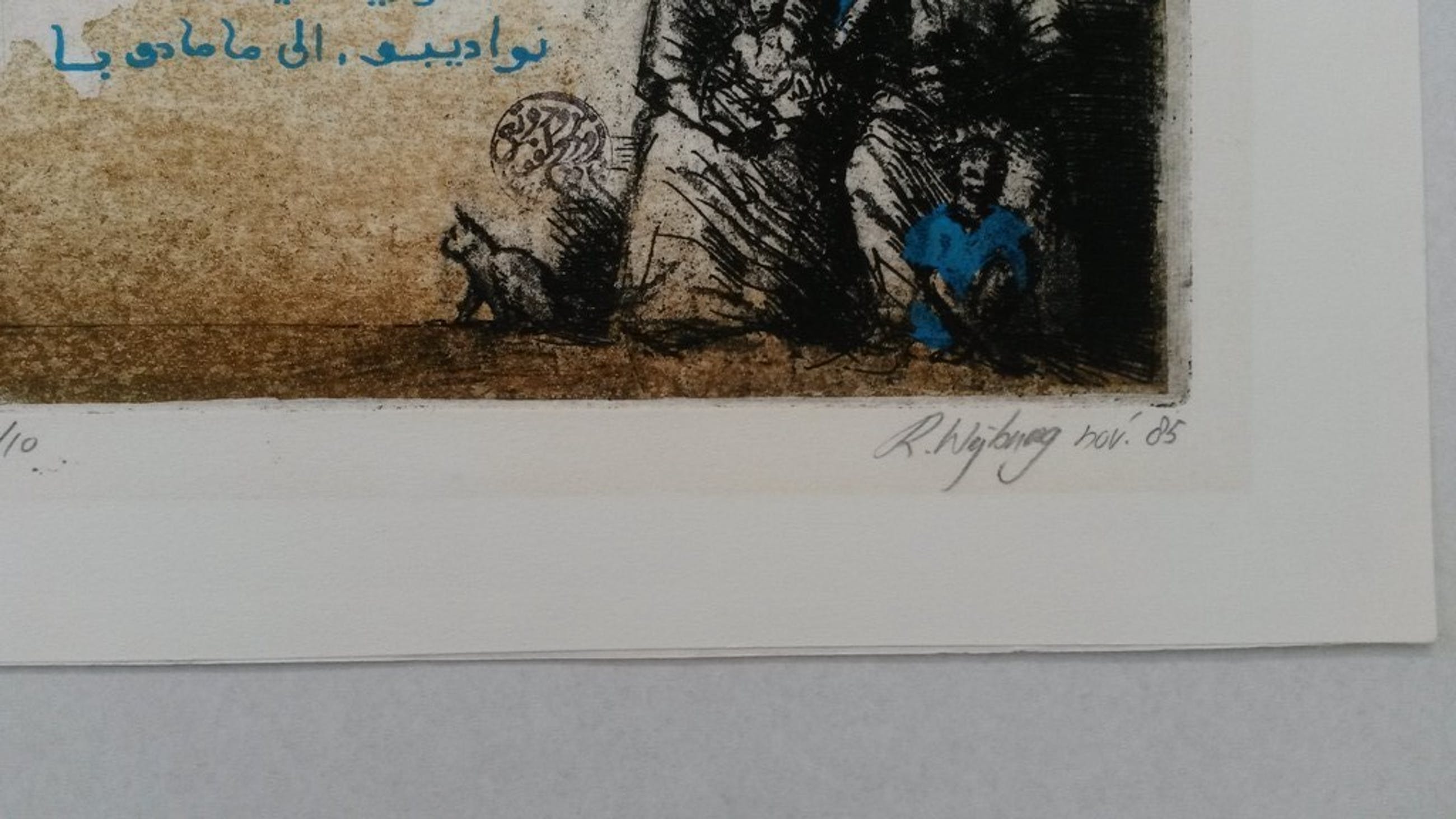 Prachtige kleurenets van Rolf Weijburg, met potlood gesigneerd en gedateerd, november 1985. rechtsonder. Titel in potlood linksonder Chez les Ba. Nummer 1 van een oplage van 10. Afmeting blad 325 x 234 mm, afmeting beeld 248 x 155 mm. In prima conditie, marge licht vergeeld door eerdere inlijsting, plakbandrest op achterzijde.