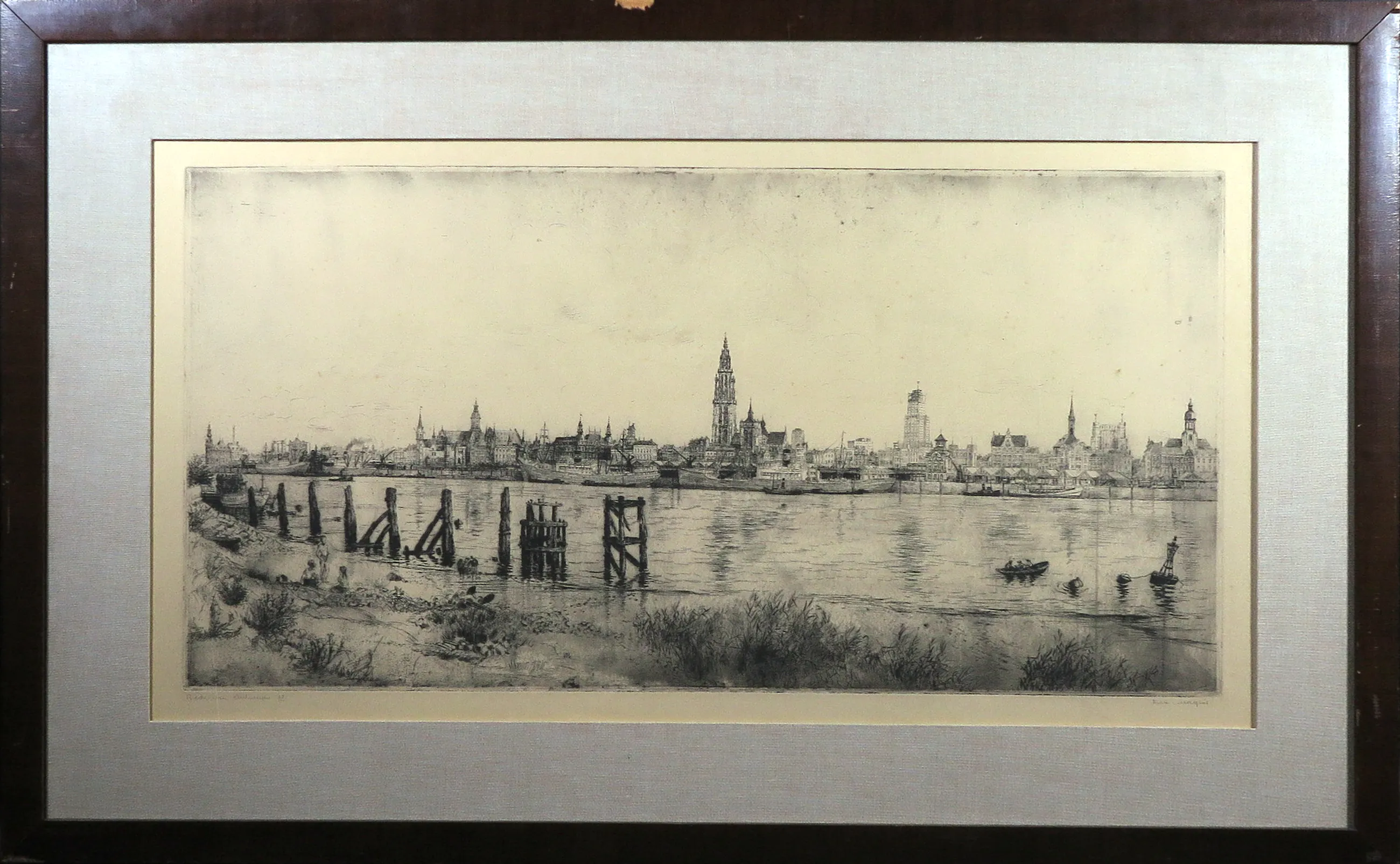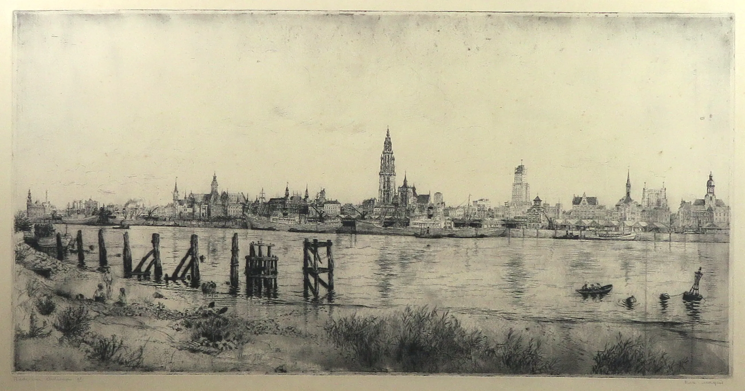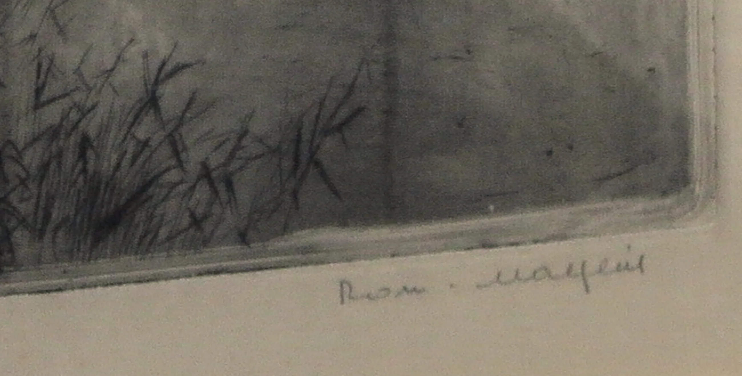 | Een aantal kleine bruine plekjes op de ets, en een duidelijke beschadiging aan de lijst. Verder is de ets in goede staat. | |