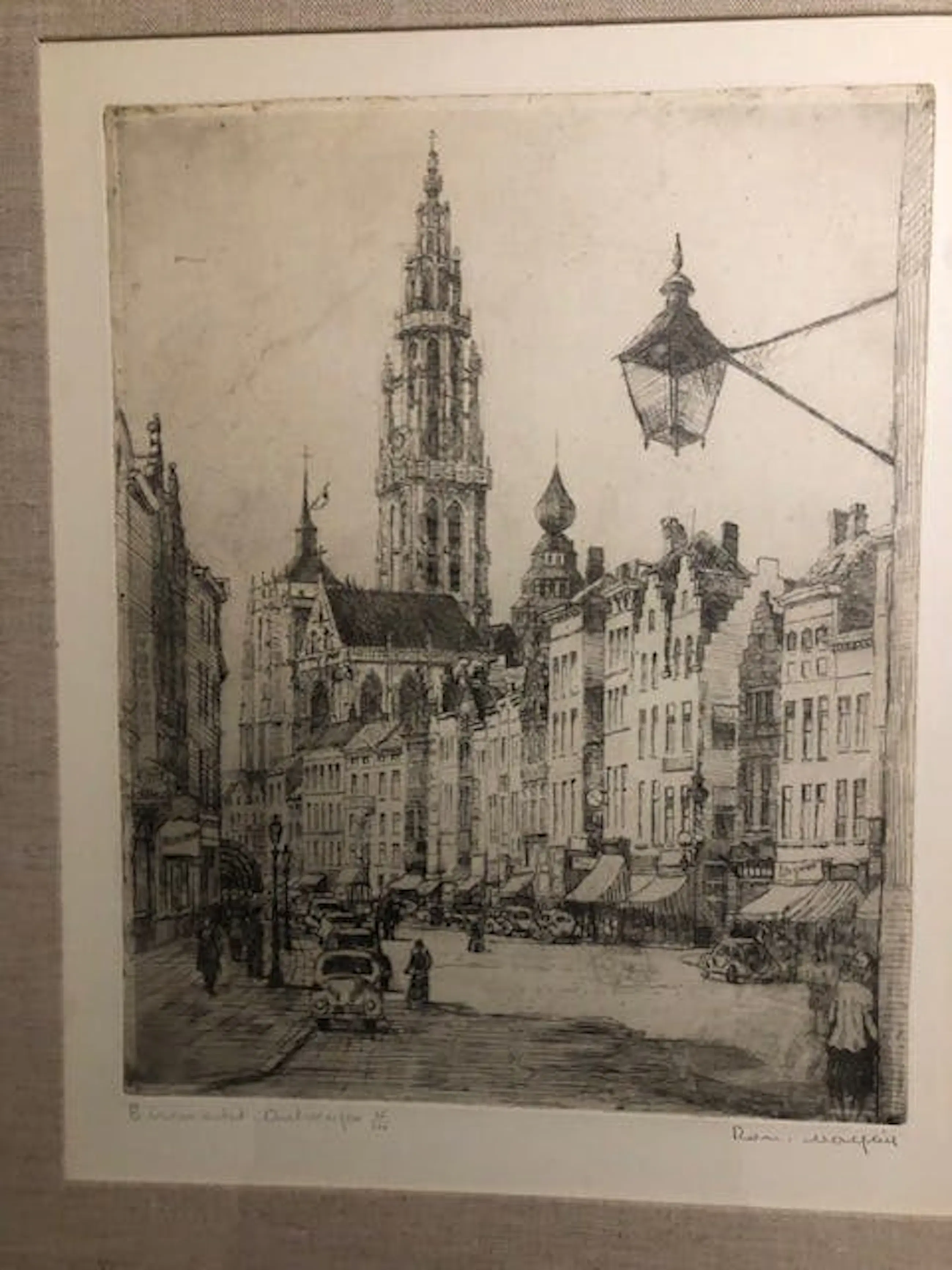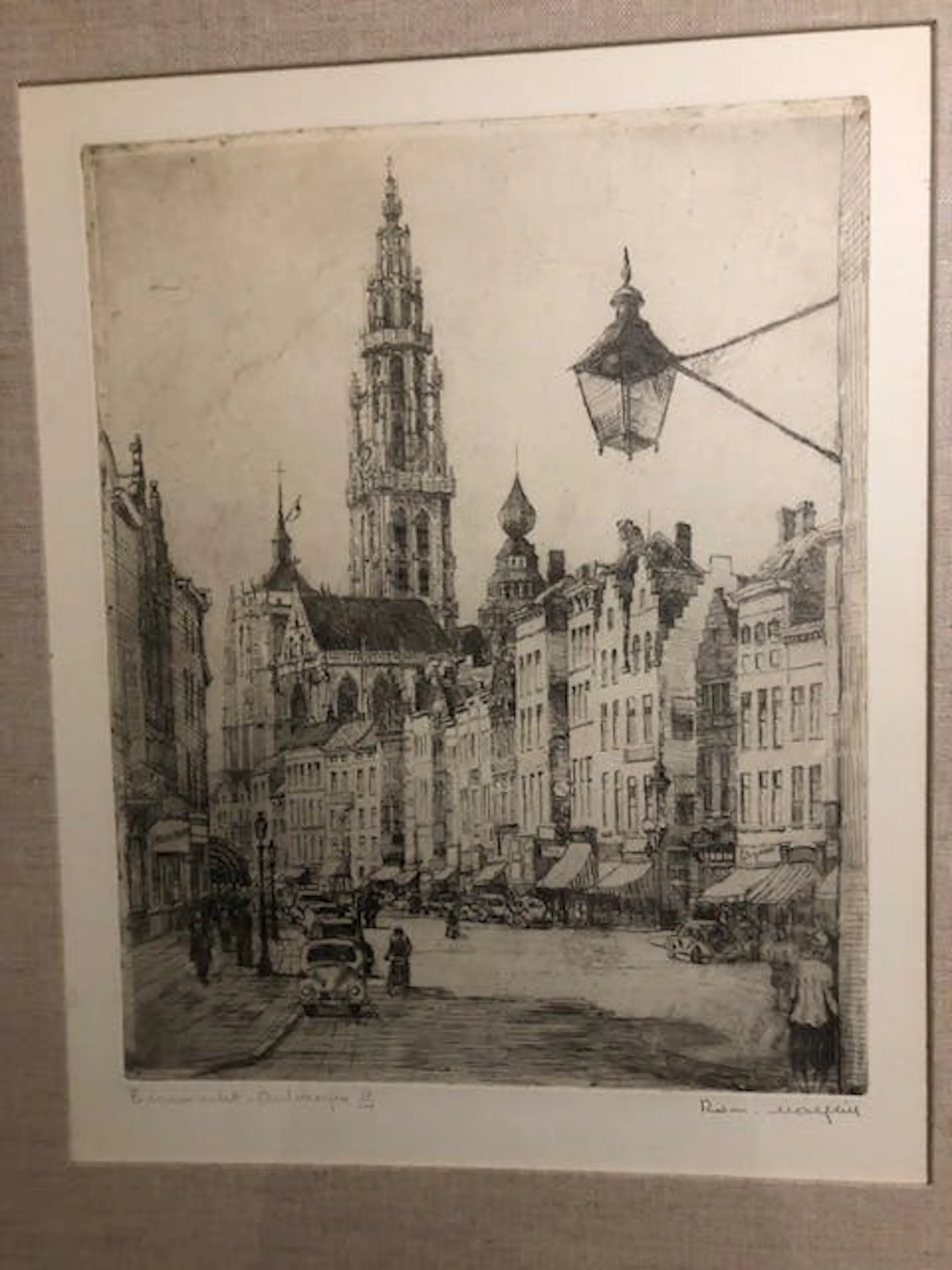 Prachtige pentekening van de Antwerpse Kathedraal en omgeving. In oorspronkelijke staat en volledig ingekaderd. Direct beschikbaar na contact name.