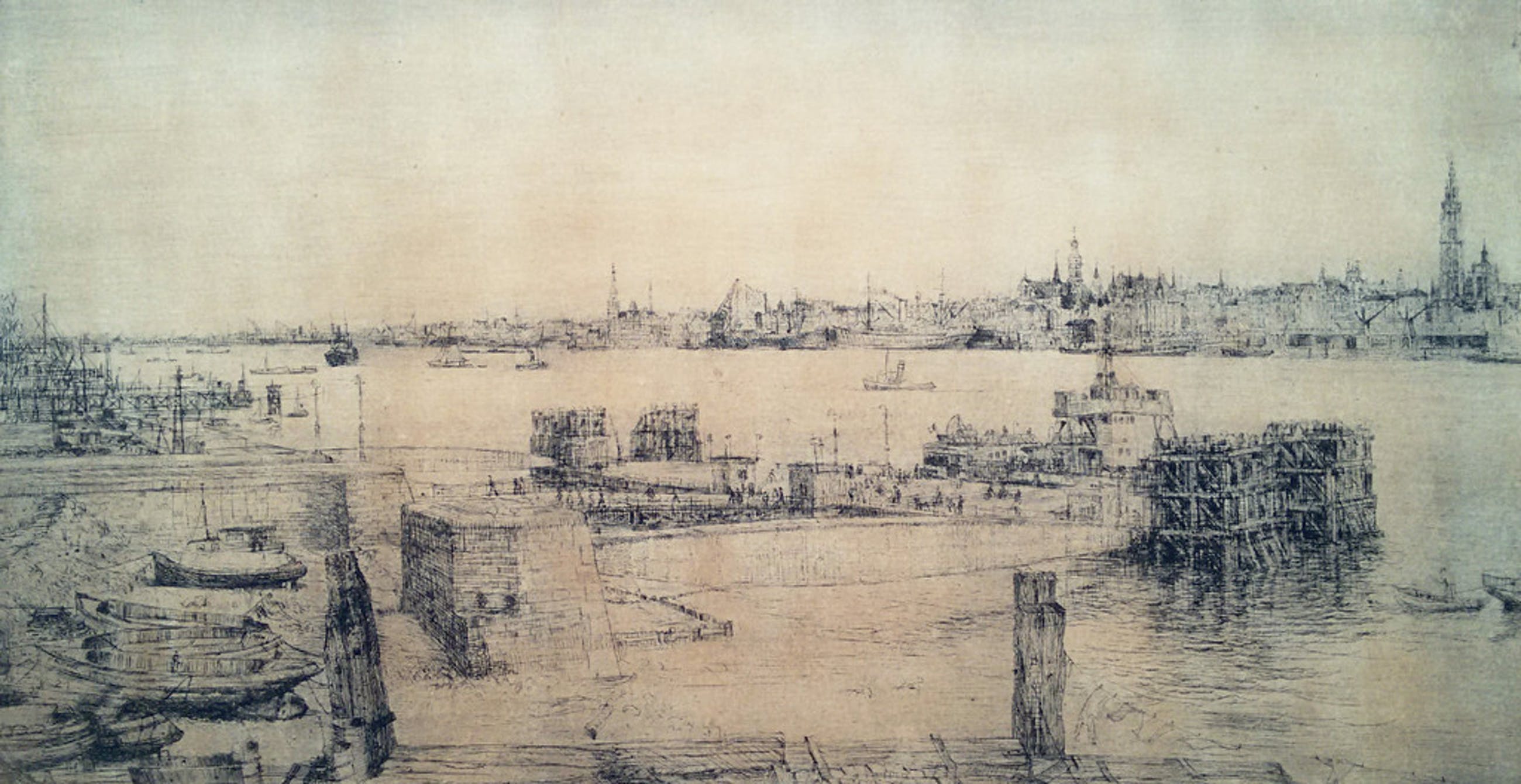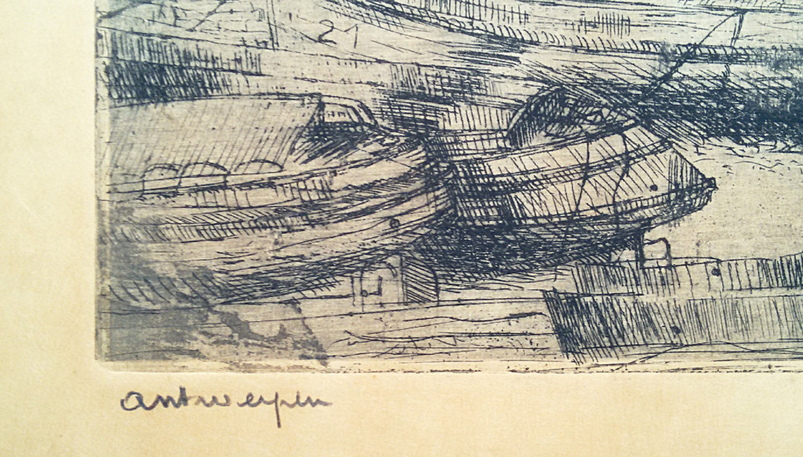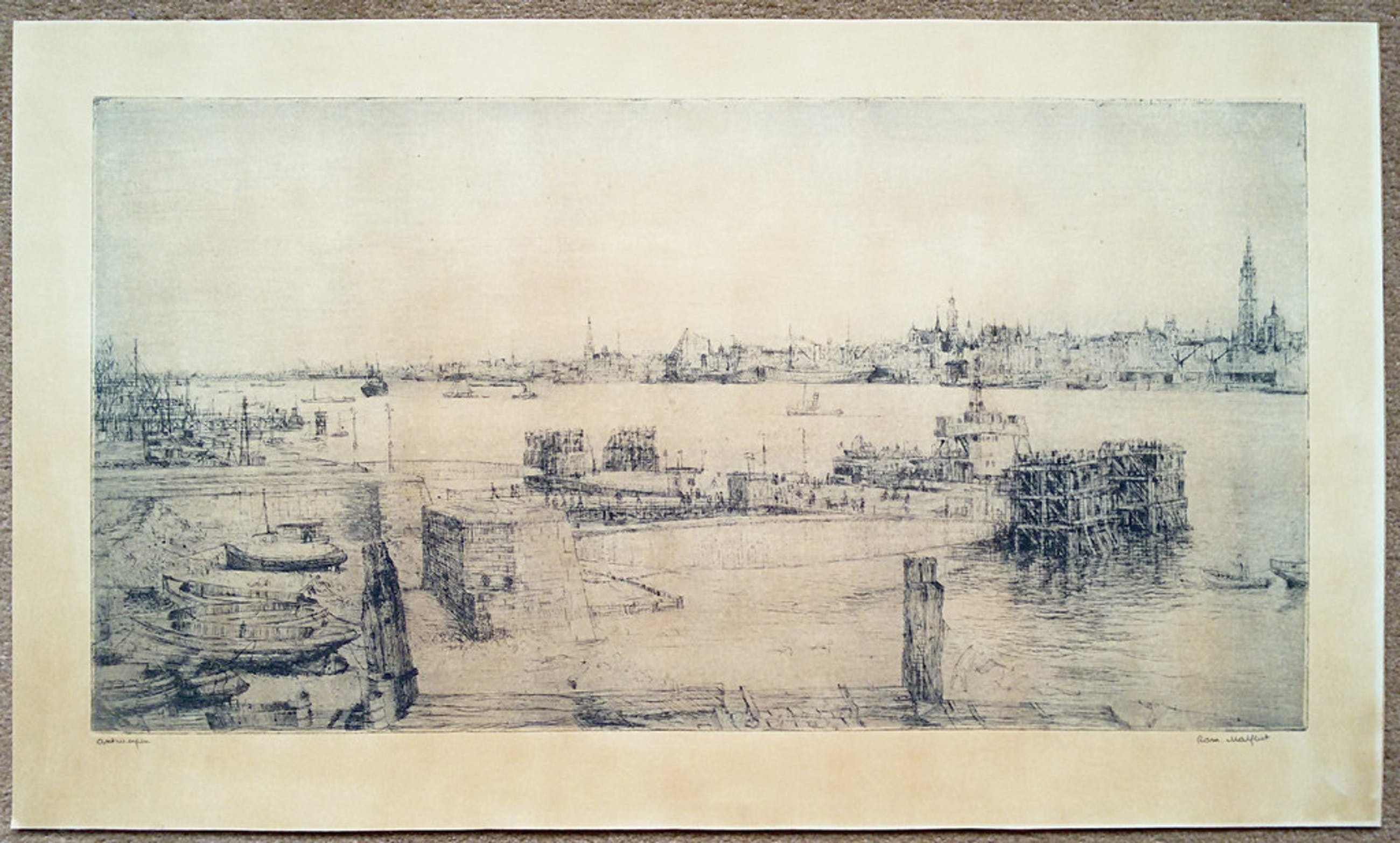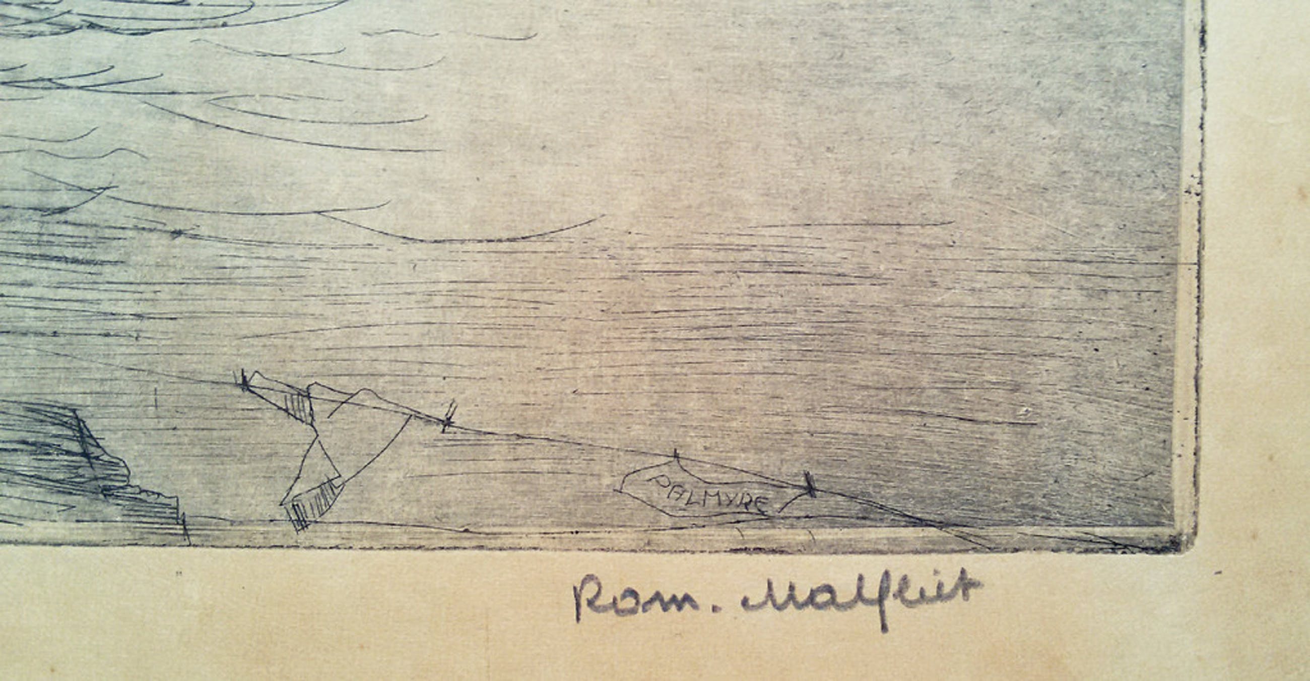 Relatief grote ets van Romain Malfliet. Ets op papier, gemonteerd op karton/board (beide gedeelten samen vormen een perfect geheel). Met potlood gesigneerd en gesitueerd. Het gehele blad is sterk bruin verkleurd.