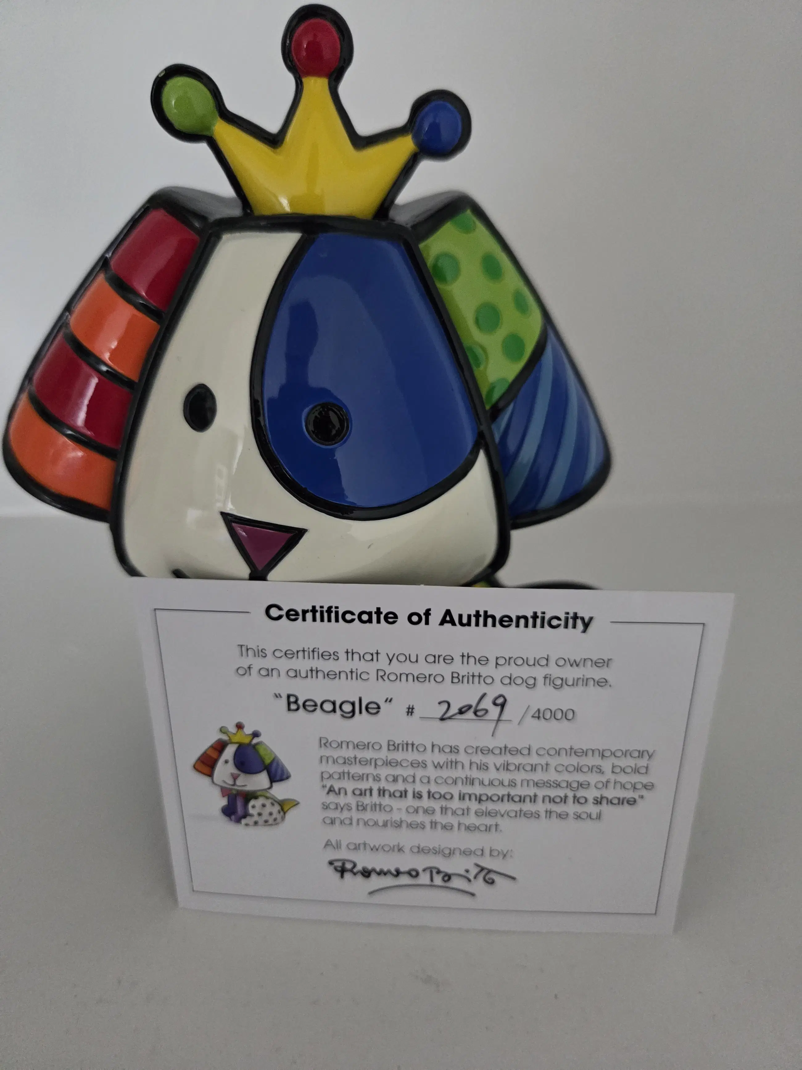 Prachtig en kleurrijk handgeschilderd polystone beeldje van een koninklijke hond (Beagle). Handgenummerd '2069/4000' op de voet en inclusief certificaat van echtheid. Gelimiteerde oplage van 4000. 2de editie. Afmetingen: 16 x 11,5 x 9 cm.