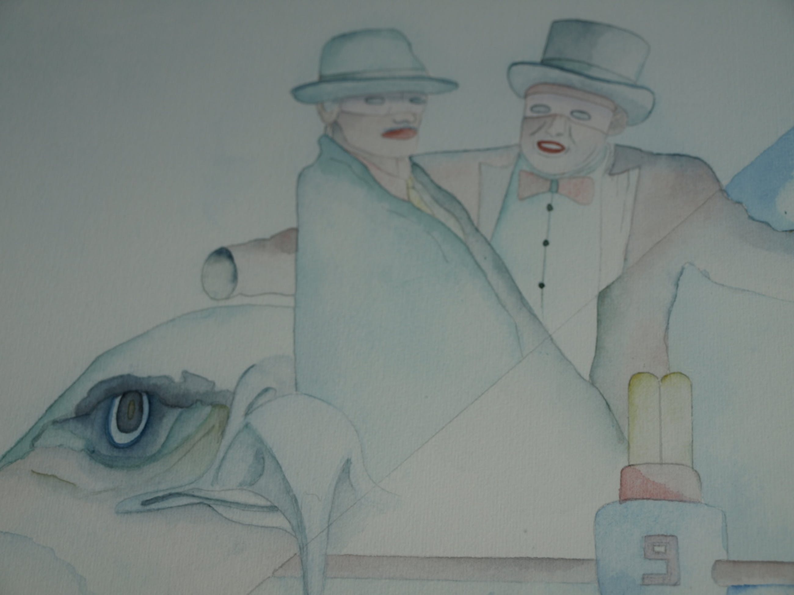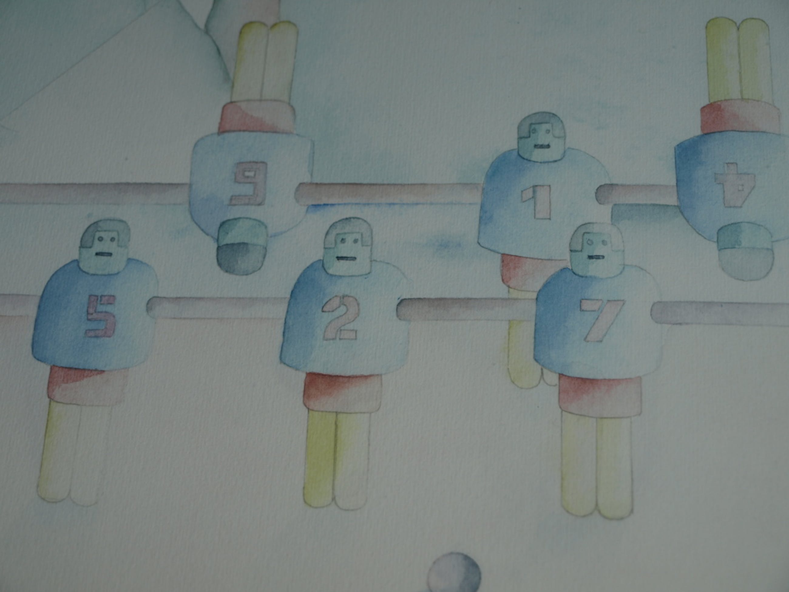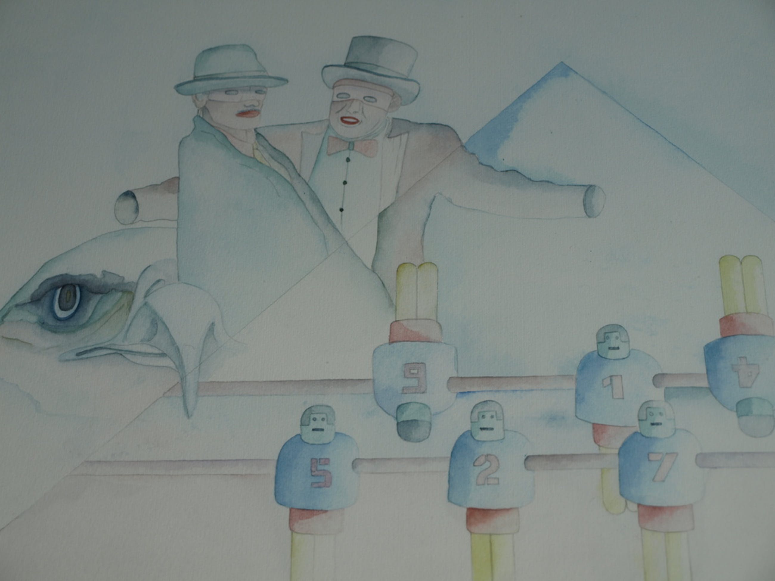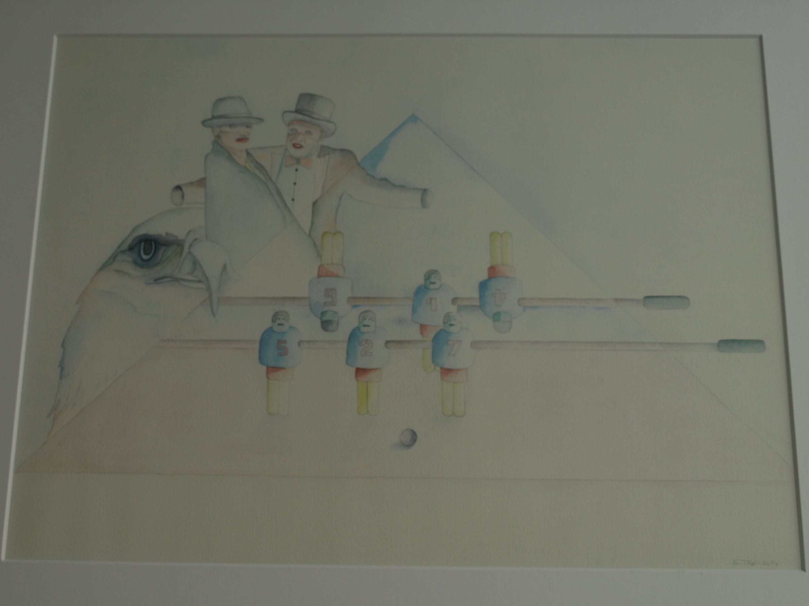 Een grote, sfeervolle aquarel met een voorstelling van een tafelvoetvbalspel, man en vrouw en een arend....