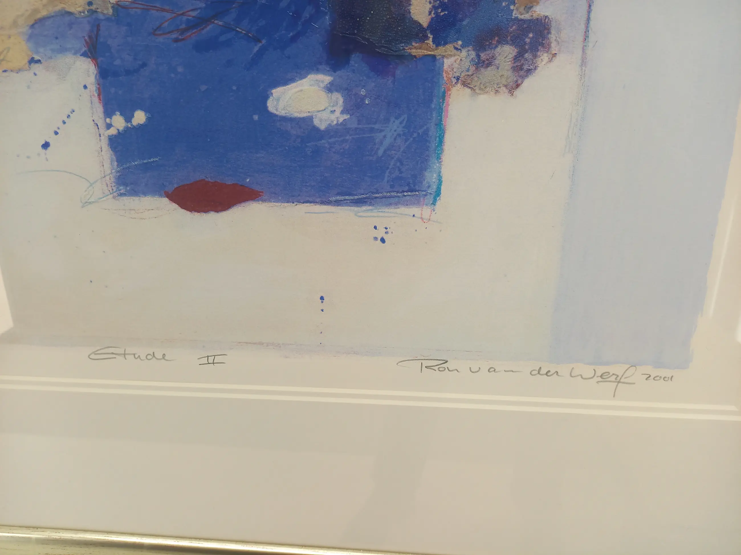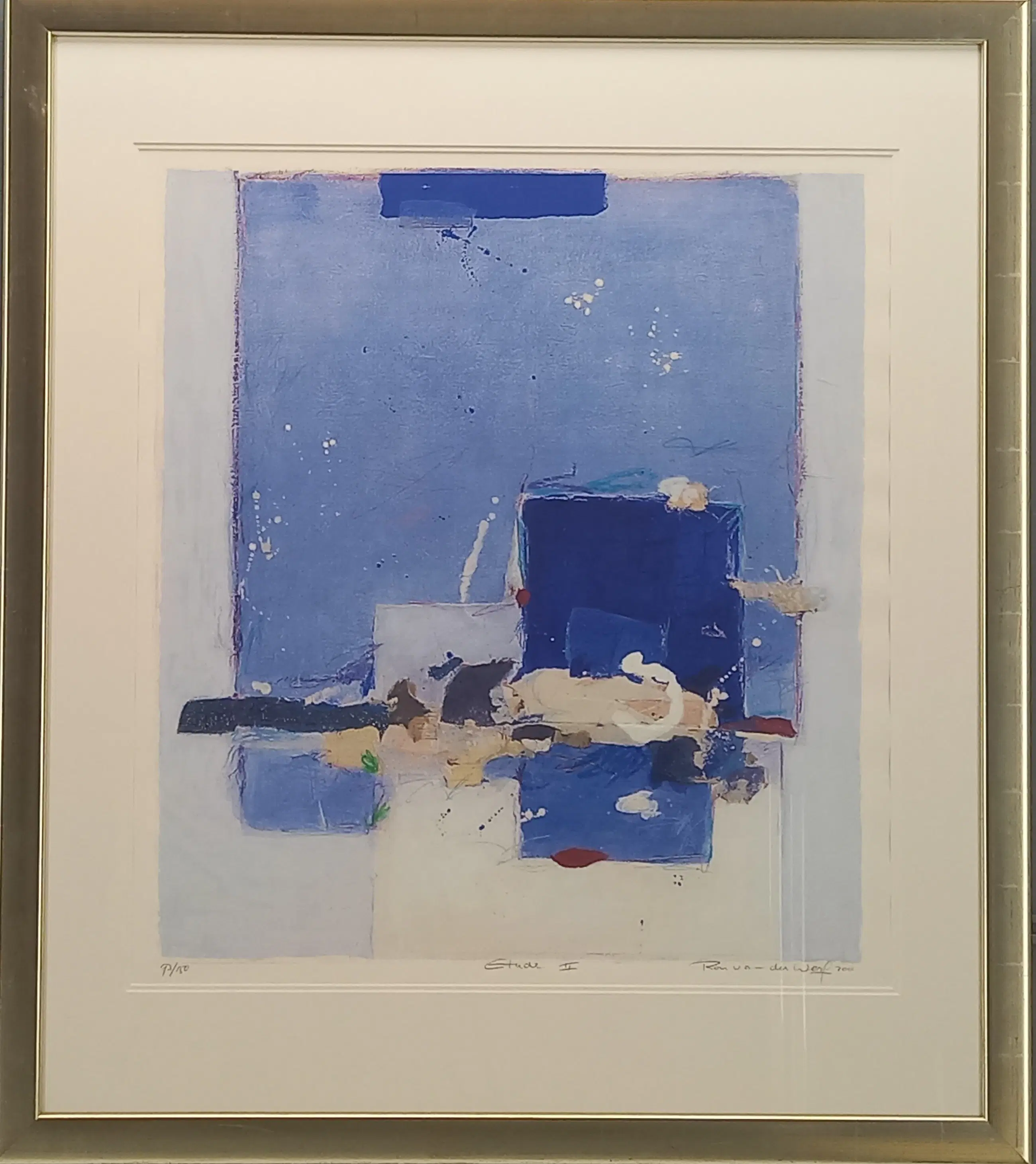Mooie zeefdruk met zwel-inkt: geeft reliëf. In goudkleurige lijst.
