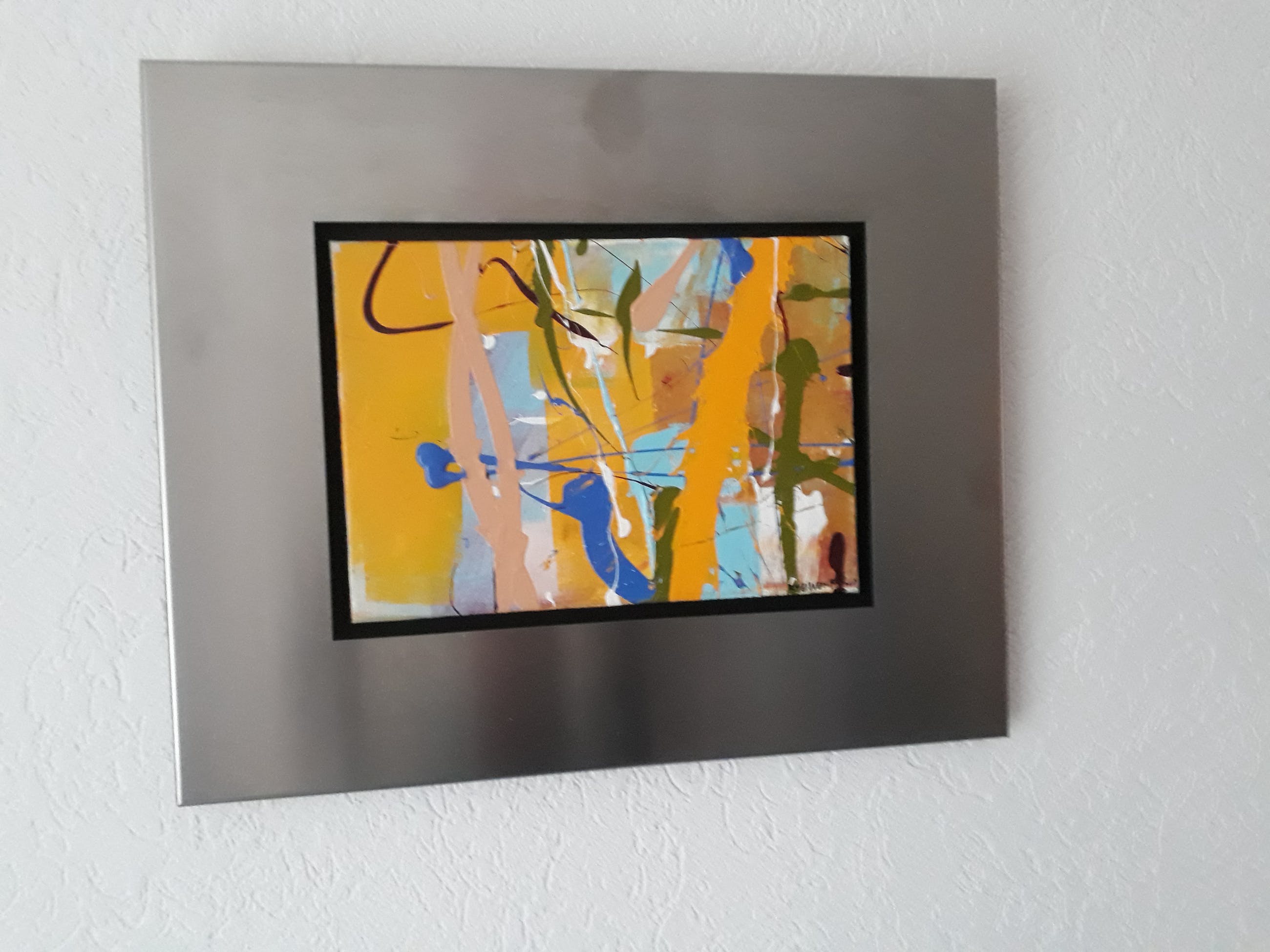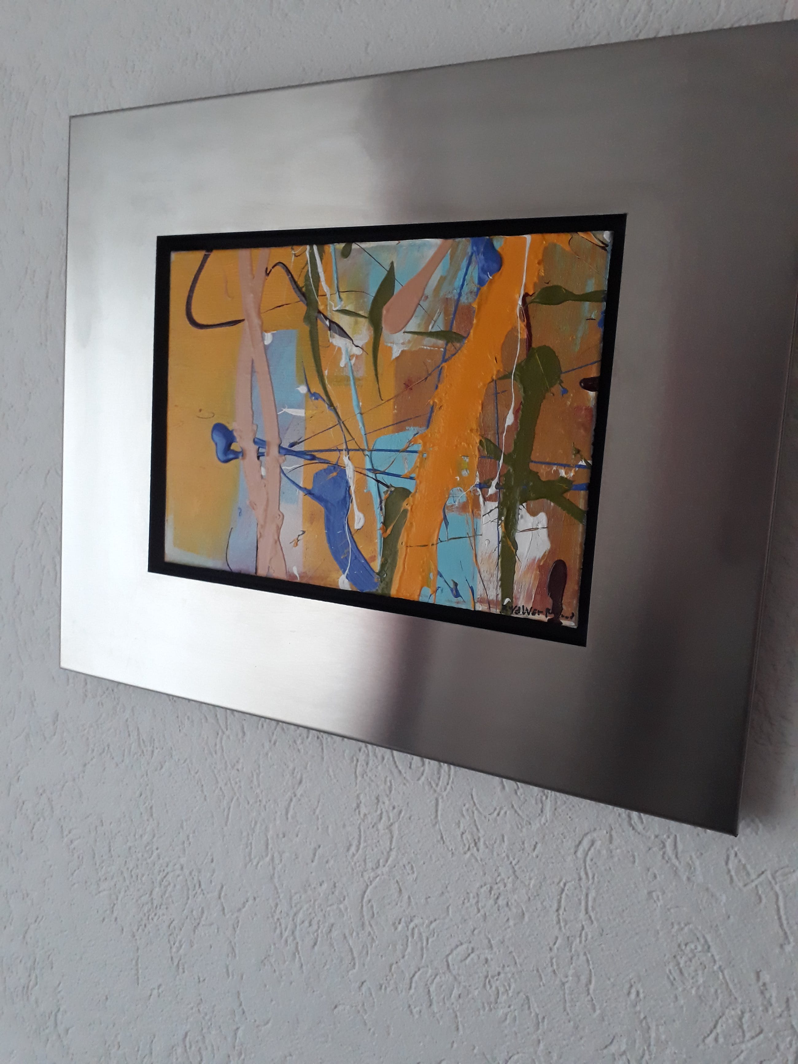 Zeer mooi abstract werk van ron van de werf. Uiteraard gesigneerd en gedateerd rechtsonder. Het fraaie werk zit in een geheel rvs lijst. Deze lijst is laser gesneden zodat er geen naden in zitten. Bij ophangen komt het werk iets van de muur aangezien de rvs lijst nogal dik is.