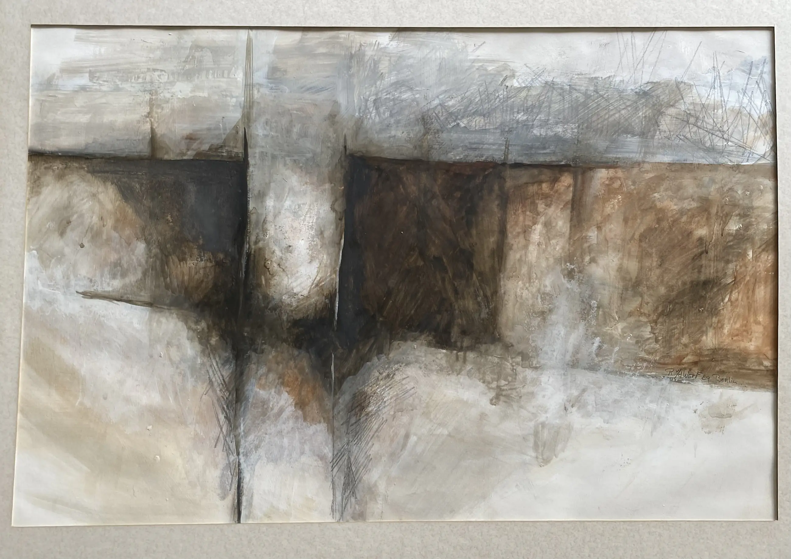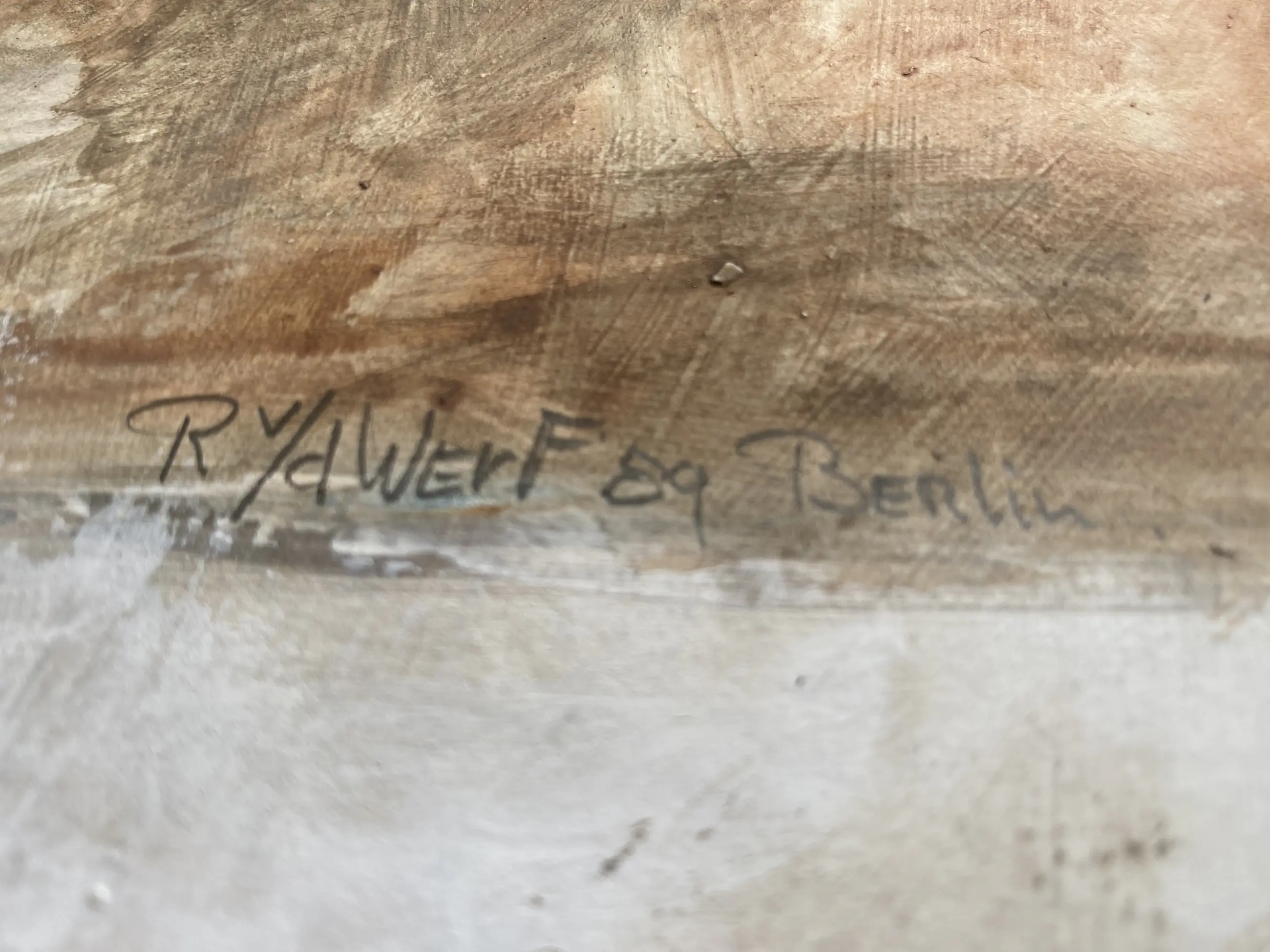 Mooi schilderij op papier van Ron van der Werf met gemengde techniek (verf/potlood) van de Berlijnse Muur met opening (symbolischt) uit 1989.