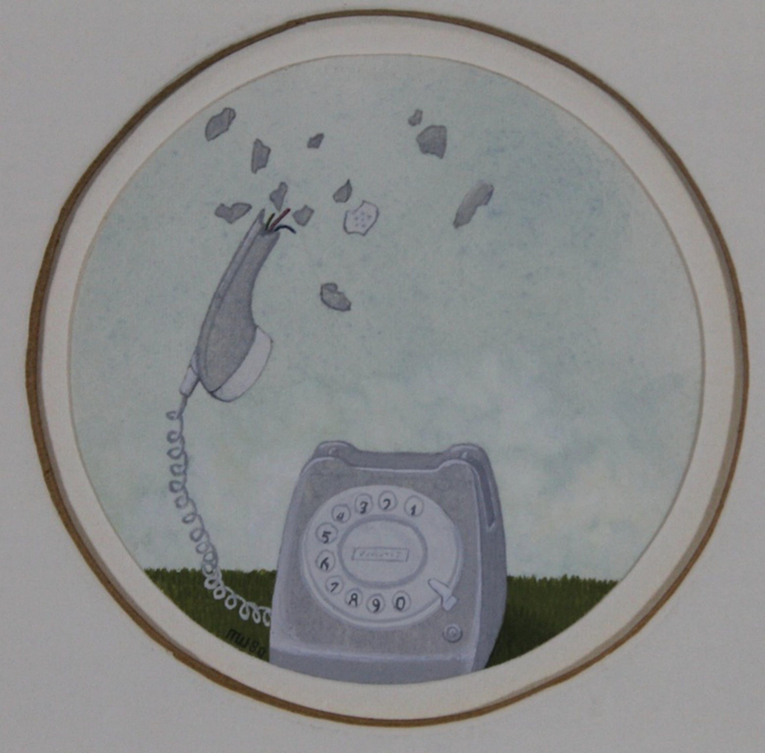 Ron Watts, Gouache op papier, de meester op de vierkante millimeter, "Telephoon", 1980.