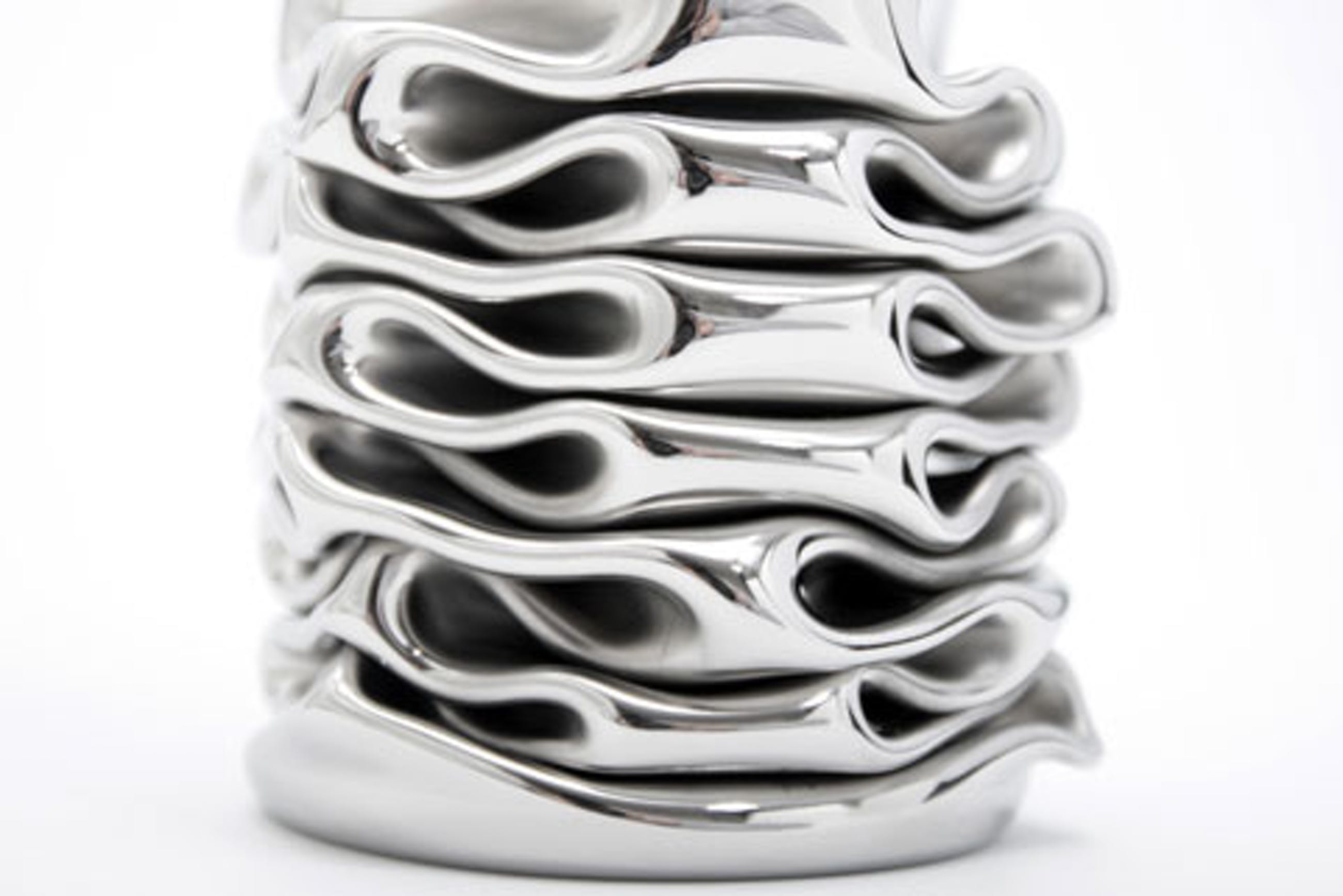 Crush Vaas large van Ronald A. Westerhuis. Een roestvrij stalen pijp is met een kracht van 25 ton in elkaar gedrukt. Wat begon als een ongeluk is nu helemaal geperfectioneerd. De in elkaar gedrukte bodem is elke keer uniek en geeft de vaas een geweldige look. Op en top Nederlands design.