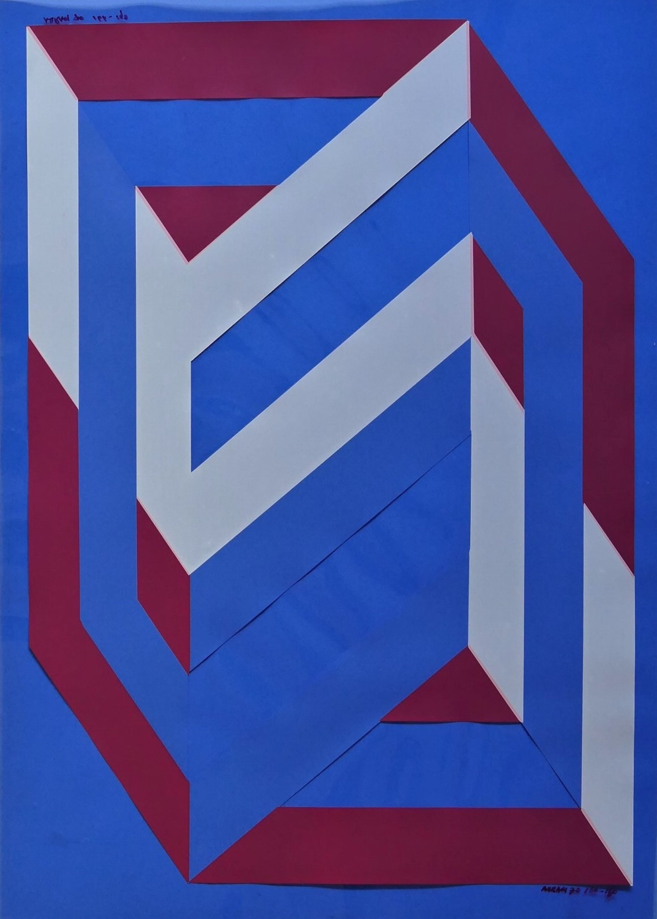 Geometrisch abstracte 3 kleuren compositie. Tweezijdige zeefdruk op transparant acryl. Aan beide zijden gesigneerd : Abram 70 en 166/190
