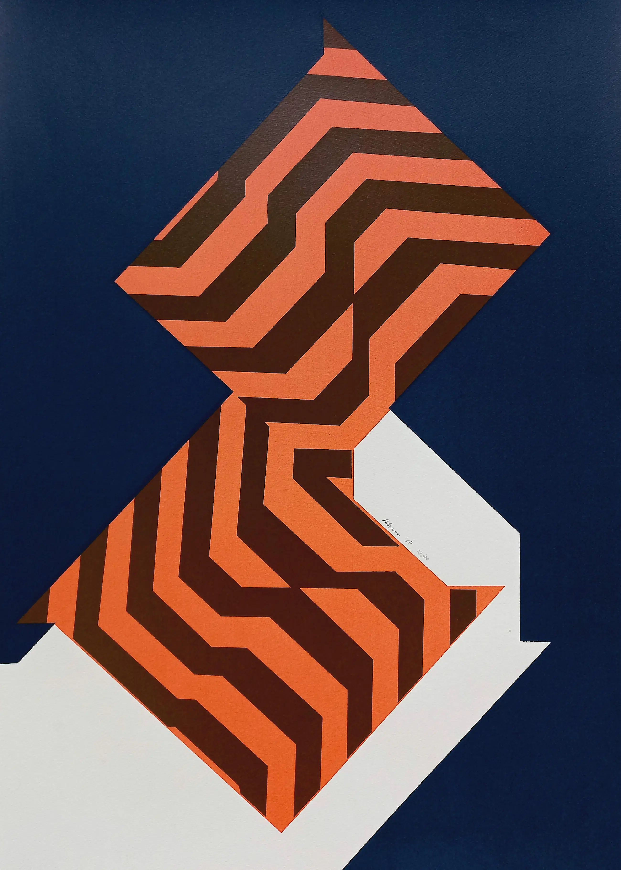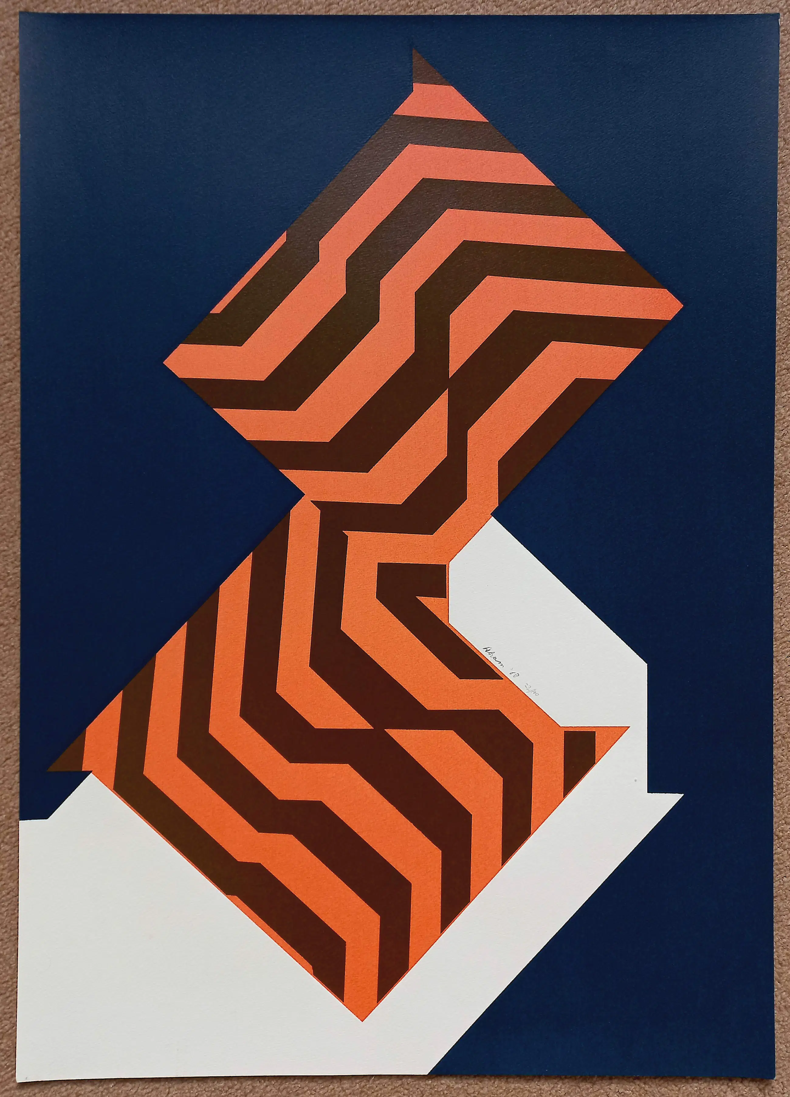 Strakke geometrische compositie van Ronald Abram. Zeefdruk op papier, met potlood gesigneerd, gedateerd (‘68) en genummerd (22/100). In zeer goede conditie.