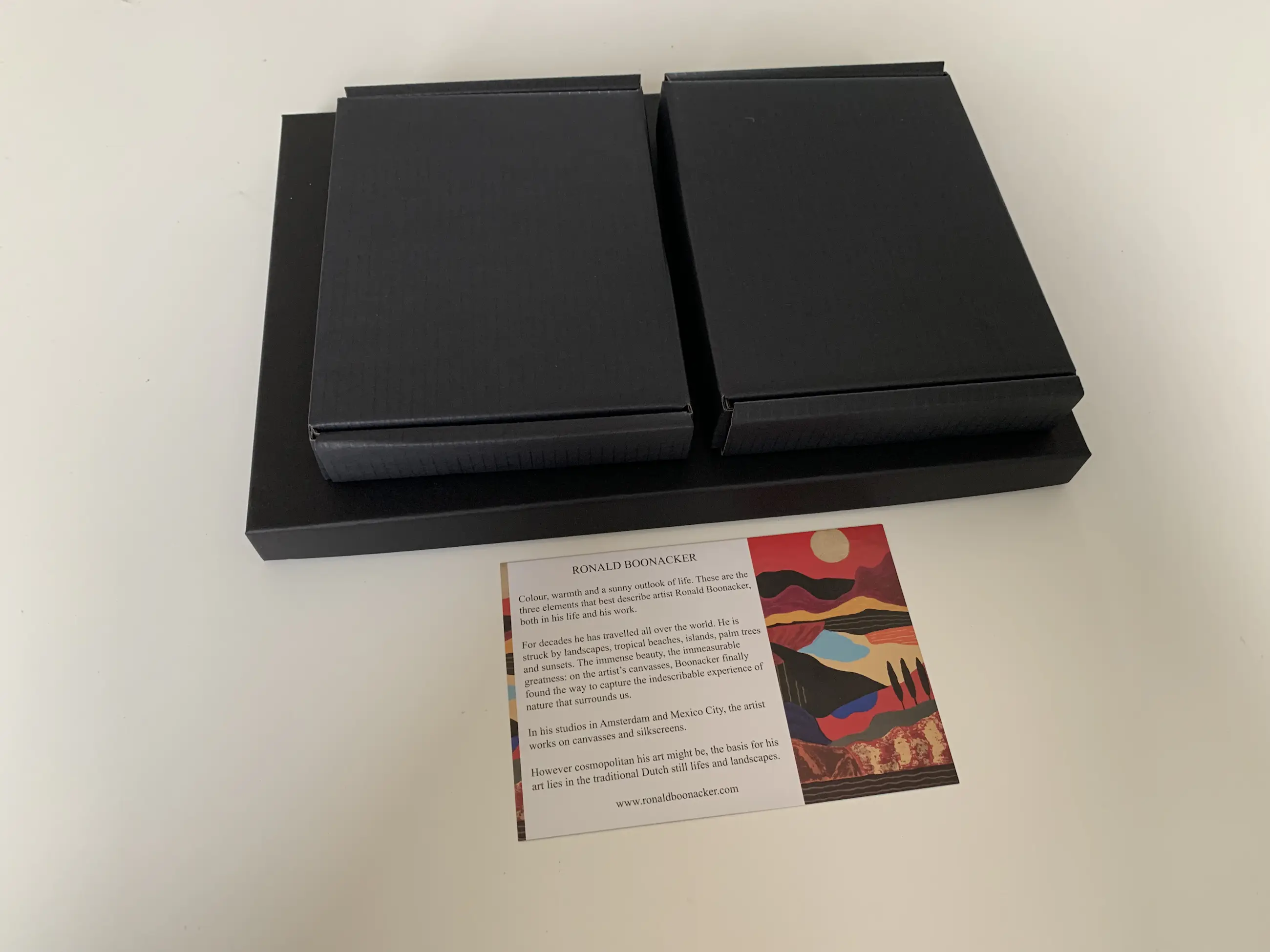 Verpakking per schaaltje in een kartonnen doosje met inlegvel beschrijving kunstenaar.