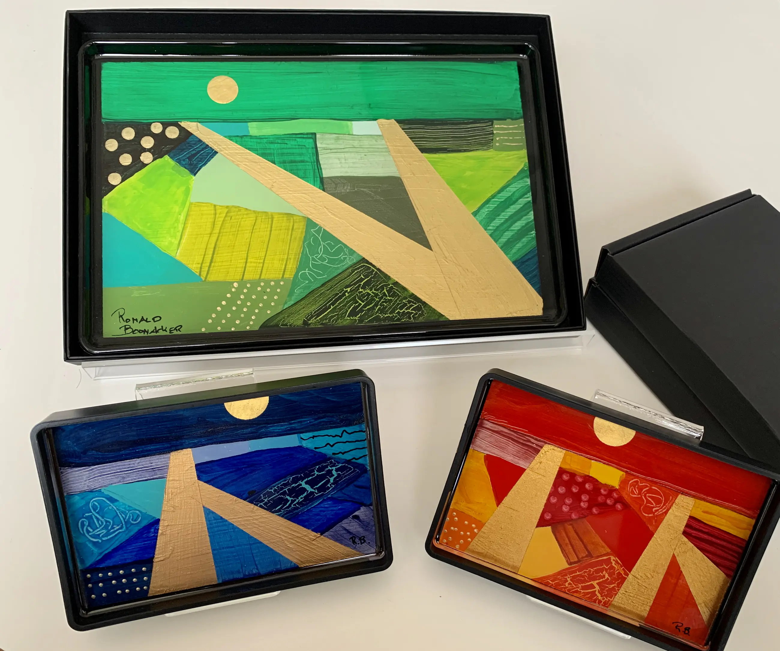 De kunstwerken zijn geschilderd op hout en vervolgens gegoten in kristal heldere Epoxy (harde kunsthars). De schaaltjes zijn van polycarbonaat/plastic, zwart.