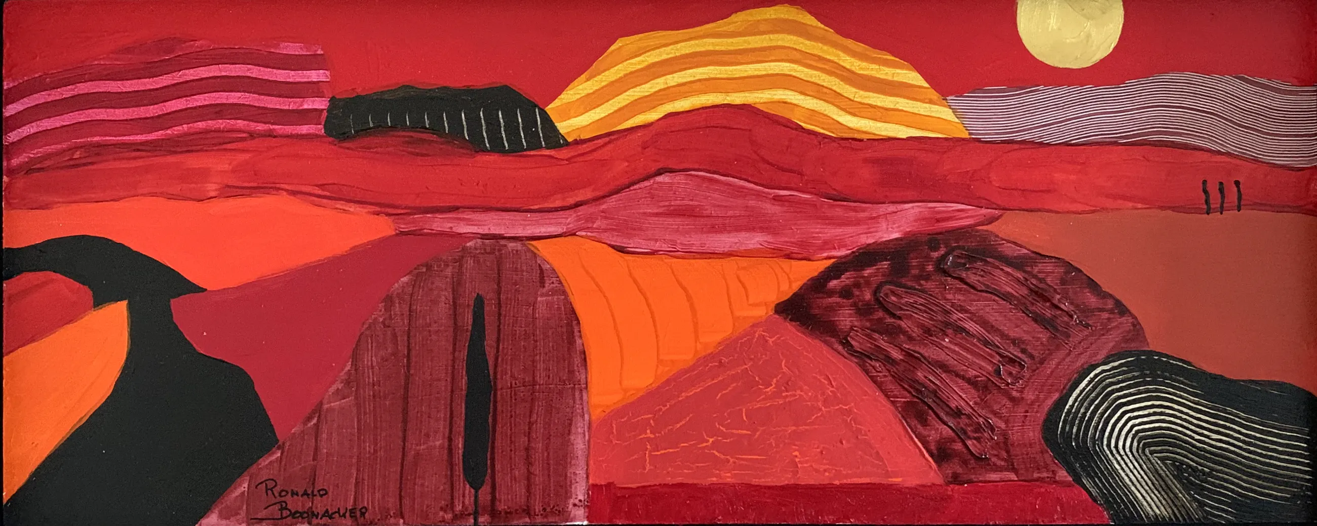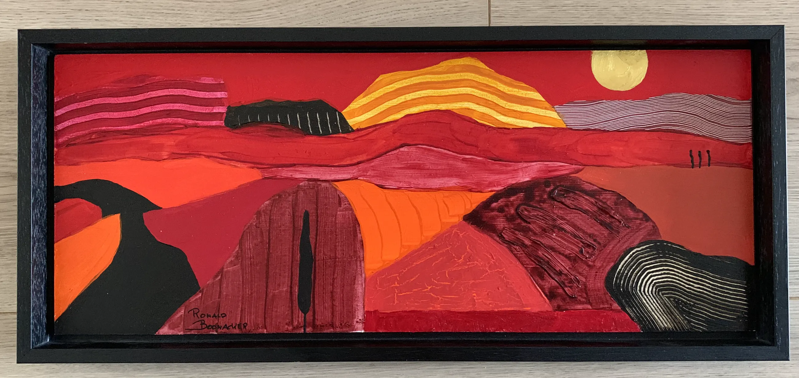 De serie is op paneel geschilderd met prachtige diepe kleuren en is ingelijst in een eenvoudige houten zwarte baklijst.