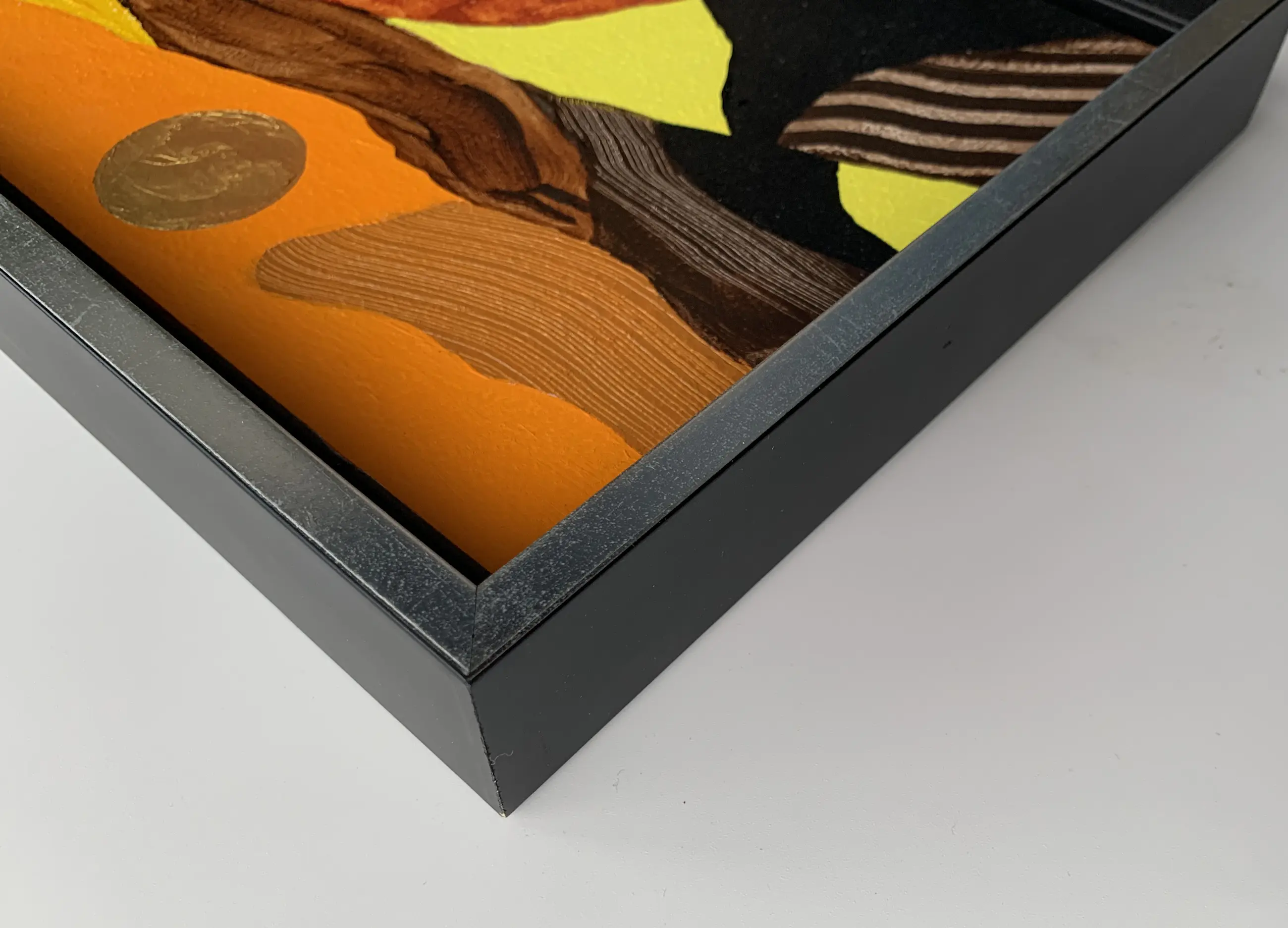 Geschilderd op hout en ingelijst in een luxe zwarte (met imitatiezilver opgelegde) baklijst.