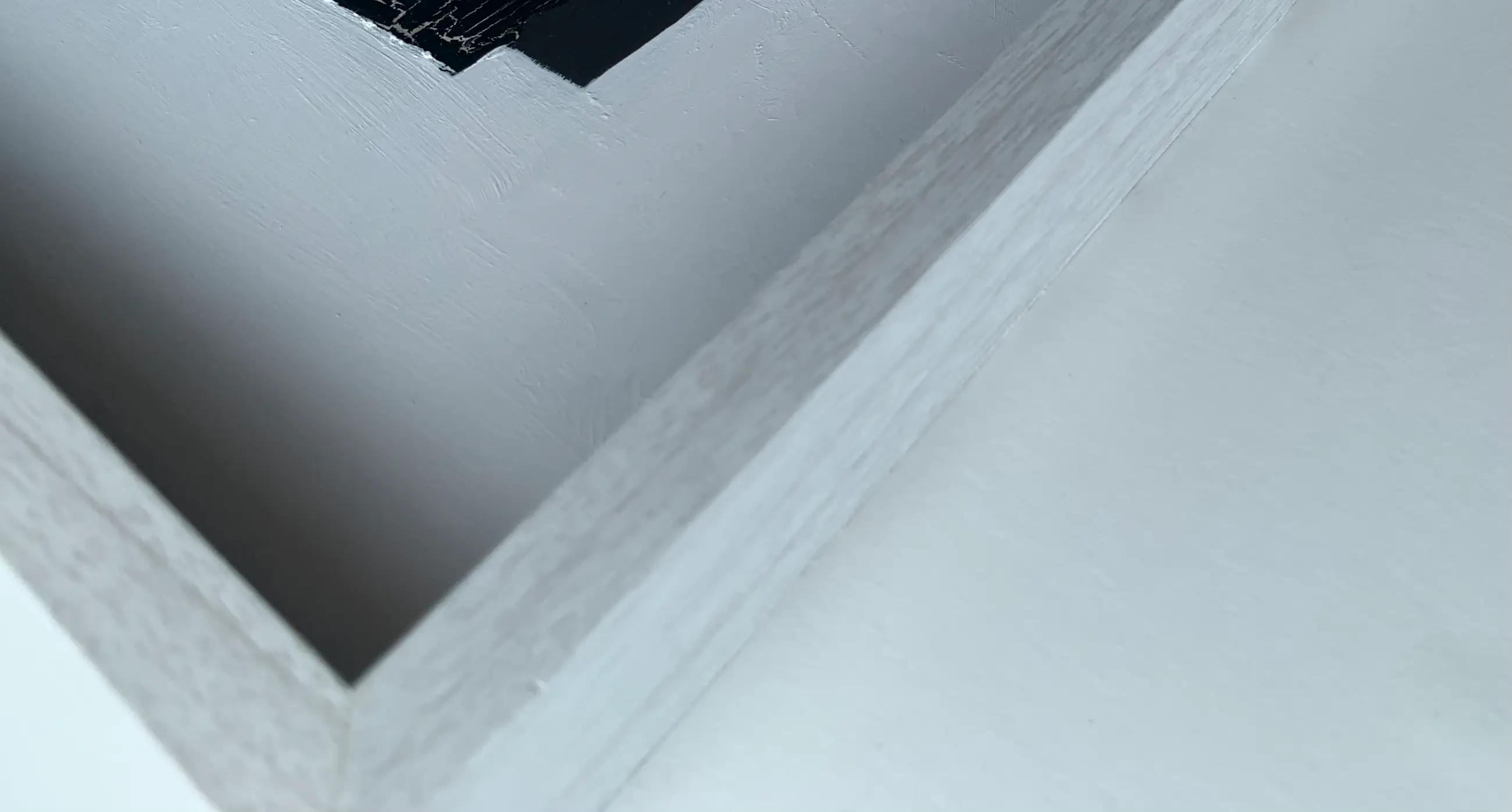 Ingelijst in een witte houten lijst, het kunstwerk ligt "diep" in de lijst en heeft een ophang haakje.