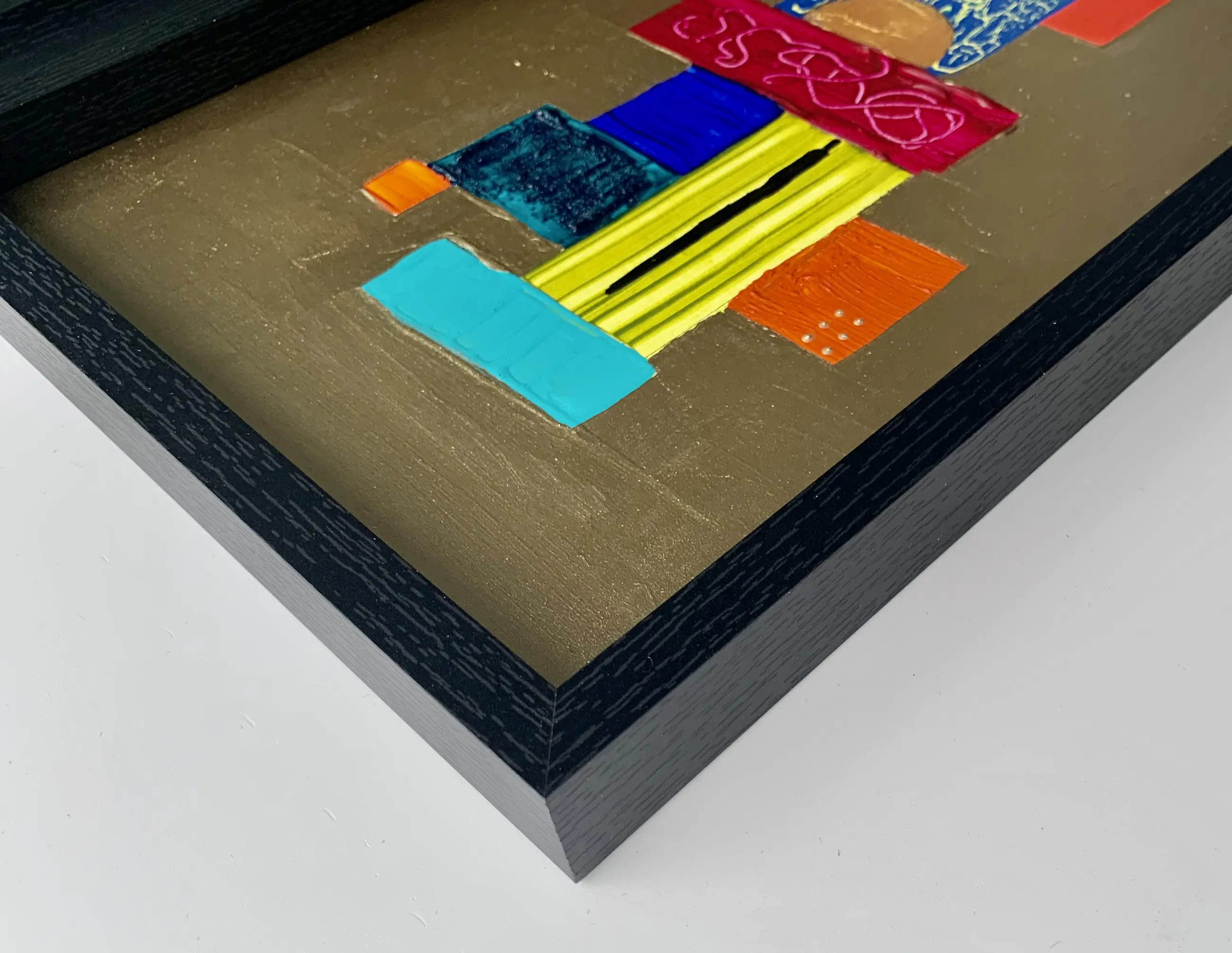 Ingelijst in een zwarte houten lijst, het kunstwerk ligt "diep" in de lijst en heeft een ophang haakje.
