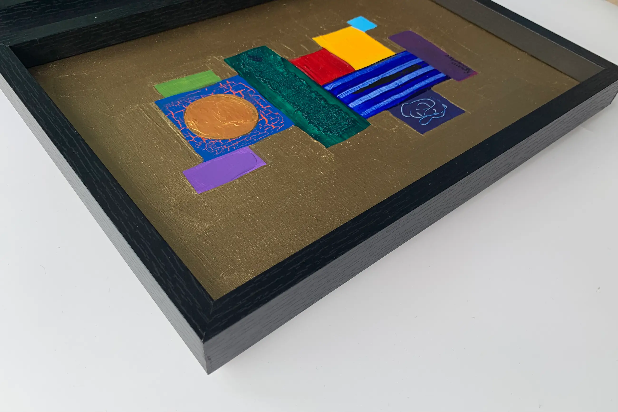 Ingelijst in een zwarte houten lijst, het kunstwerk ligt "diep" in de lijst en heeft een ophang haakje.