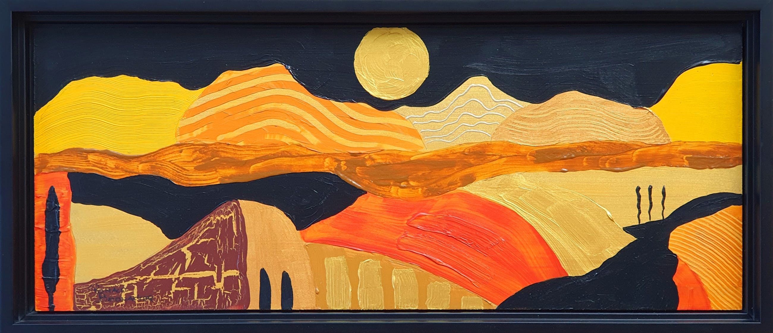Mooi schilderij met lijst van de Amsterdamse kunstenaar Ronald Boonacker. Geschilderd in acrylverf en voorzien van een zwarte baklijst. Kan zo aan de muur.