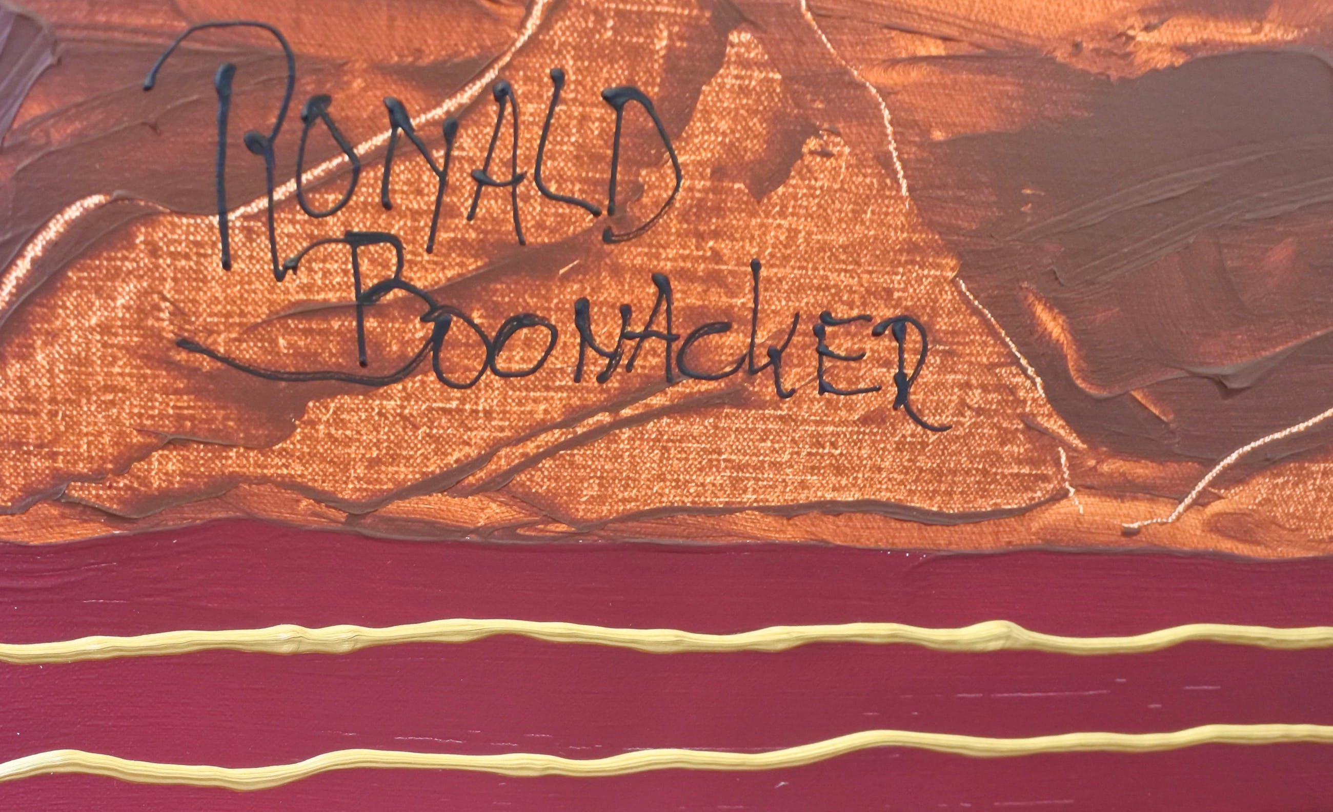 Prachtig schilderij met heldere pigmenten. Zon is 22 krt bladgoud. Diverse gedeeltes van het schilderij zijn met dikke lagen acryl aangebracht. Het luxe linnen-canvas is opgespannen op een houten/aluminium frame, daardoor kan het frame niet kan kromtrekken. Er is een staaldraad ophang systeem bevestigd. De zijkant is zwart geschilderd zodat het doek prachtig strak aan de muur kan hangen. Beeldformaat: 1 meter x 1 meter Gesigneerd links onder. CERTIFICAAT VAN ECHTHEID VAN KUNSTENAAR WORDT BIJGELEVERD. Het is schilderij is uitsluitend af te halen in Amsterdam of per Swiftkoerier te laten bezorgen (zie tarieven).