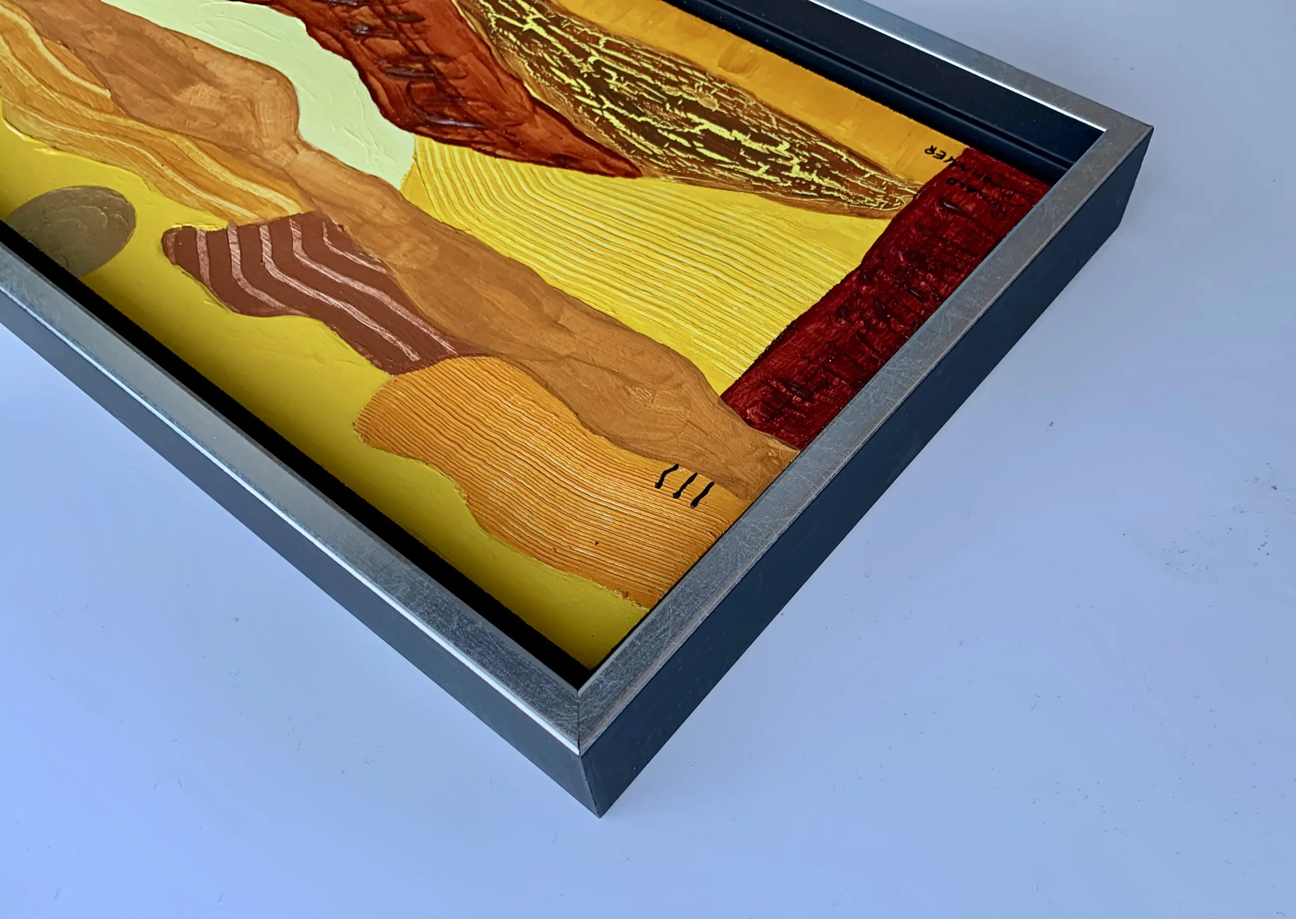 Geschilderd op hout en ingelijst in een mooie luxe zwarte met zilver opgelegde (imitatie) baklijst.