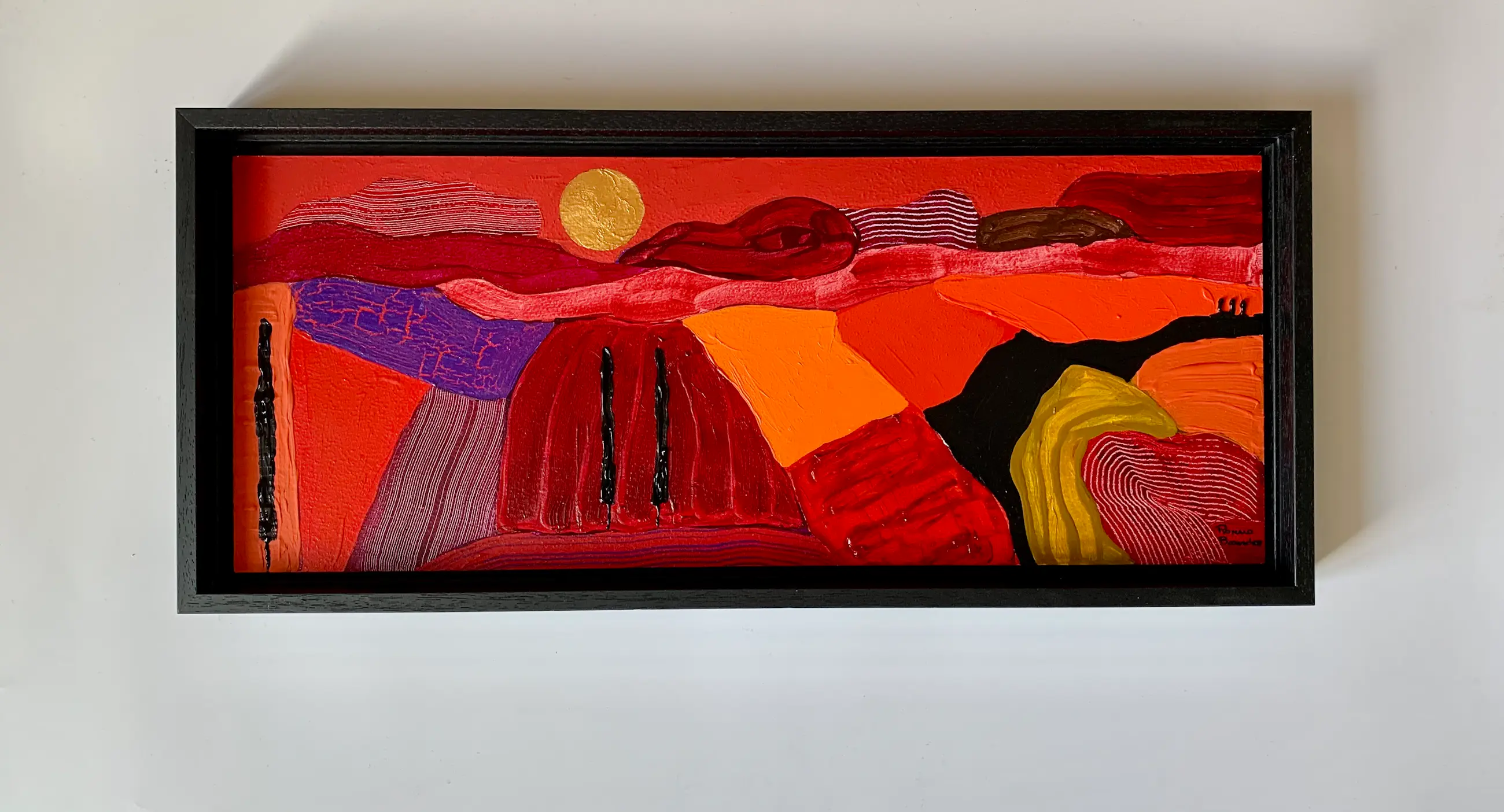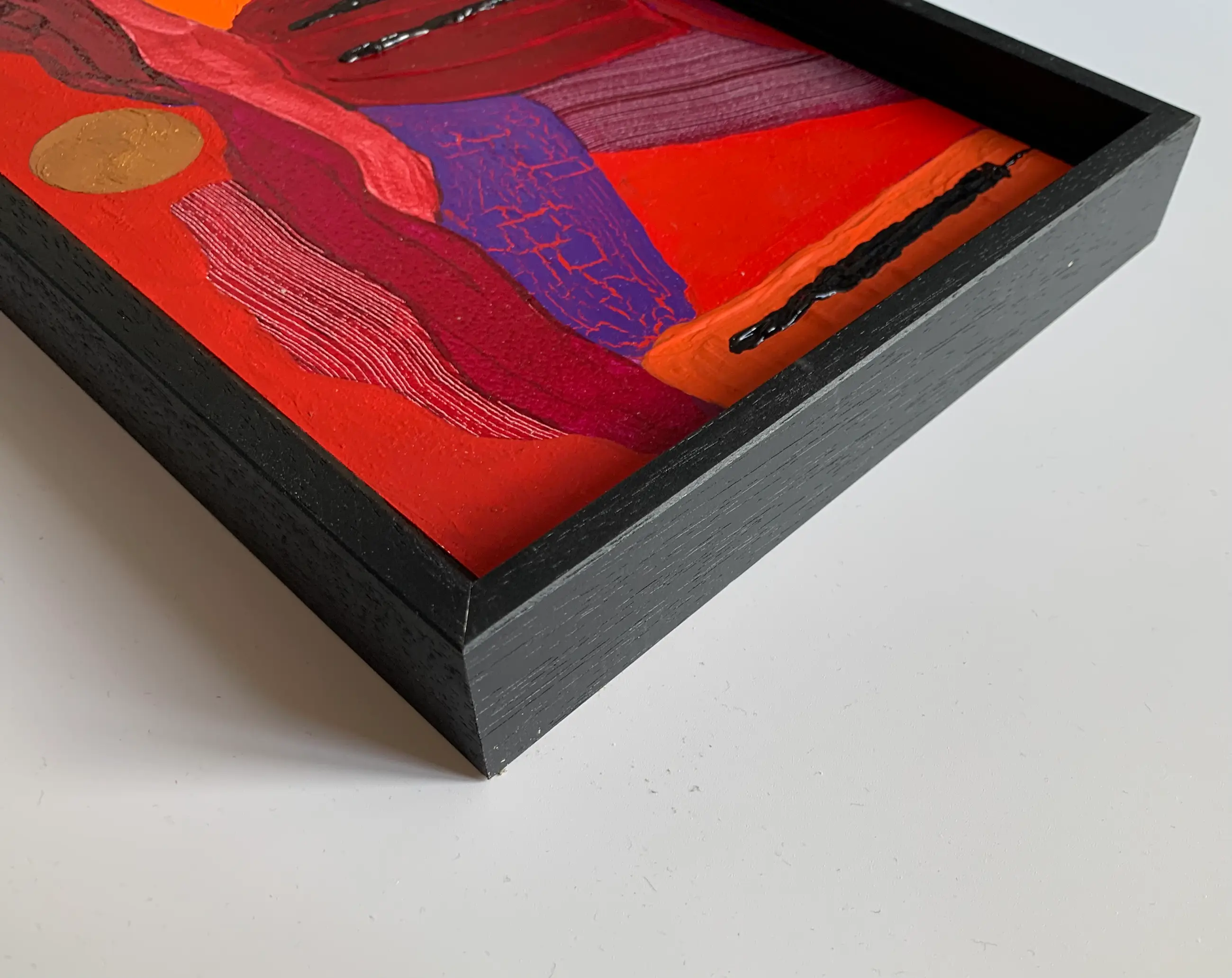 Geschilderd op hout en ingelijst in een mooie zwarte baklijst.