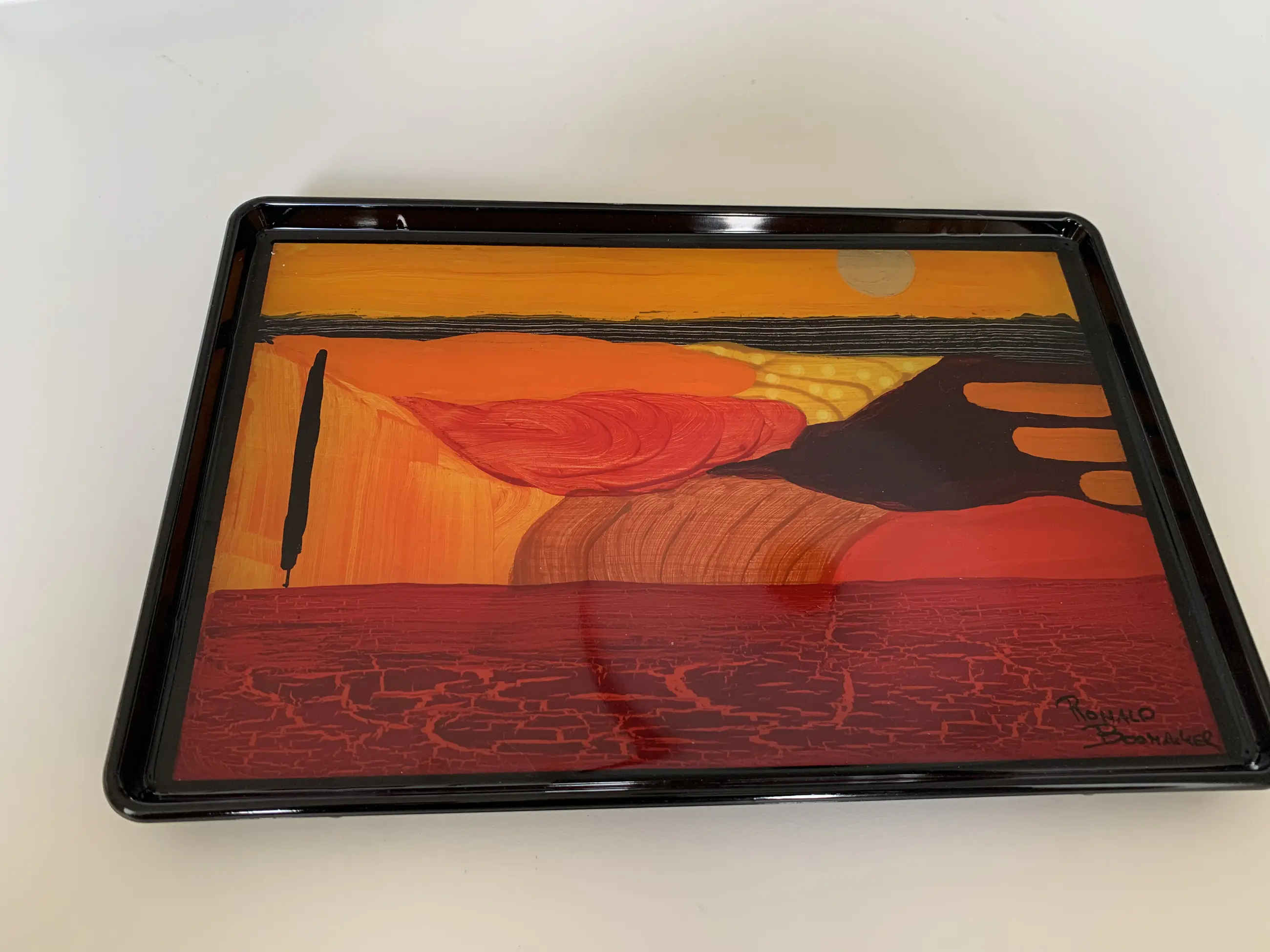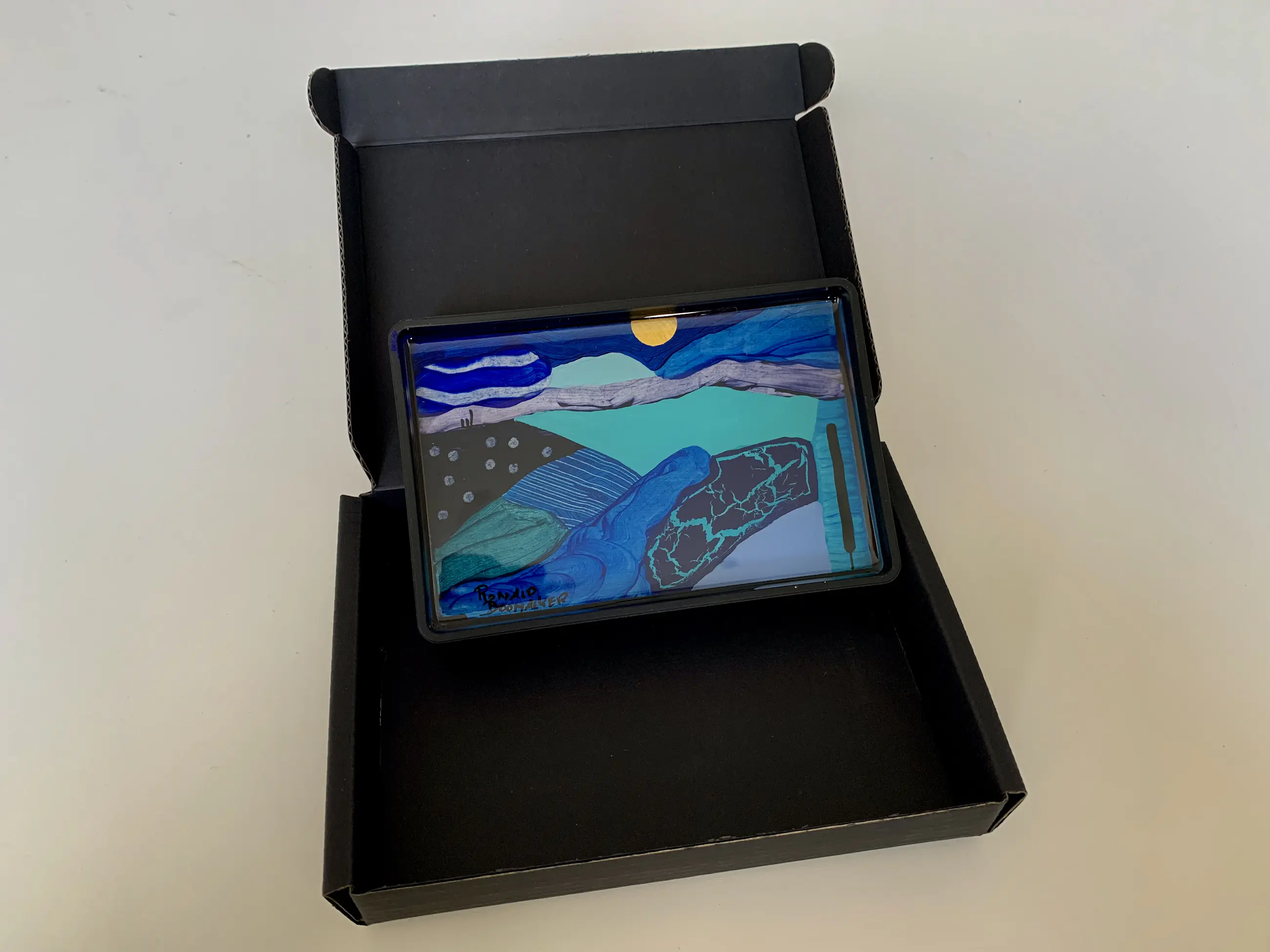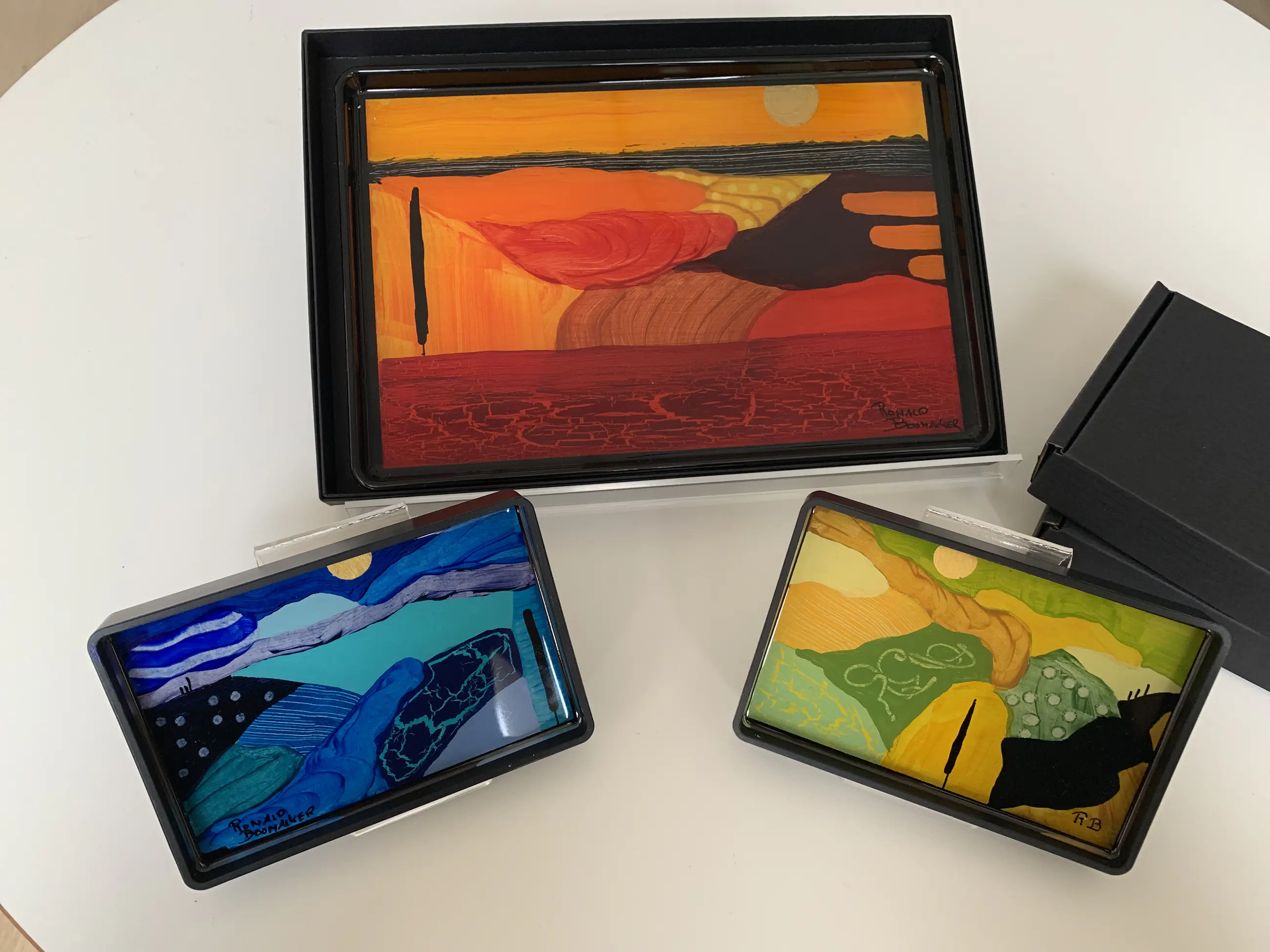 De kunstwerken zijn geschilderd op hout en vervolgens gegoten in kristal heldere Epoxy (harde kunsthars). De schaaltjes zijn van polycarbonaat/plastic, zwart.