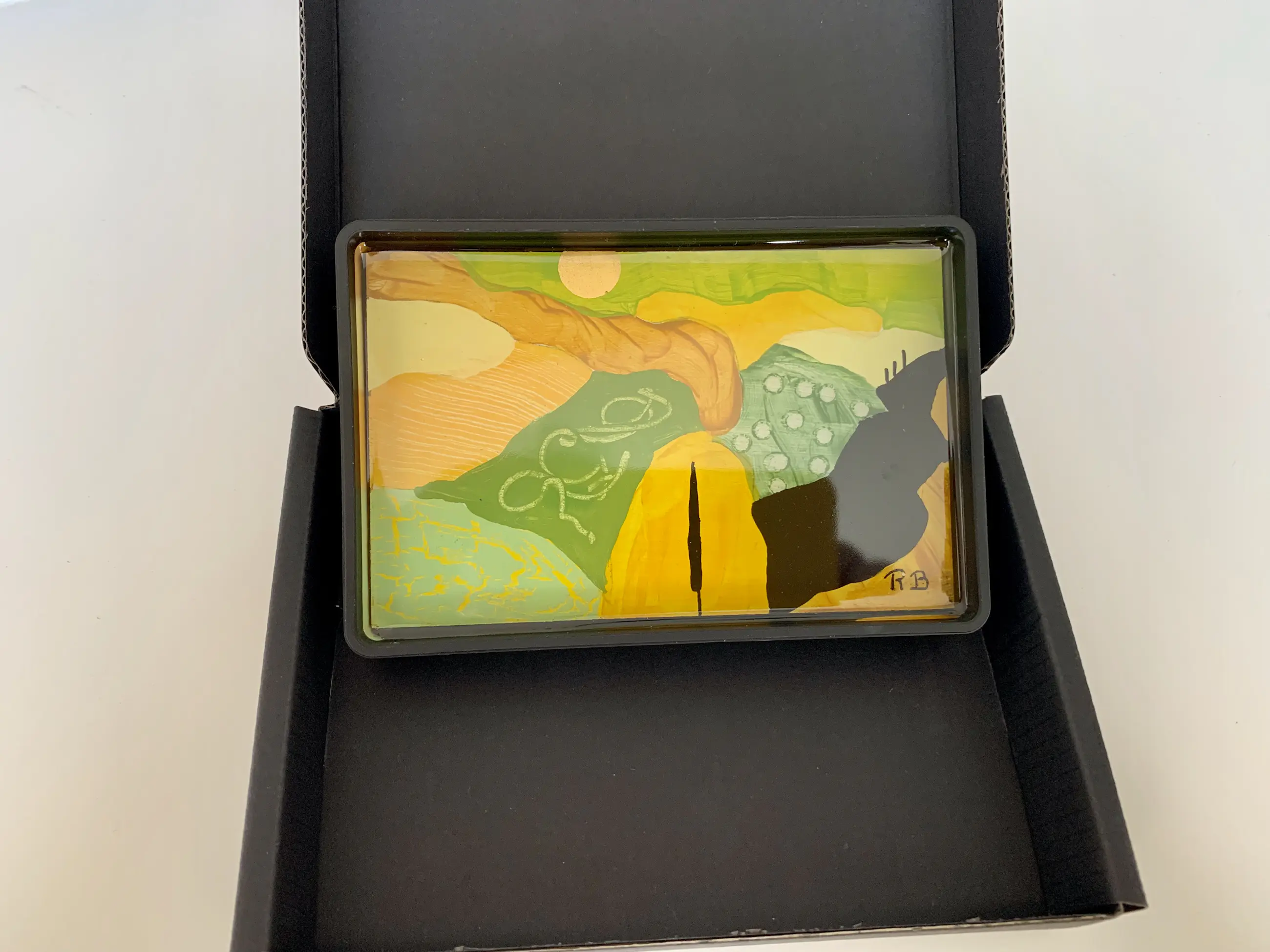 Verpakking per schaaltje in een kartonnen doosje met inlegvel beschrijving kunstenaar.