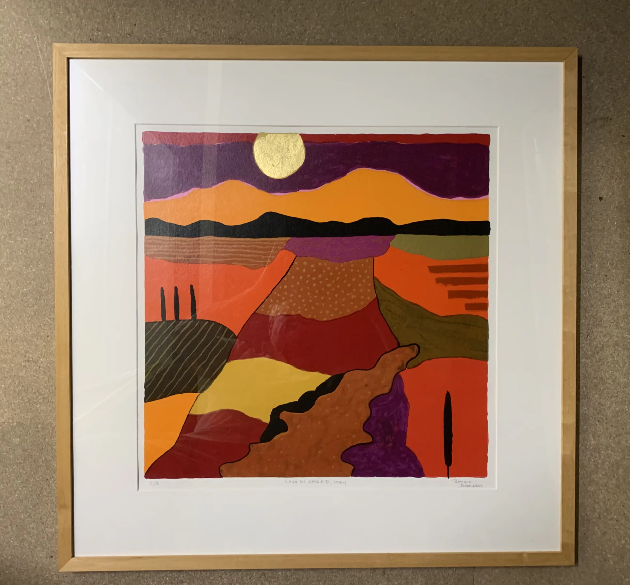 Ingelijste zeefdruk in een houten lijst achter glas.