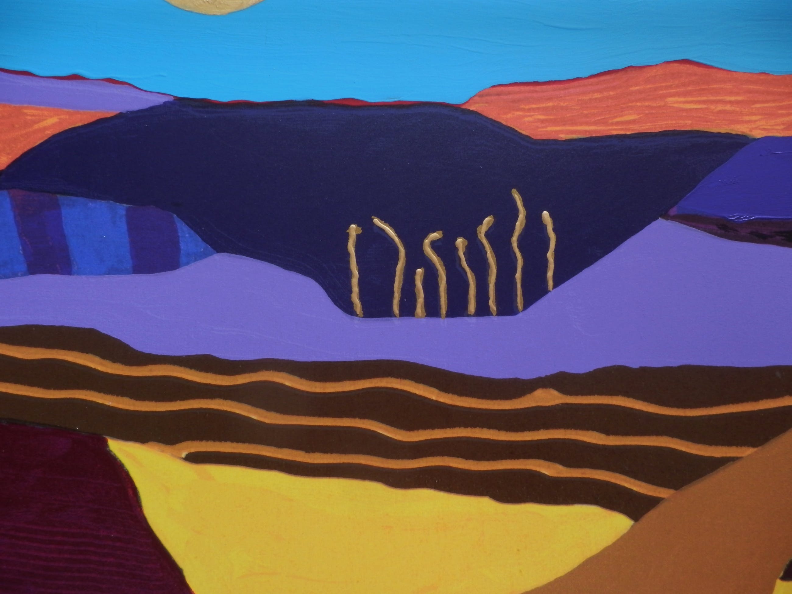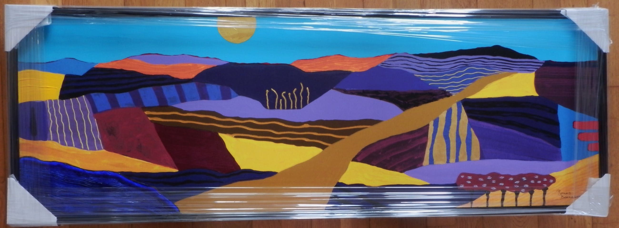 Titel werk: ROUTE DU SOLEIL. Zeer fraaie kleurenzeefdruk op paneel in zwart houten baklijst. De zeefdruk is op verschiilende plaatsen door Ronald Boonacker bewerkt met acrylverf. Afmeting zwart houten baklijst 123 x 43 cm in zeer goede staat. Het werk is gesigneerd en genummerd 2/80