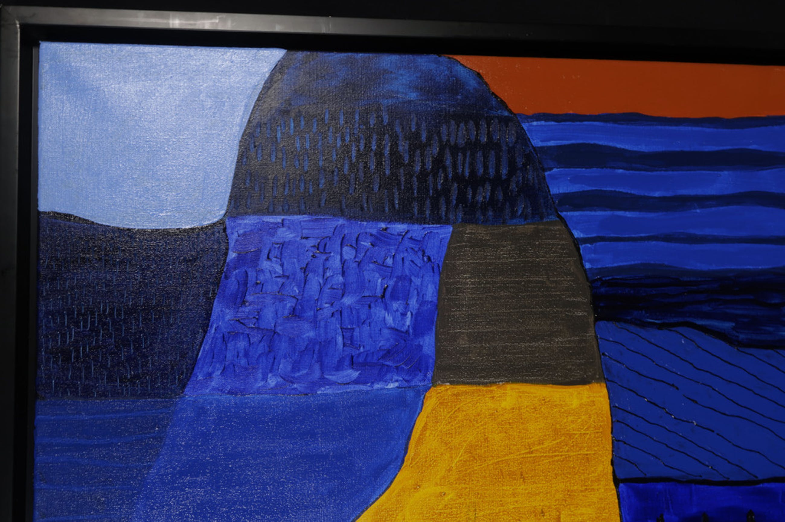 Conditie kunstwerk: In goede staat, maar met een lichte kras in het bovenste blauwe deel van de berg. Lichte golving in het doek linksboven, lijkt op de foto duidelijker zichtbaar dan in het echt.