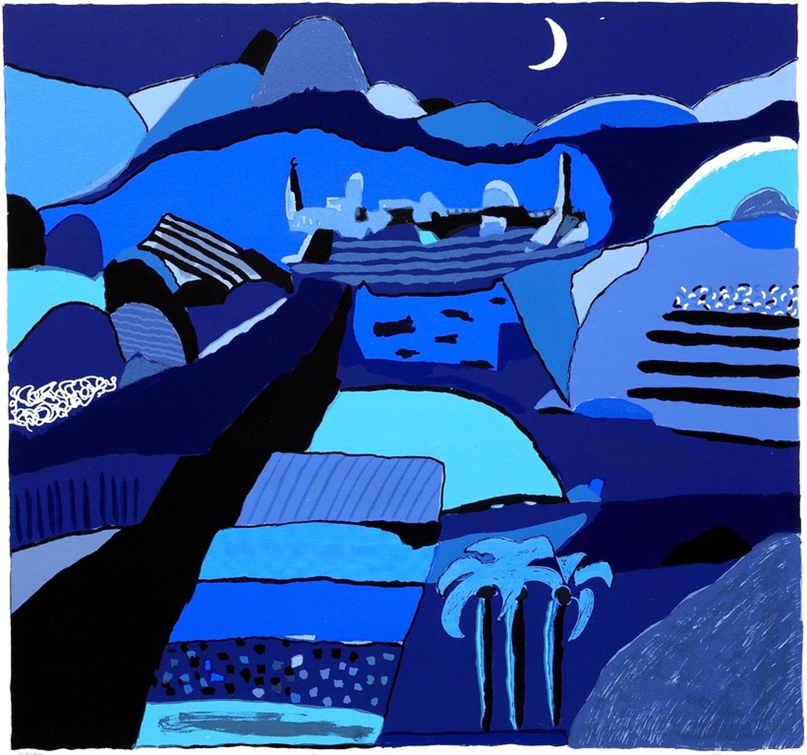 Cobalt-, Pruisisch-, Ultramarine-,Indigo-blauwen en parelmoer gezeefdrukt op dik zuurvrij papier
