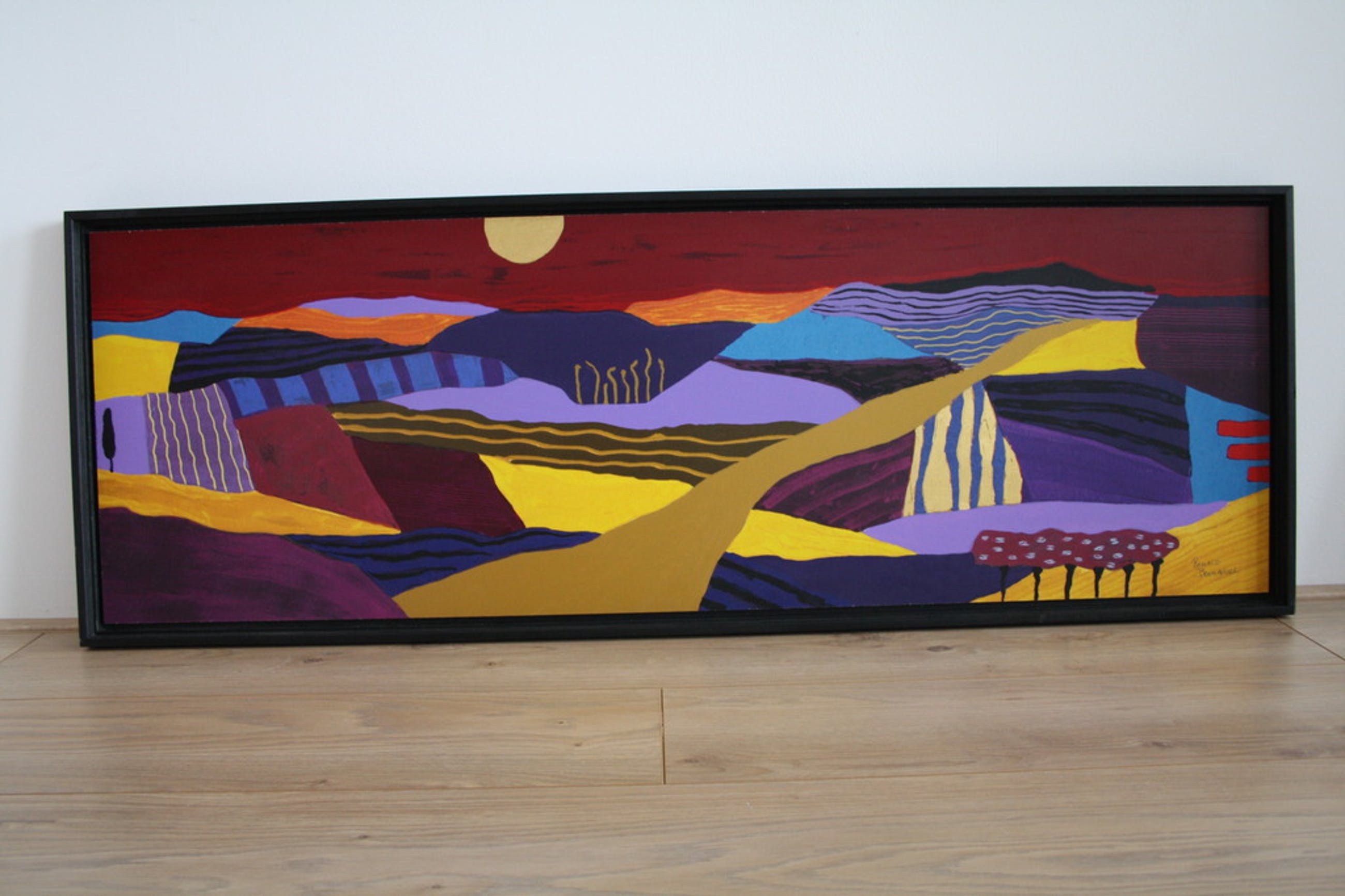 De zeefdruk is gedrukt op hout en is niet achter glas ingelijst.
