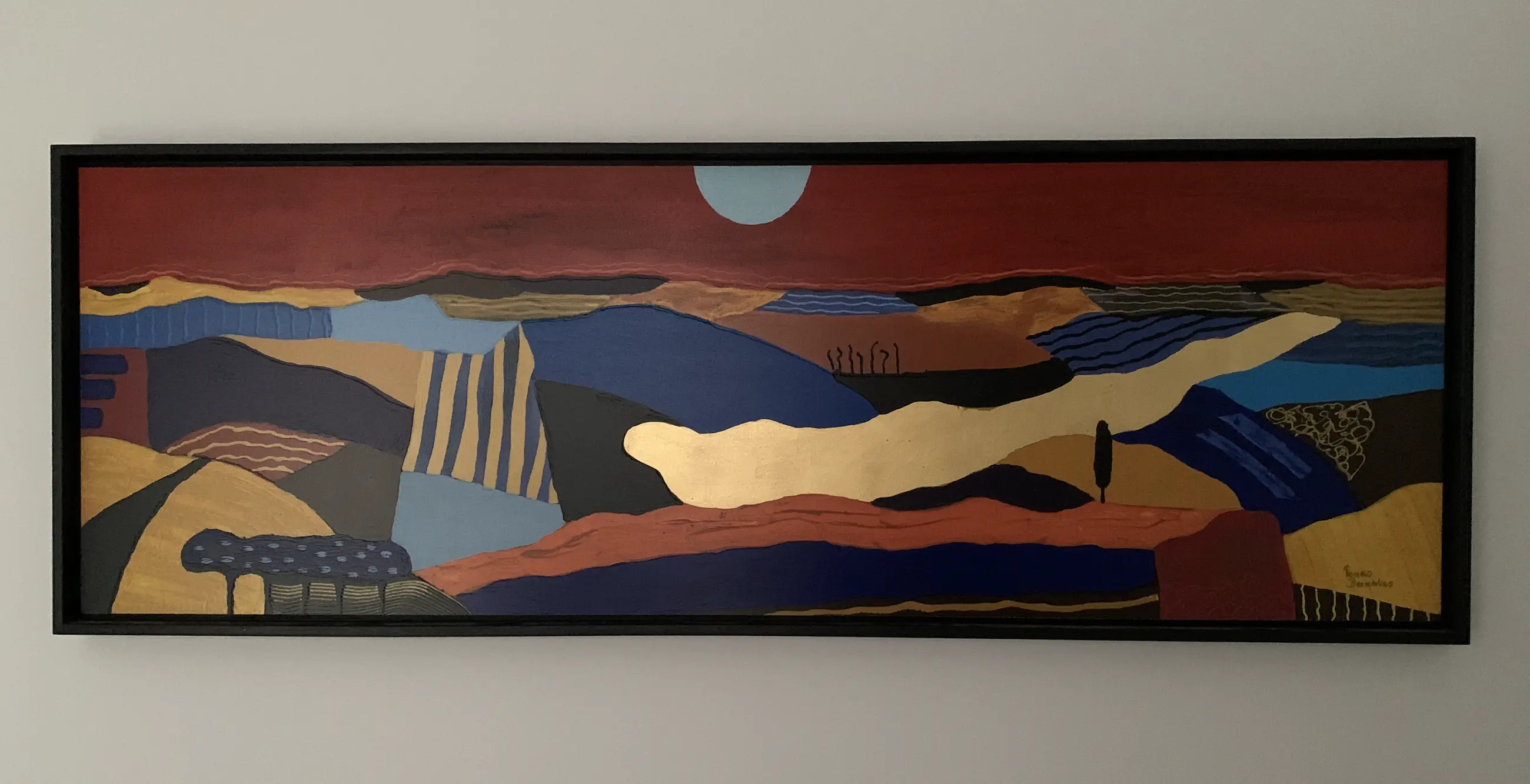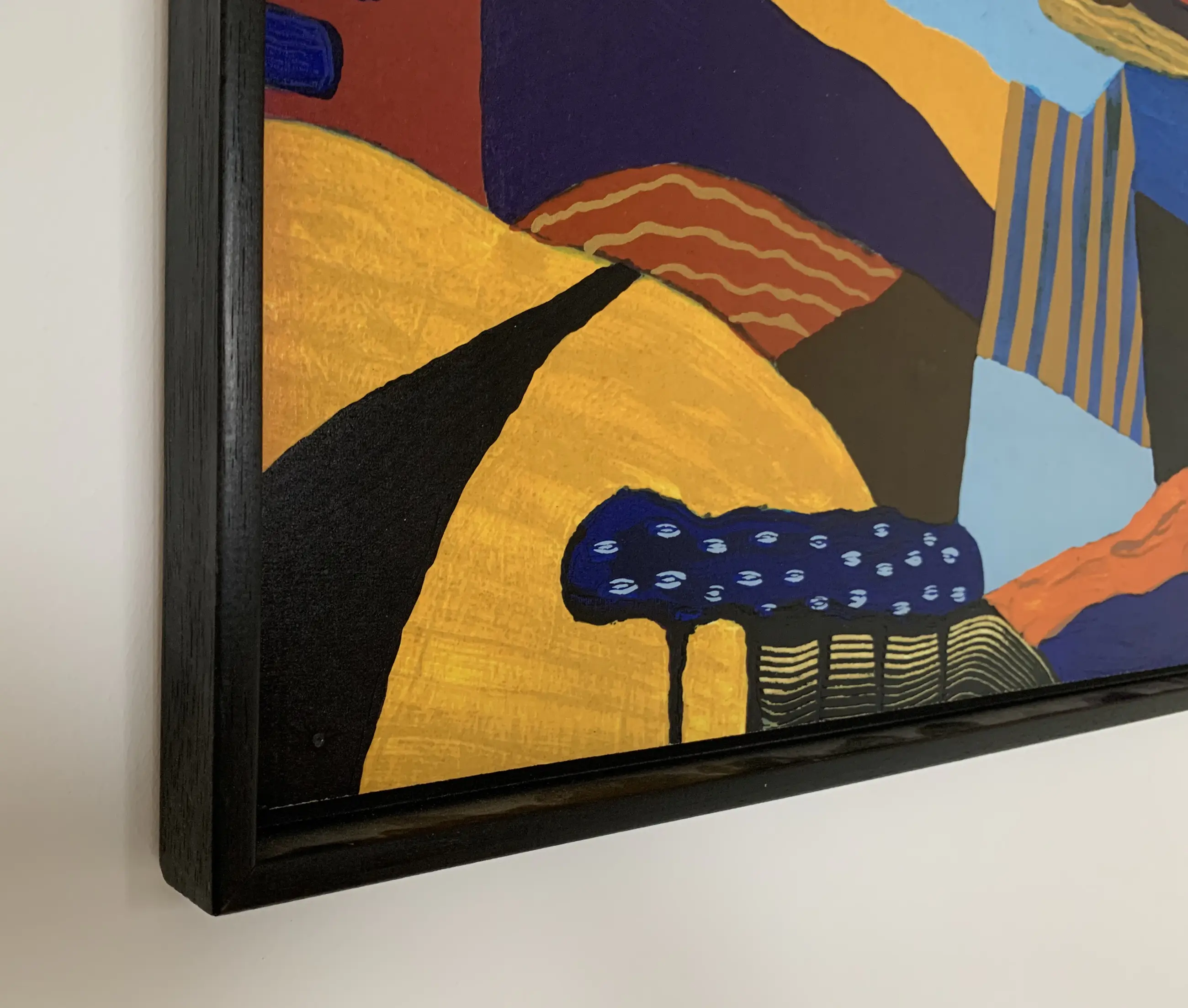 Ingelijst in houten zwarte baklijst/ Stalen ophang draad bevestigd