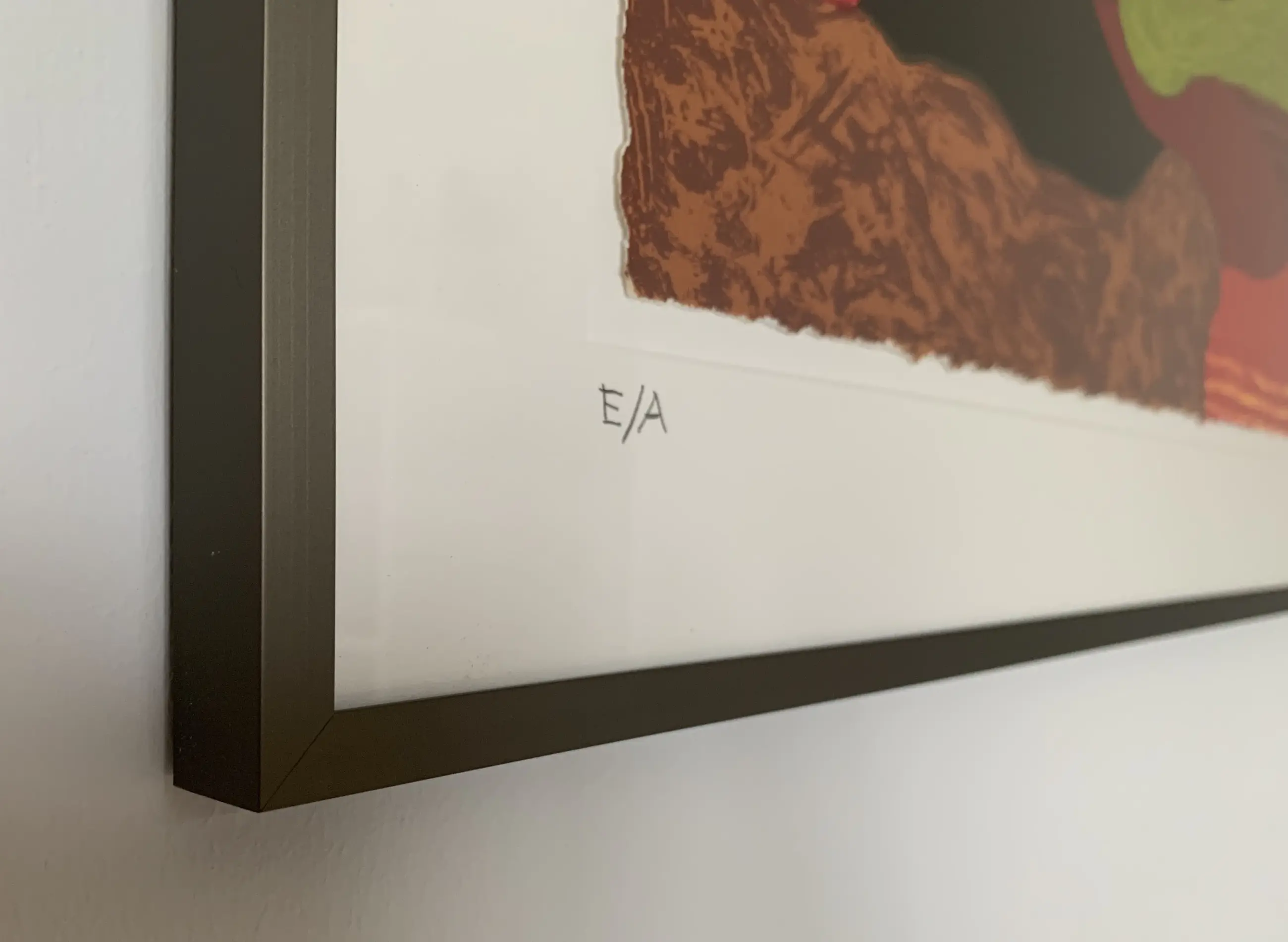 Zeefdruk (geen digitale print) op hoogwaardig 250 grams zuurvrij papier van Hahnemuehle. incl. zuurvrij passepartout. Zuurvrij papier vergeeld/verkleurd niet. De zeefdruk is achter glas.