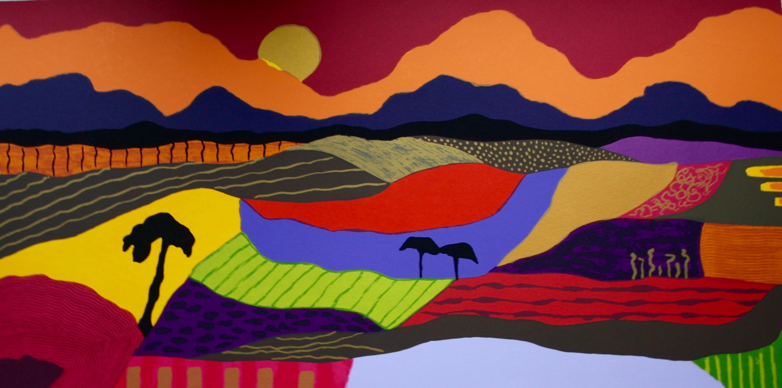 Titel: Tanzania III Zeefdruk Beeldformaat: 45 x 90 cm Bladformaat: 45 x 90 cm (geschept/ gekarteld) 25-28 Kleurendruk op 250 grams zuurvrij papier Oplage: E/A Epreuve d'artiste Heldere kleuren !! Gesigneerd met potlood