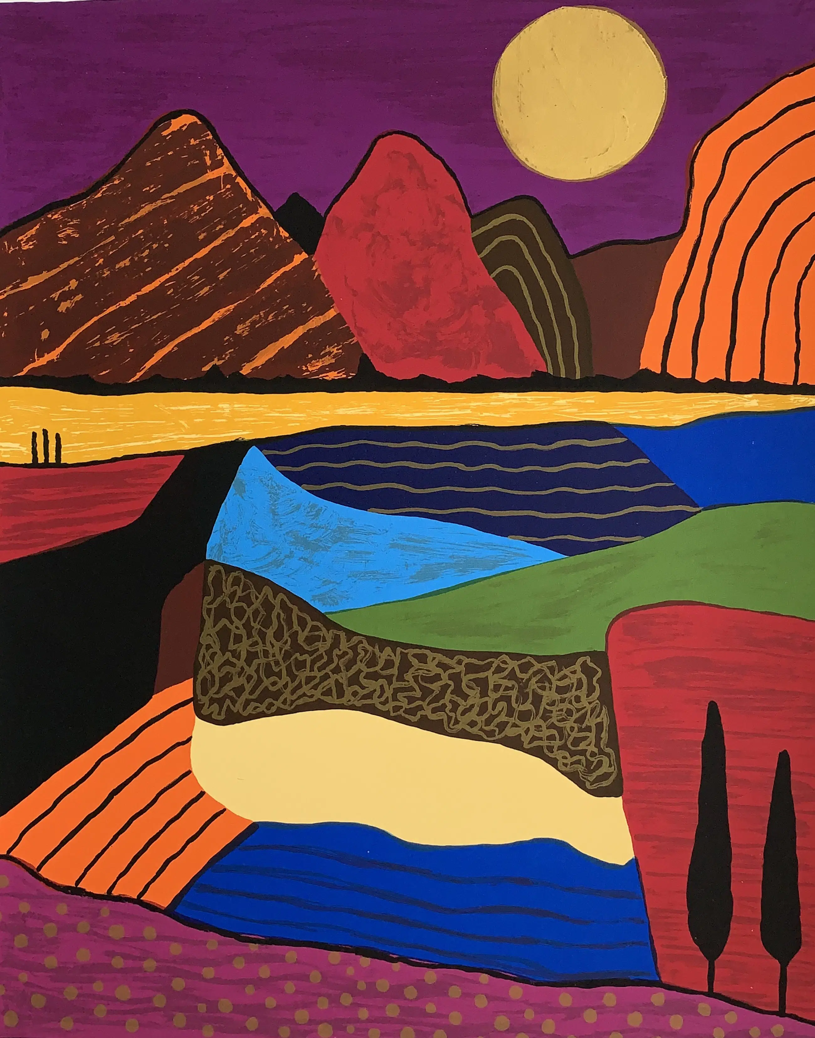 Ingelijste zeefdruk in een aluminium lijst achter glas.
