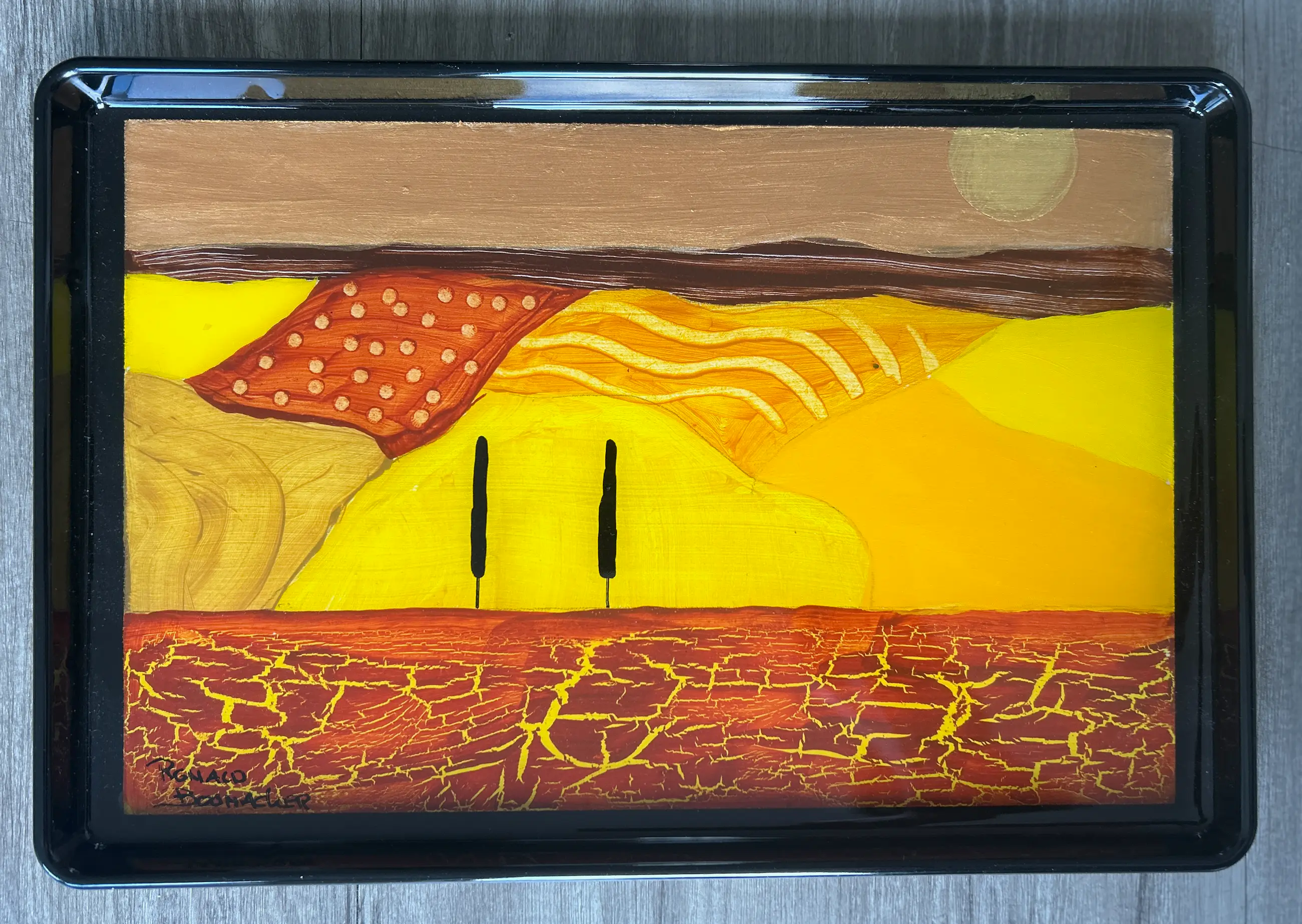 Dit schaaltje / dienblad heeft hij geschilderd in acrylverf en daarna overgoten met een laag epoxy.