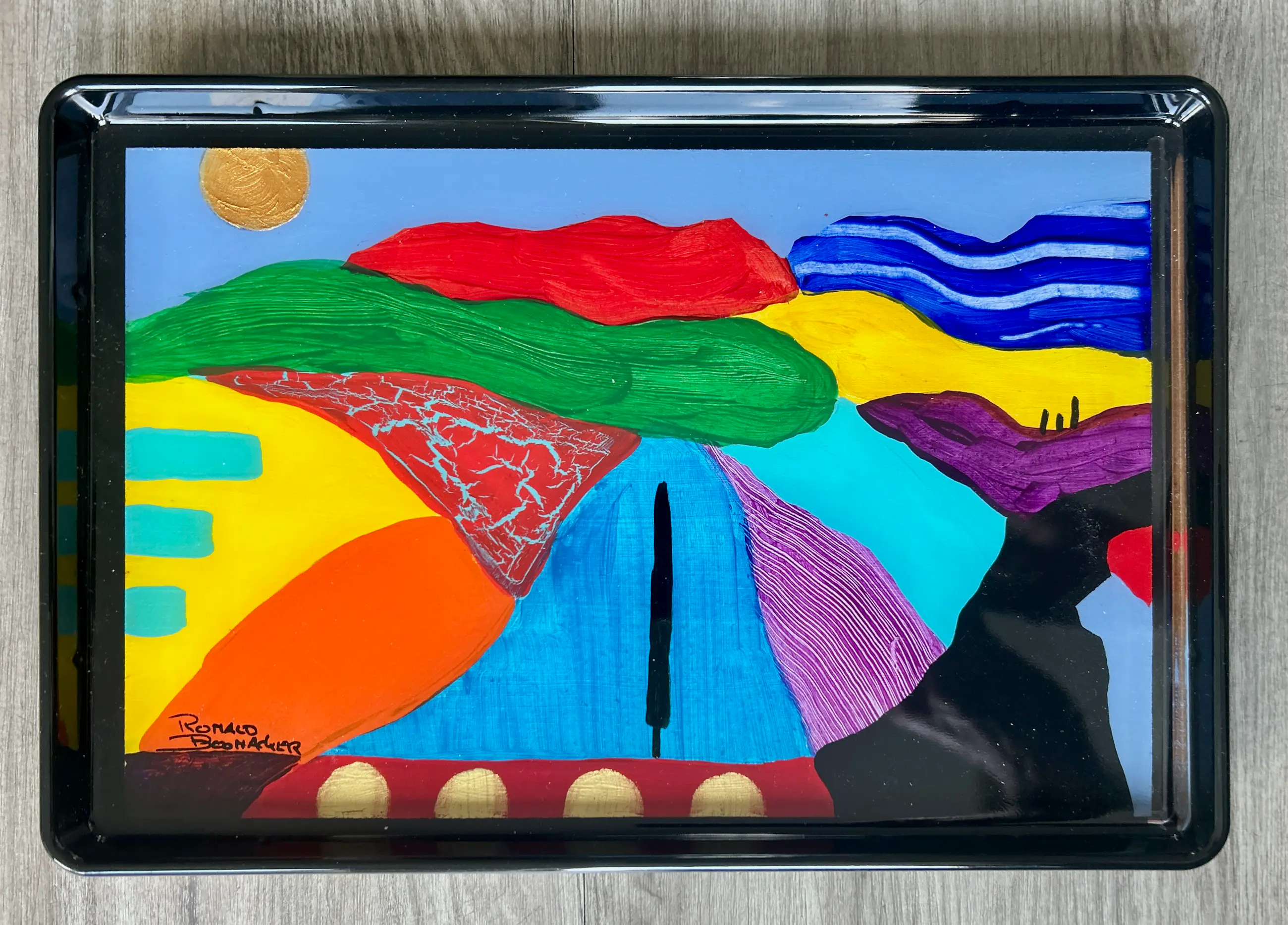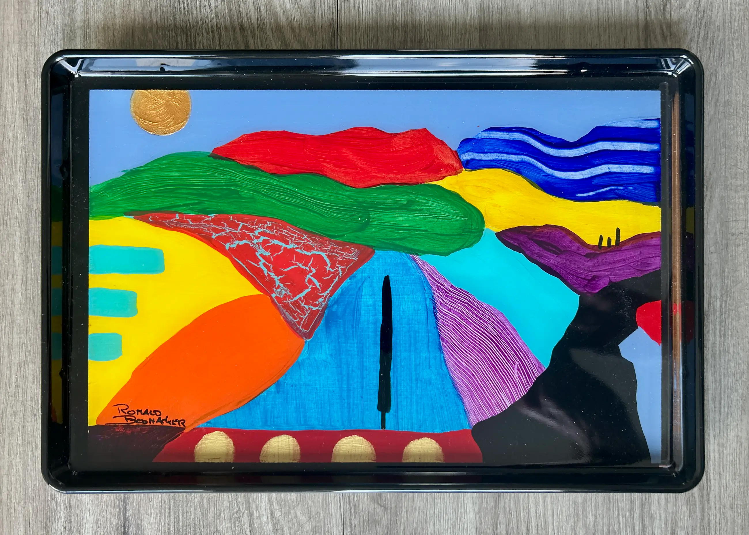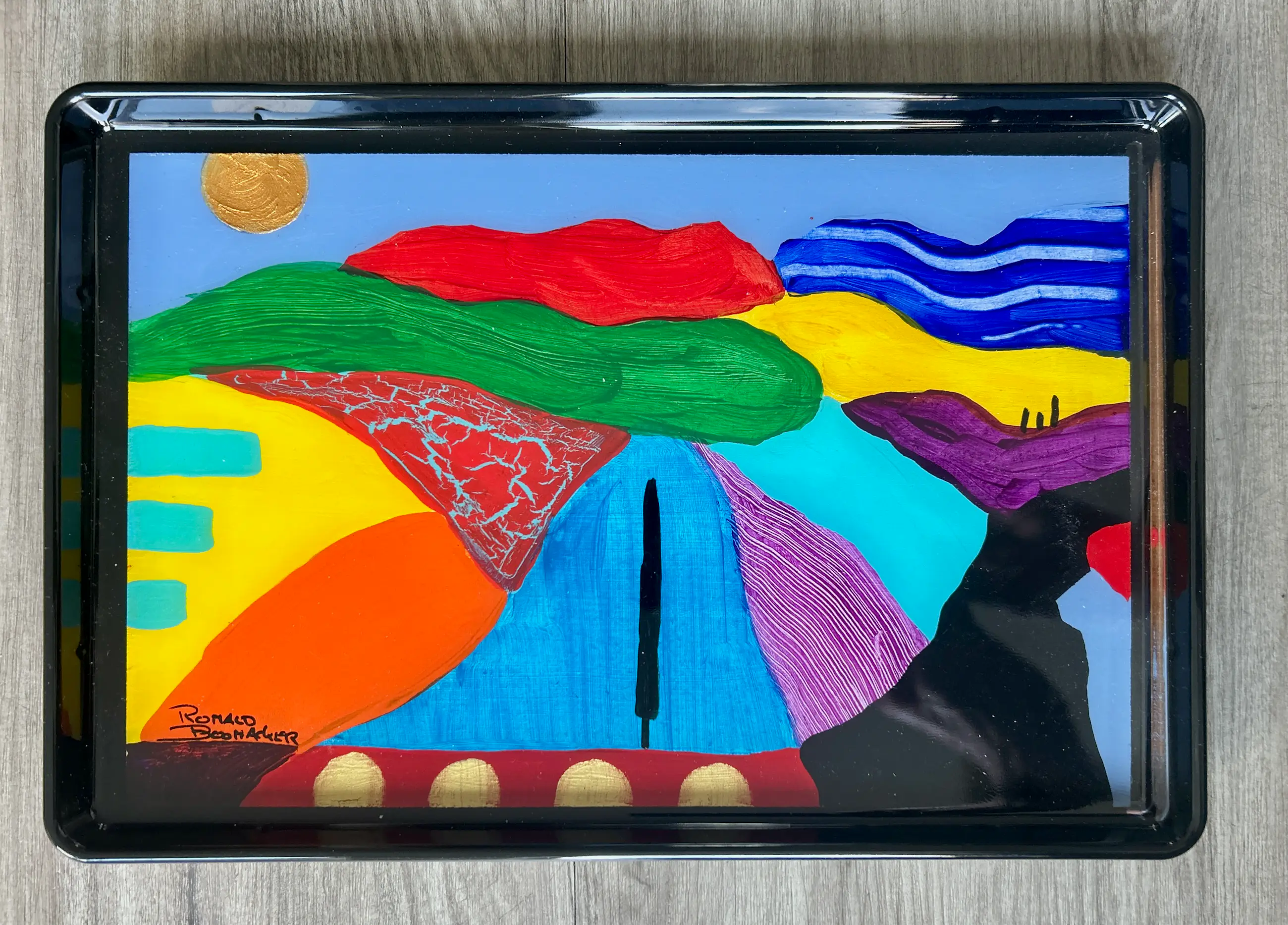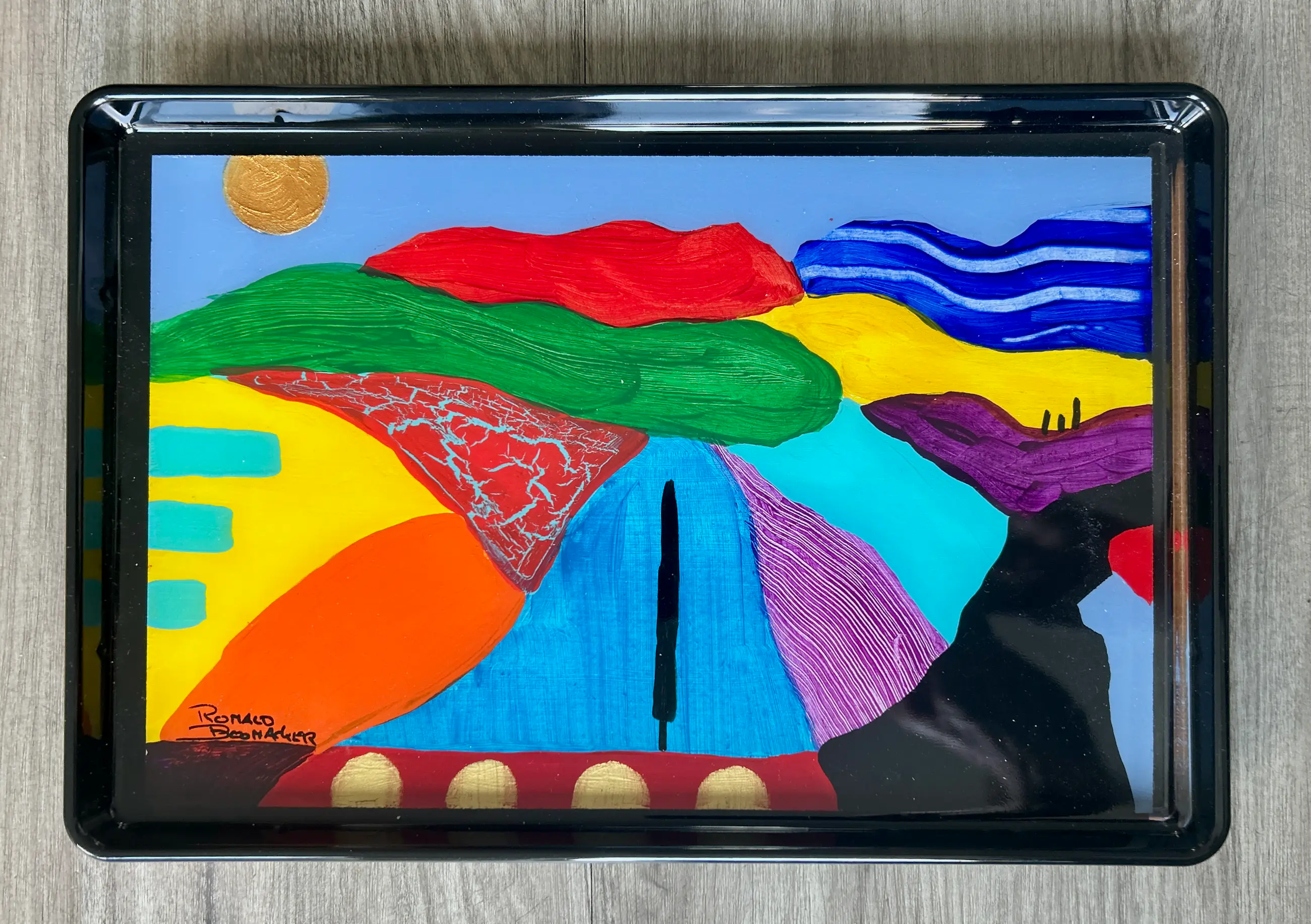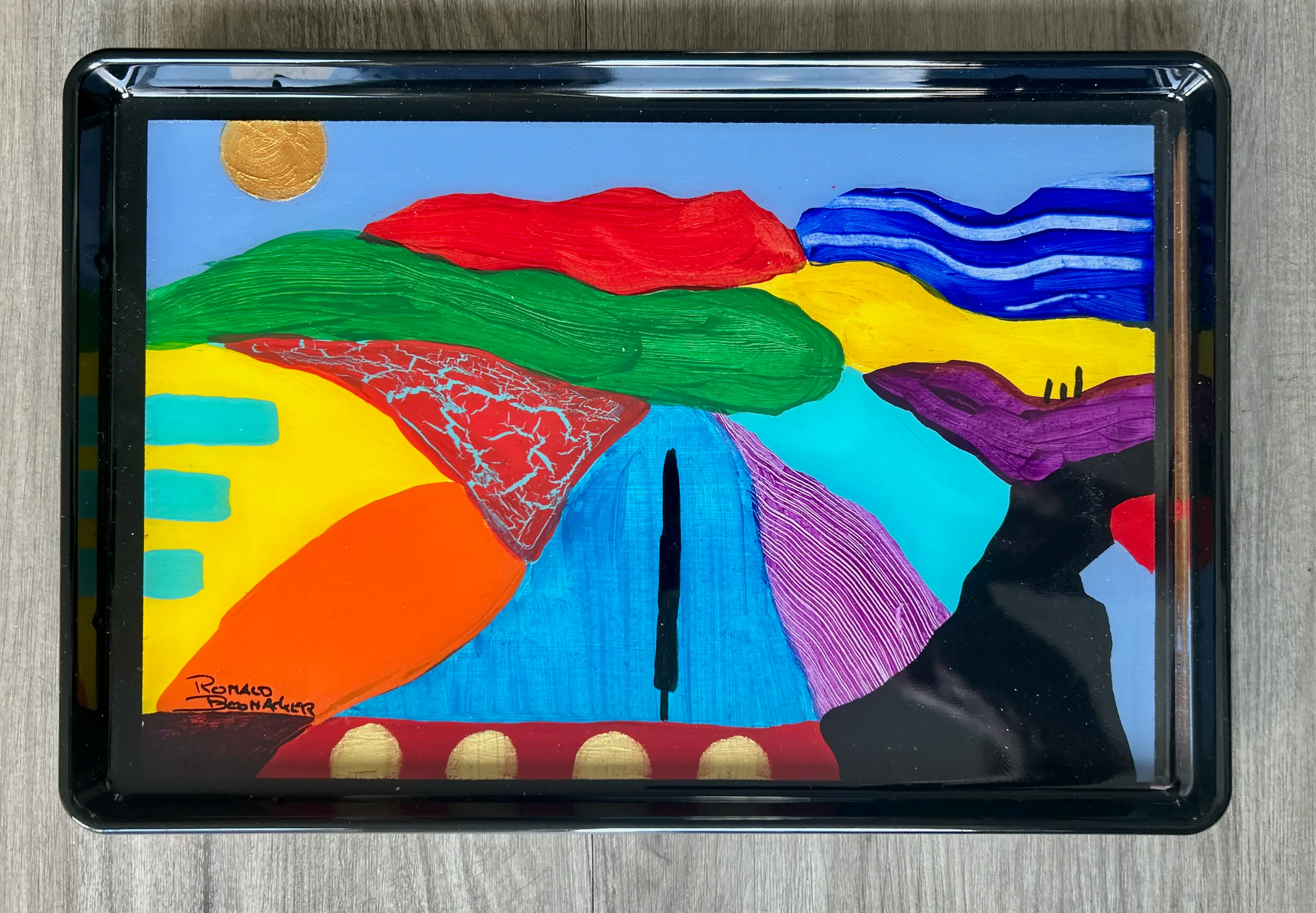 Conditie: uitstekend. Kleurrijk en Limited Edition werk van de Amsterdamse kunstenaar Ronald Boonacker. Dit schaaltje / dienblad heeft hij geschilderd in acrylverf en daarna overgoten met een laag epoxy. Kan dienen als schaaltje / dienblad maar kan ook aan de muur gehangen worden, zie laatste foto als voorbeeld.