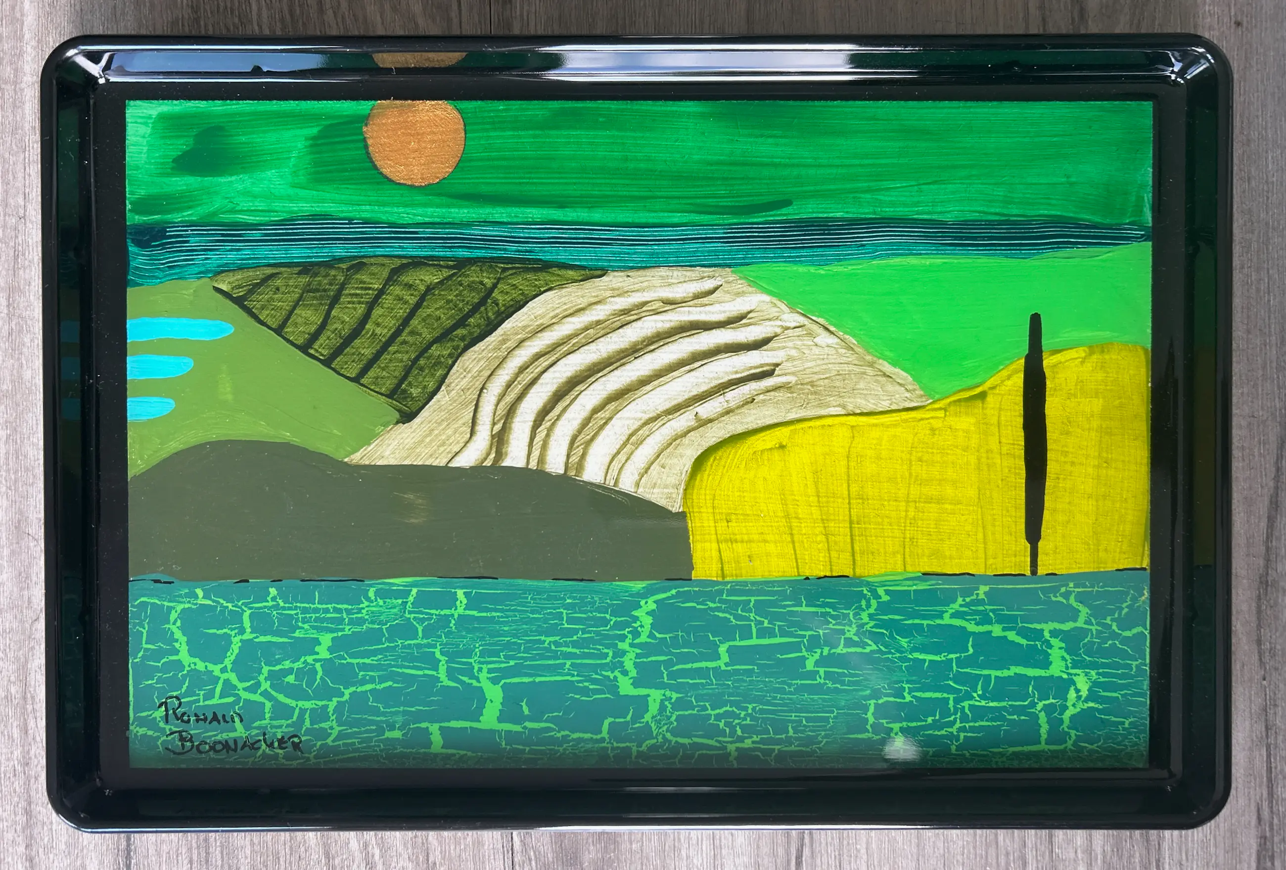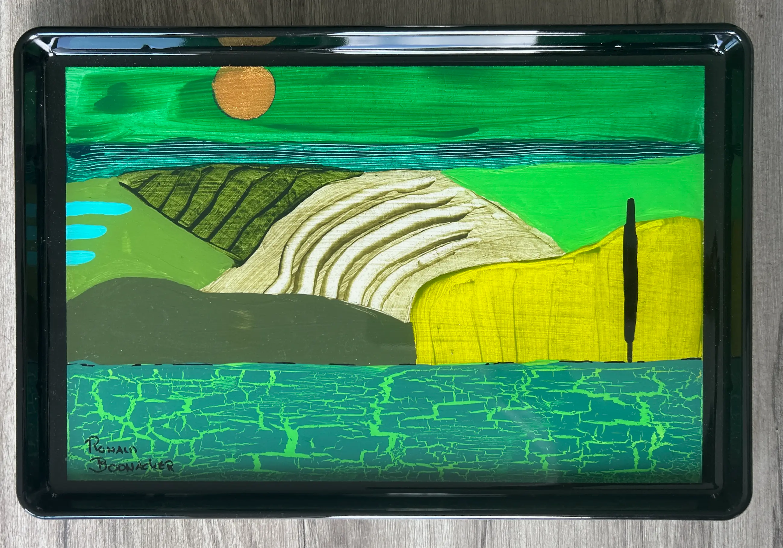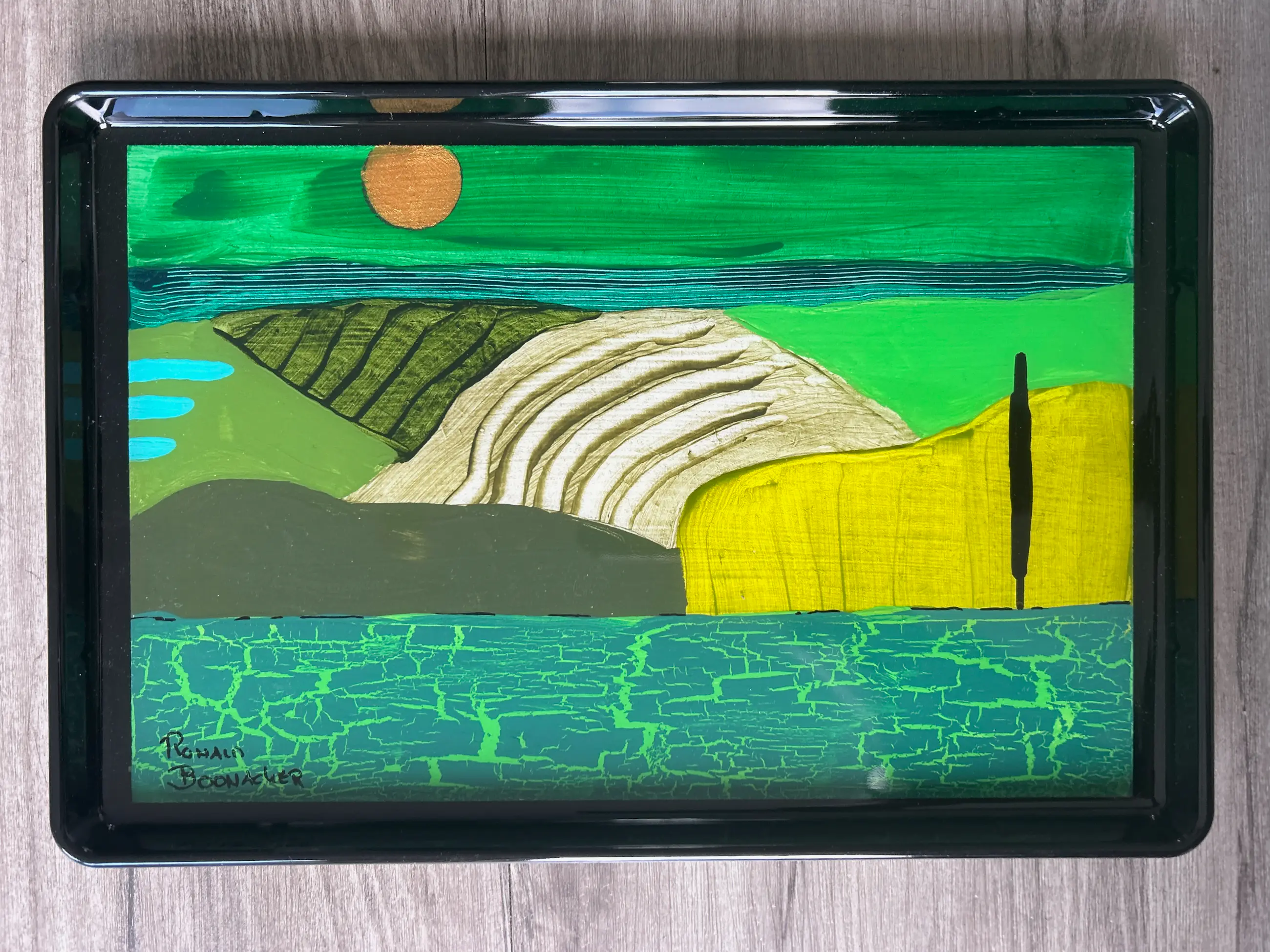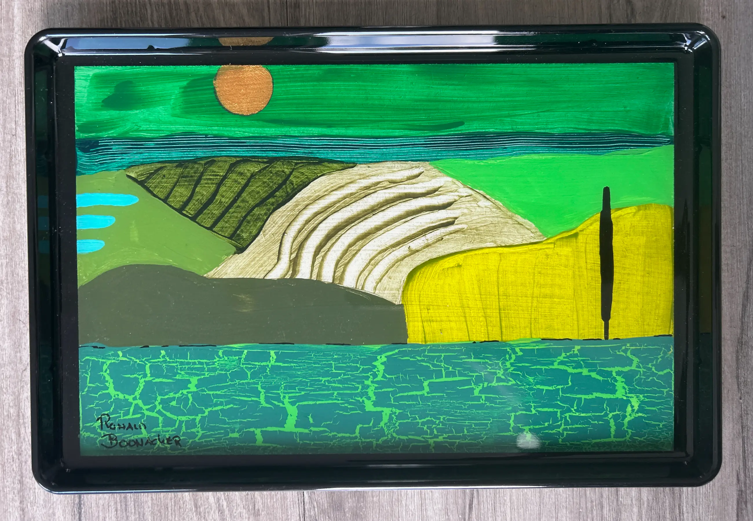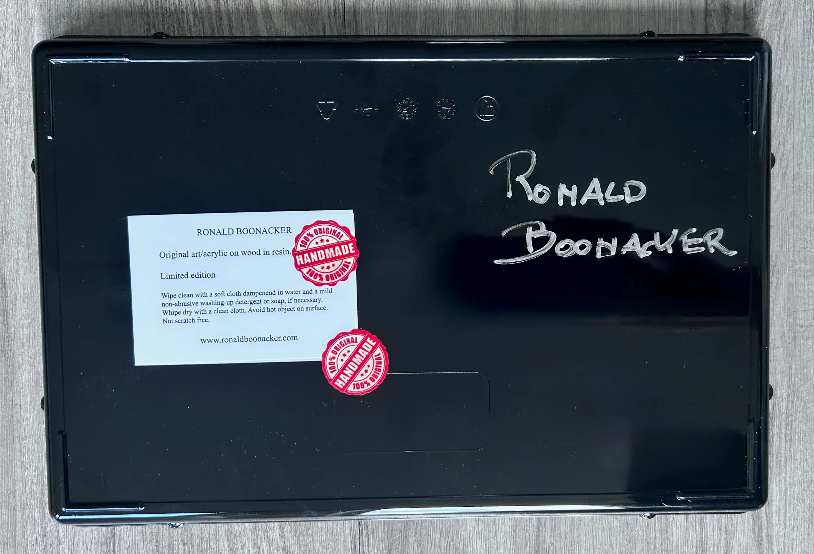 Conditie: uitstekend. Kleurrijk en Limited Edition werk van de Amsterdamse kunstenaar Ronald Boonacker. Deze schaal / dienblad heeft hij geschilderd in acrylverf en daarna overgoten met een laag epoxy. Kan dienen als dienblad / schaal maar kan ook aan de muur gehangen worden, zie laatste foto als voorbeeld.