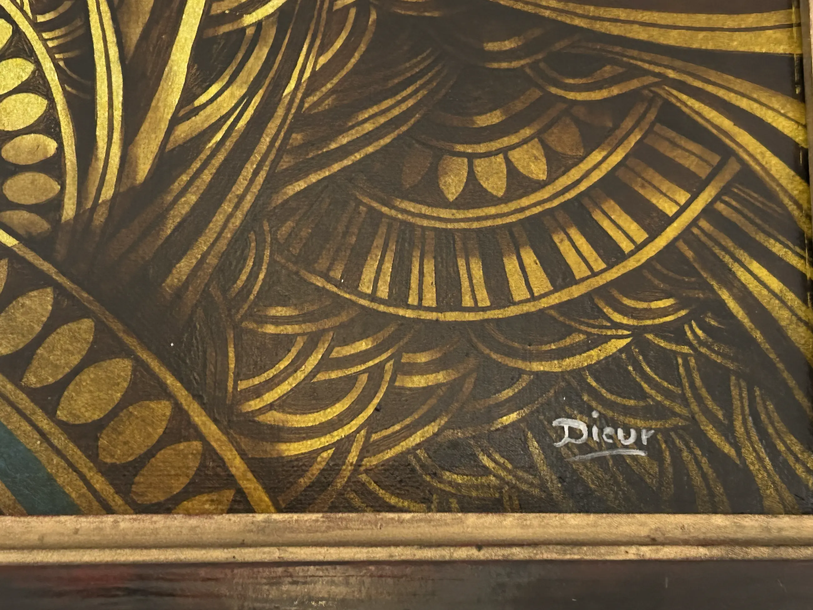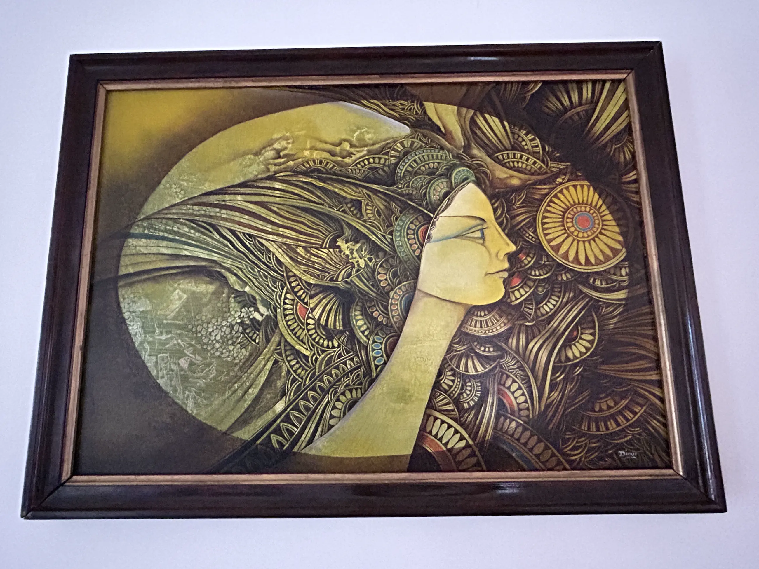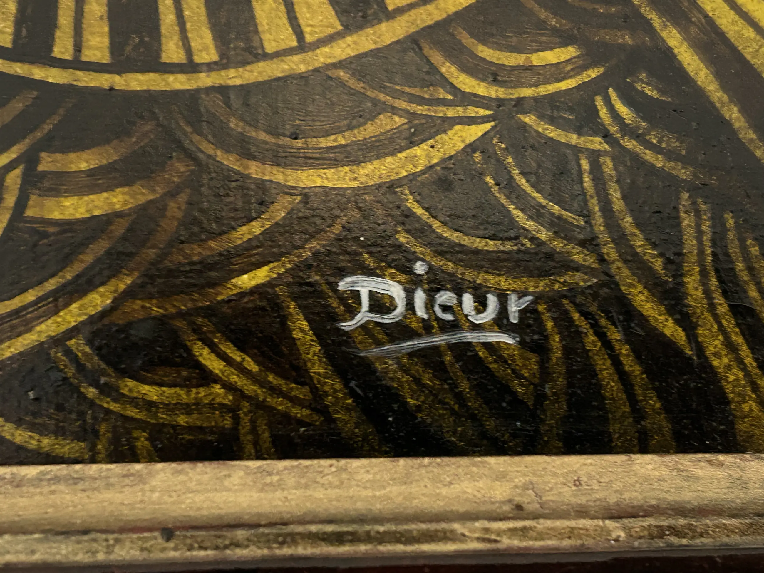 Prachtig werk van de Belgische (Wallonië) kunstenaar Ronald Dieu "Eden" Surrealistisch met neiging naar de Art Nouveau stijl. Geboren in Ghlin op 20 augustus 1945. Hoogleraar schilderkunst. Volgde de cursussen van Zéphir Busine, Gustave Camus en Edmond Dubrunfaut aan de Academie voor Schone Kunsten in Bergen.